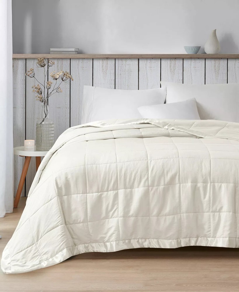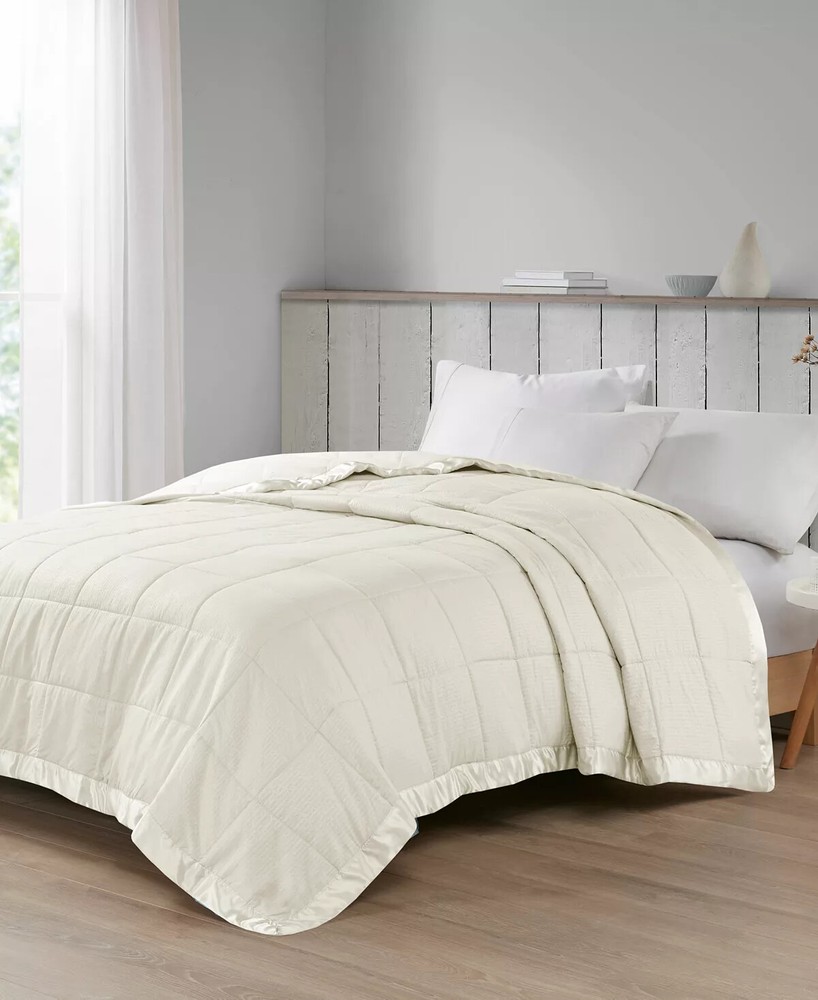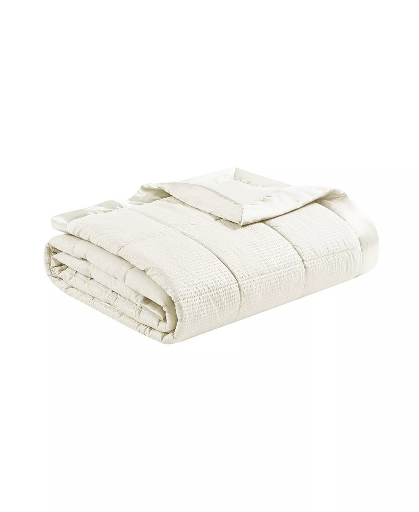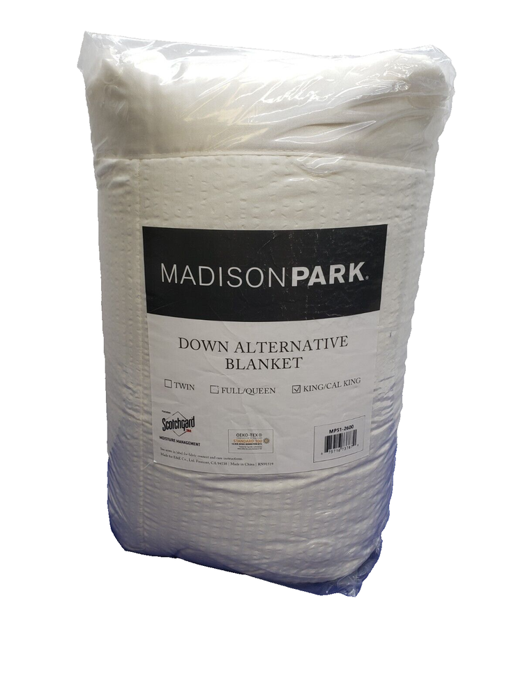 Madison Park Cambria Premium Oversized Down Alternative KING Blanket With Satin Trim Ivory The Madison Park Cambria Premium Oversized Hypoallergenic Down Alternative Blanket easily provides added warmth to your bed. This oversized blanket features an embossed texture with a 3-inch satin binding, for a comfy casual look. A 3M Scotchgard treatment on the down alternative blanket helps release stains to make cleaning easier, while prolonging the life of the fabric. This hypoallergenic blanket is also OEKO-TEX certified, meaning it does not contain any harmful substances or chemicals, ensuring quality comfort and wellness. Approx. dimensions: 108" x 96" 3M Scotchgard stain release to keep blanket last longer Oversized for better coverage Hypoallergenic down alternative filling Embossed texture with 3" satin binding Polyester Machine washable Imported