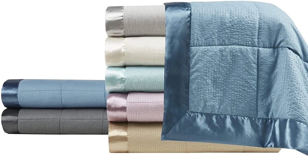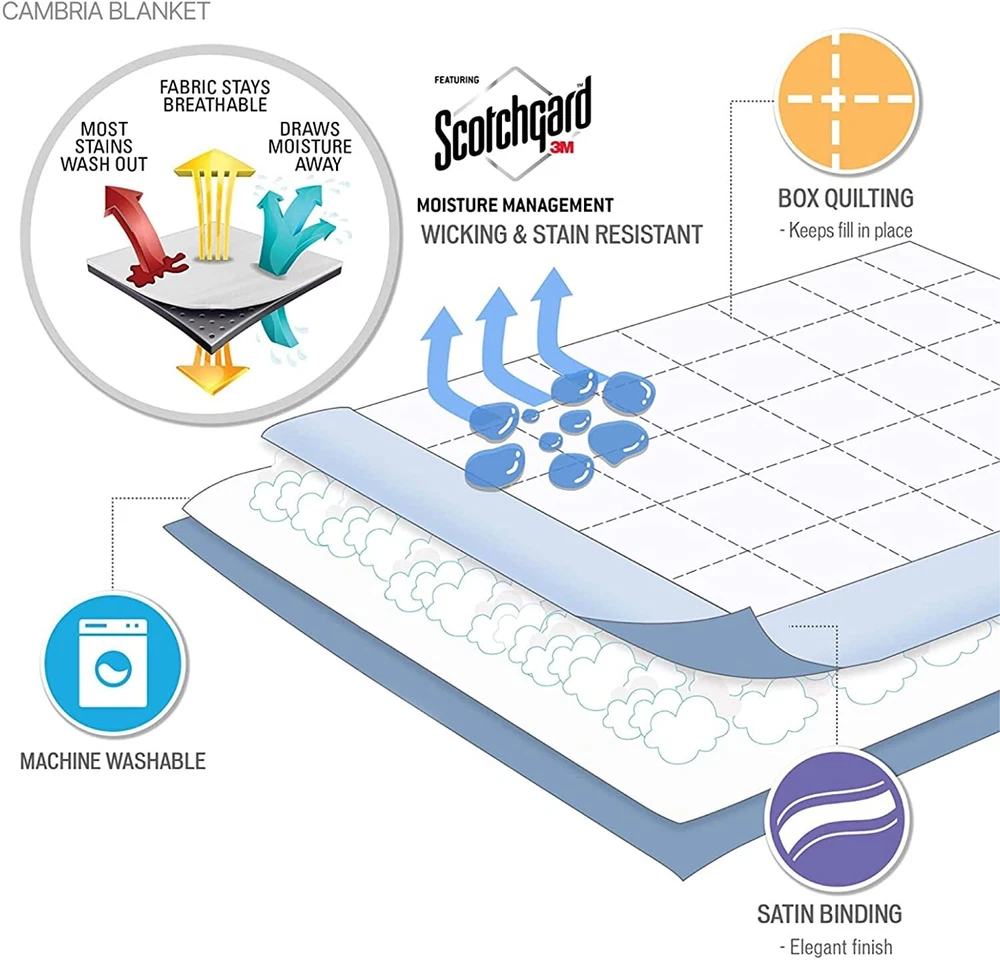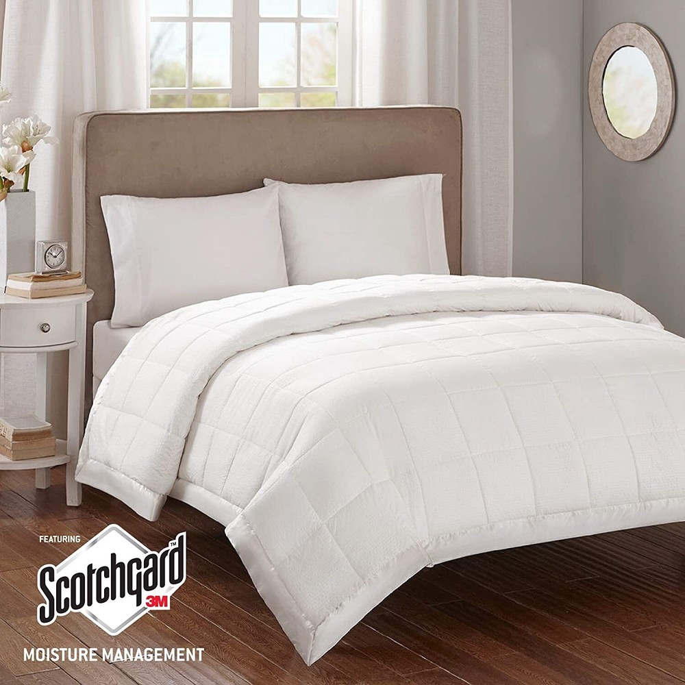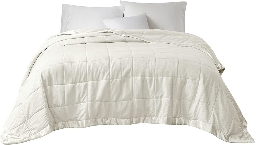 Cambria Down Alternative Blanket Madison Park New 100% Polyester Color: Ivory This is a premium oversized down alternative blanket featuring 3M Scotch Gard treatment. The 3M treatment repels stains, keeping your blanket looking newer longer. The blanket features end to end box quilting to prevent the fill from shifting, providing an even distribution of warmth. Size: Oversized King: 108"X96" MATERIAL- Face: solid embossed seersucker microfiber with 3M Scotch Gard repel & release treatment, 100% polyester. Reverse: solid micro fiber with 3M Scotch Gard repel & release treatment, 100% polyester. 3" binding: 100% polyester satin. Filling: 100% polyester brushed fiber, end to end box quilting EASY CARE - Machine wash cold on gentle cycle, tumble dry on low heat, do not bleach. Make sure there is enough space for full movement in the machines MSRP: $62