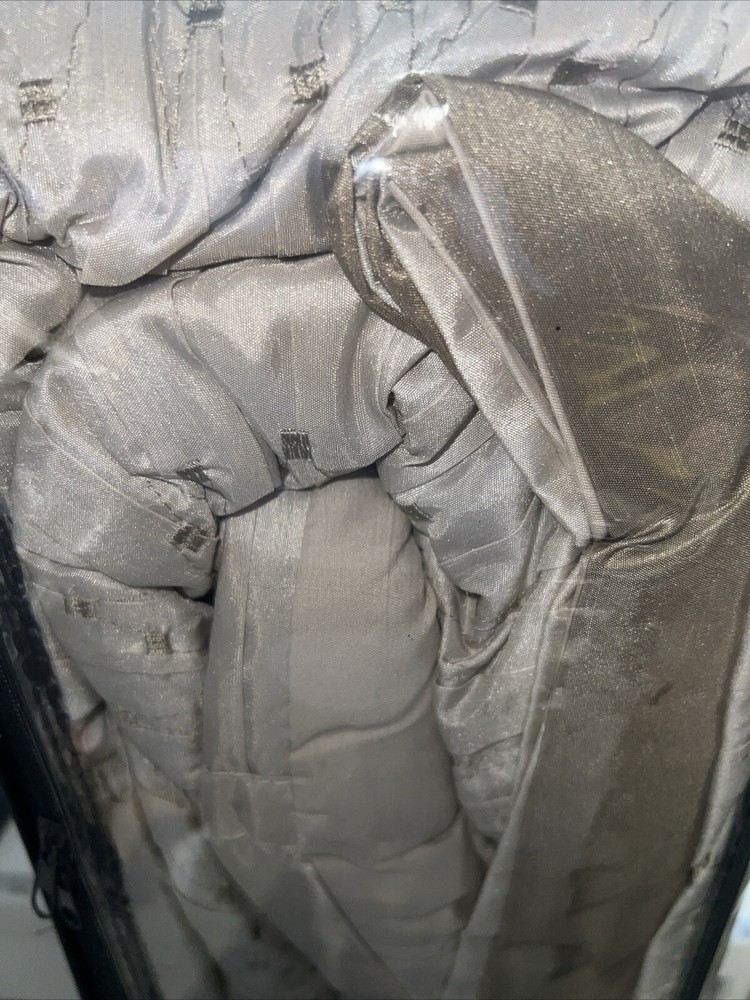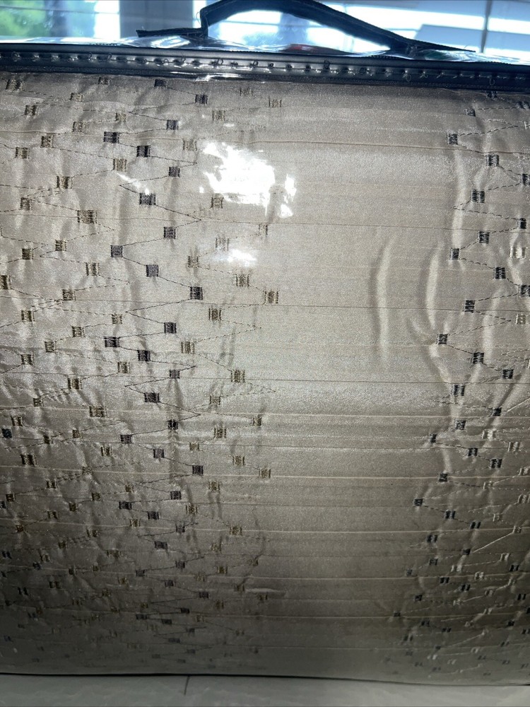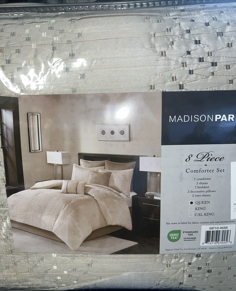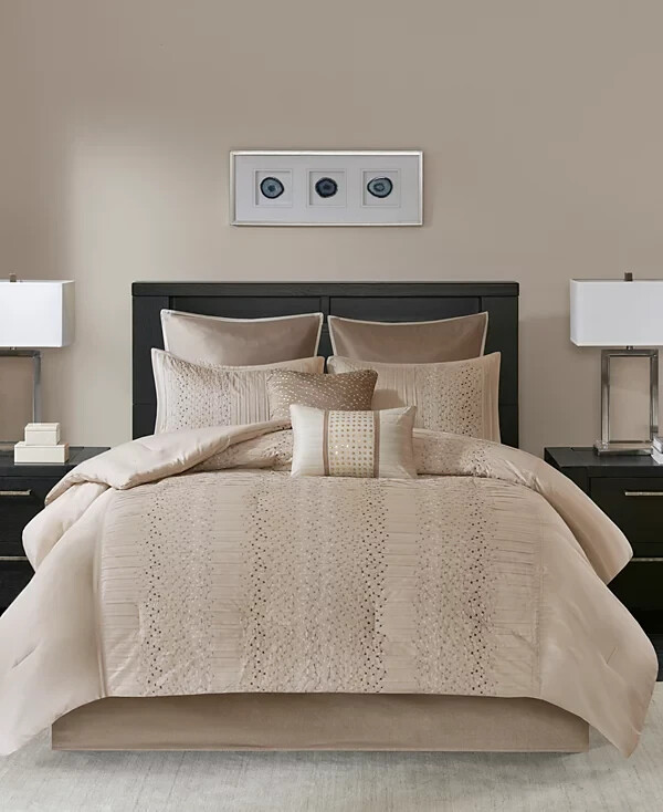 Update your bedroom with the Camelia comforter set from Madison Park. The faux silk pieced comforter and shams flaunt a geometric embroidery design that adds charm and texture to the top of the bed. The set is completed by two European shams, two decorative pillows, and a coordinating bedskirt. Set includes: comforter (90" x 90"), two standard shams (20" x 26"), bedskirt (60" x 80" + 15"), two decorative pillows (18" x 18", 12" x 18") and two European shams (26" x 26") Pinch pleat design Solid pattern Asian American & Pacific Islander Owned, Woman Owned Fabric: polyester; comforter/pillow fill: polyester 85 GSM Machine washable. Spot clean pillows. Imported Item may be shipped in a compression bag with tags.