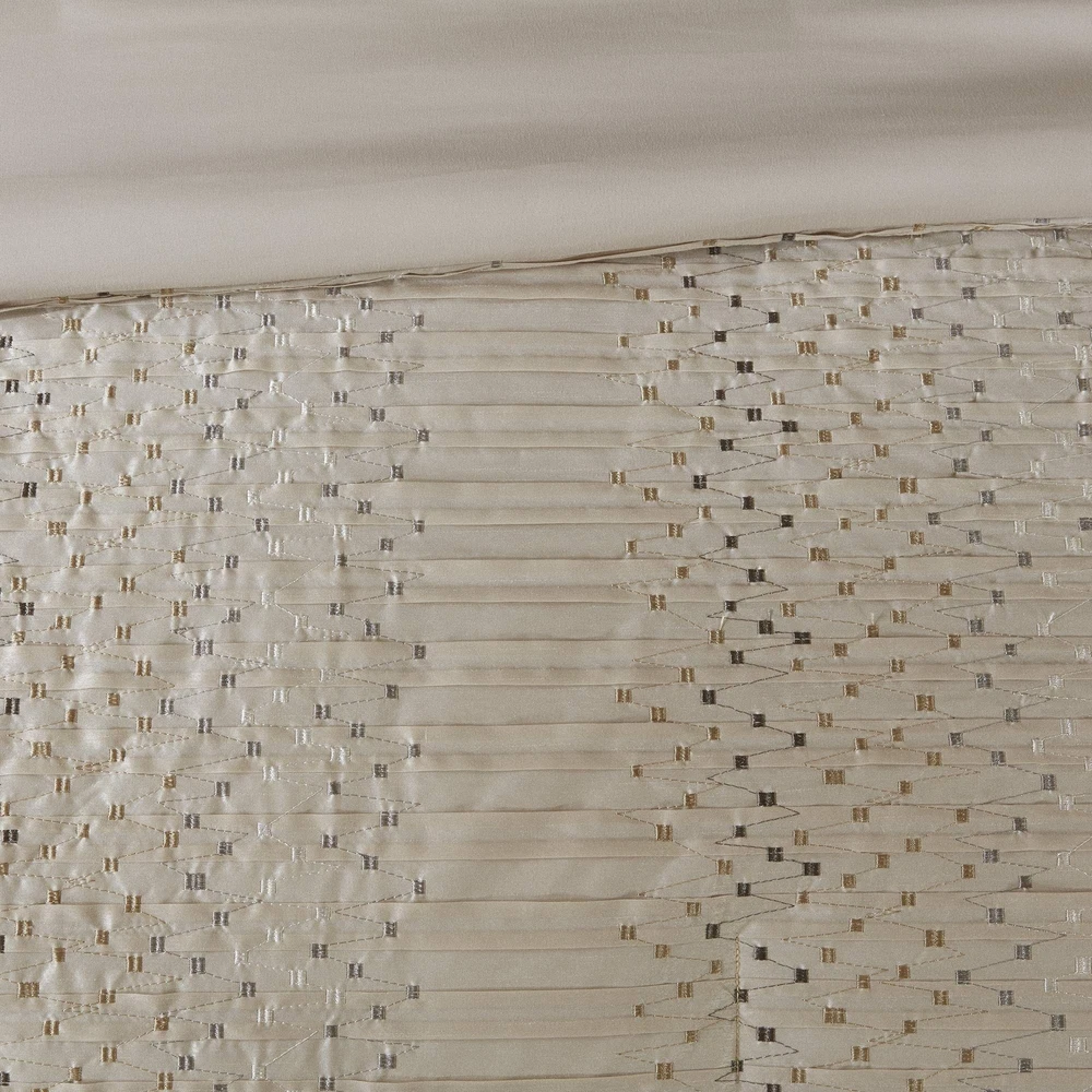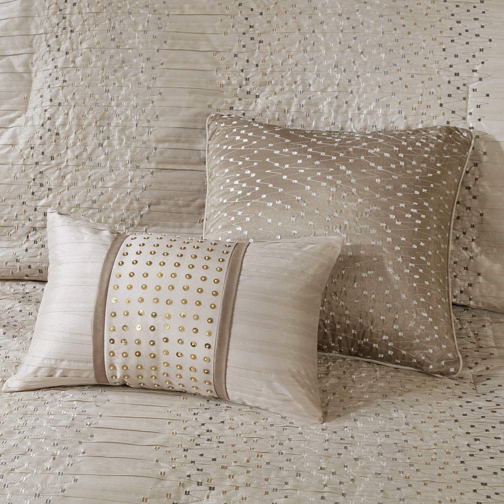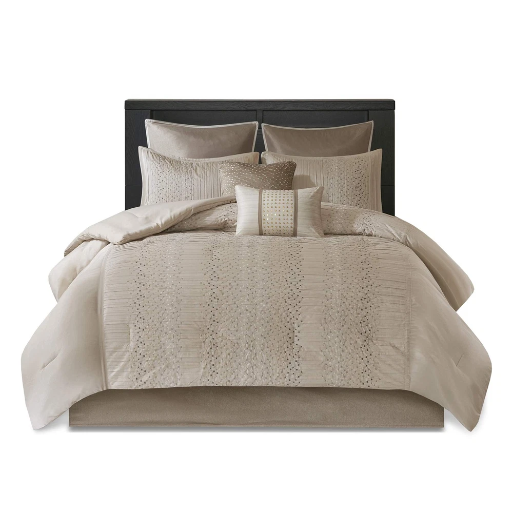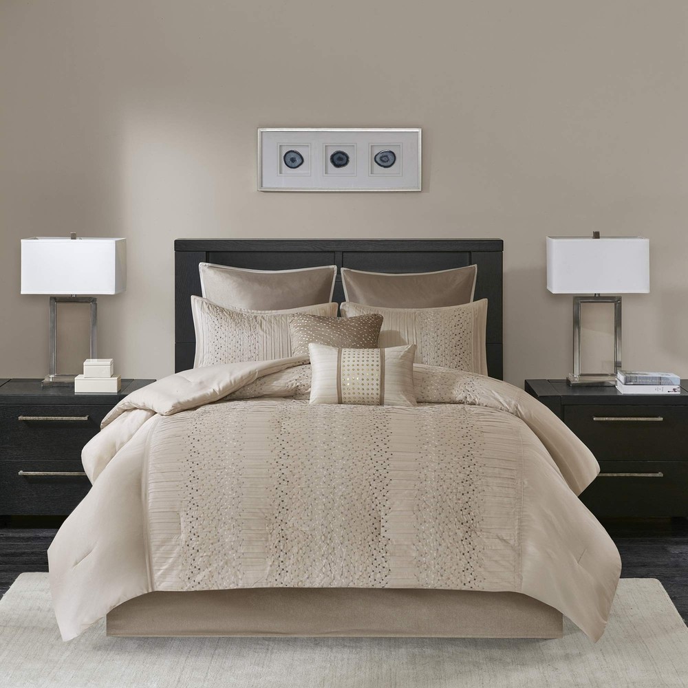 Madison Park Camelia Cozy Comforter Set-Trendy Design All Season Down Alternative Luxury Bedding with Matching Shams, Decorative Pillows, California King (104 in x 92 in), Natural 8 Piece Update your bedroom with the Madison Park Camelia 8 Piece Embroidered Comforter Set. The faux silk pieced comforter and shams flaunt a geometric embroidery design that adds charm and texture to the top of the bed. Two polyoni Euro shams provide a rich color to the bedding set, while a coordinating bed skirt offers a clean and crisp finish. Decorative pillows feature embroidered details that help complete the ensemble. Product Features Color: Camelia Natural Size: Cal King (104 in x 92 in) Brand: Madison Park MPN: MP10-4690 UPC: 675716979270 EAN: 0675716979270 100% Polyester Imported Faux Silk pieced comforter and shams 8oz/sq yard polyester filling comforter Faux silk skirt 2 polyoni euro shams Bedskirt with 15"drop Polyester faux silk, pieced, 8oz/sq yard polyester filling, bedskirt with 15"drop 1 Comforter:104"W x 92"L 2 King Shams:20"W x 36"L + 1"D (2) 1 Bedskirt:72"W x 84"L + 15"D 2 Decorative Pillows:18"W x 18"L/12"W x 18"L 2 Euro Shams:26"W x 26"L + 0.5"D (2) Machine Washable, Spot Clean Pillows Open Box Condition Notice: Items are in perfect working condition. Items may have some minor signs of use, and the original protective wrapping may be absent or the item may be repackaged. All accessories will be included. Return Policy: You may return any item purchased within 30 days of receiving the shipment.
