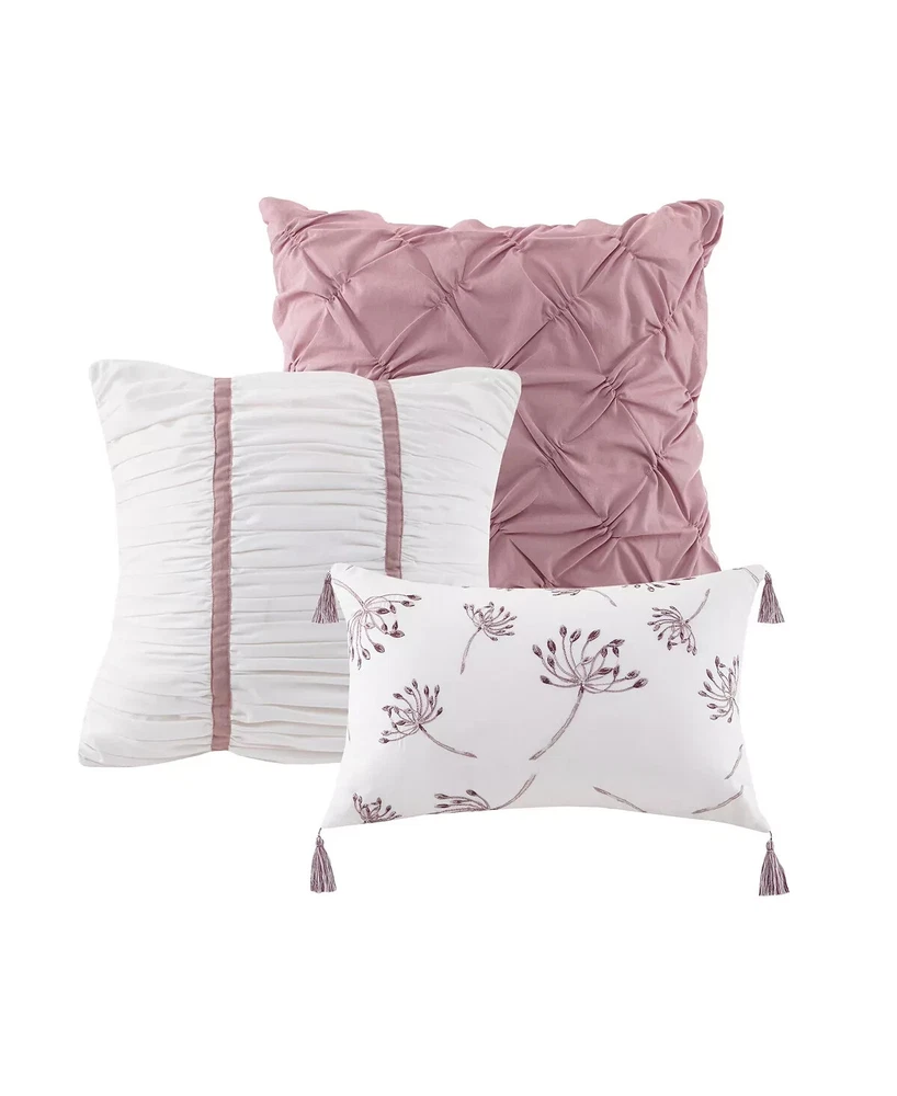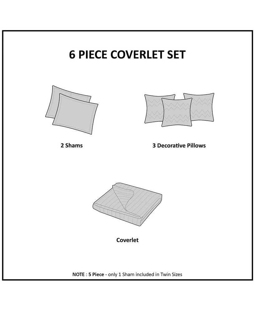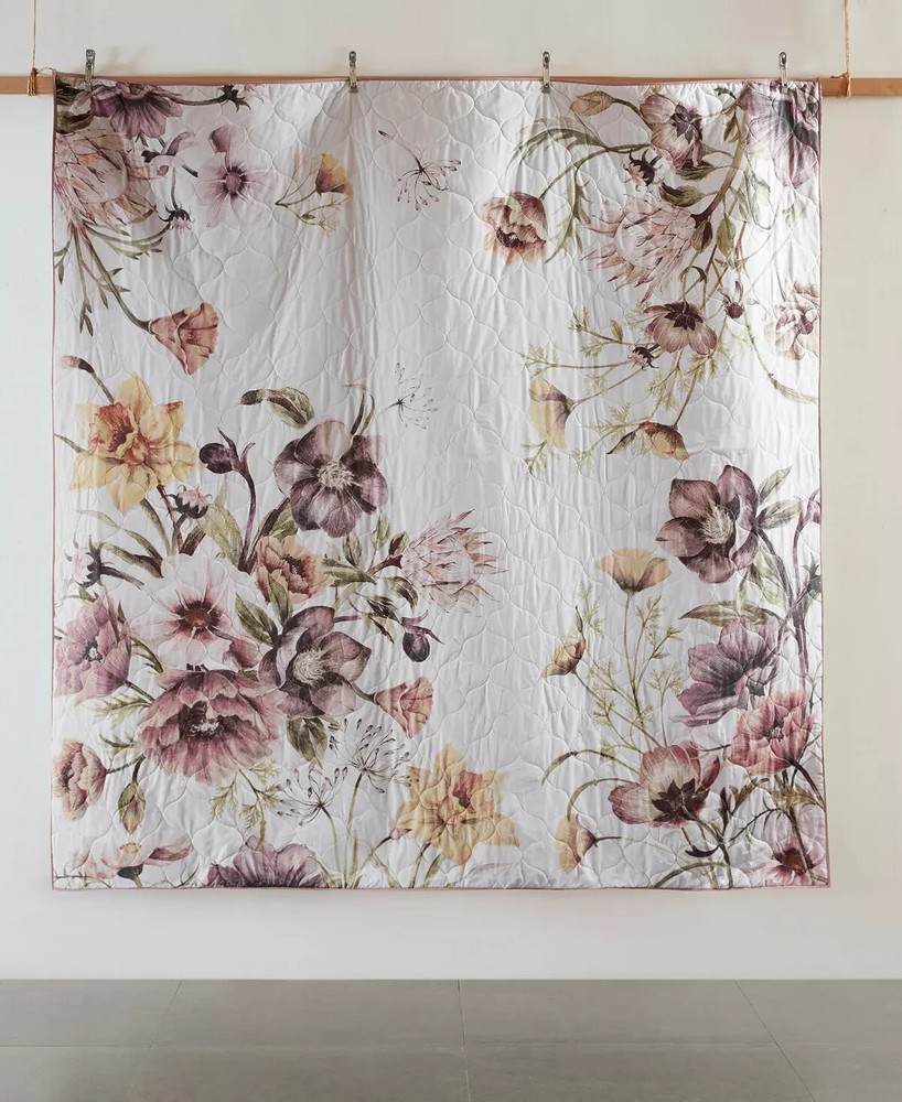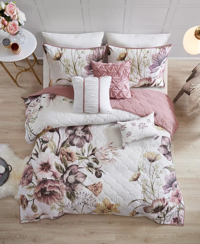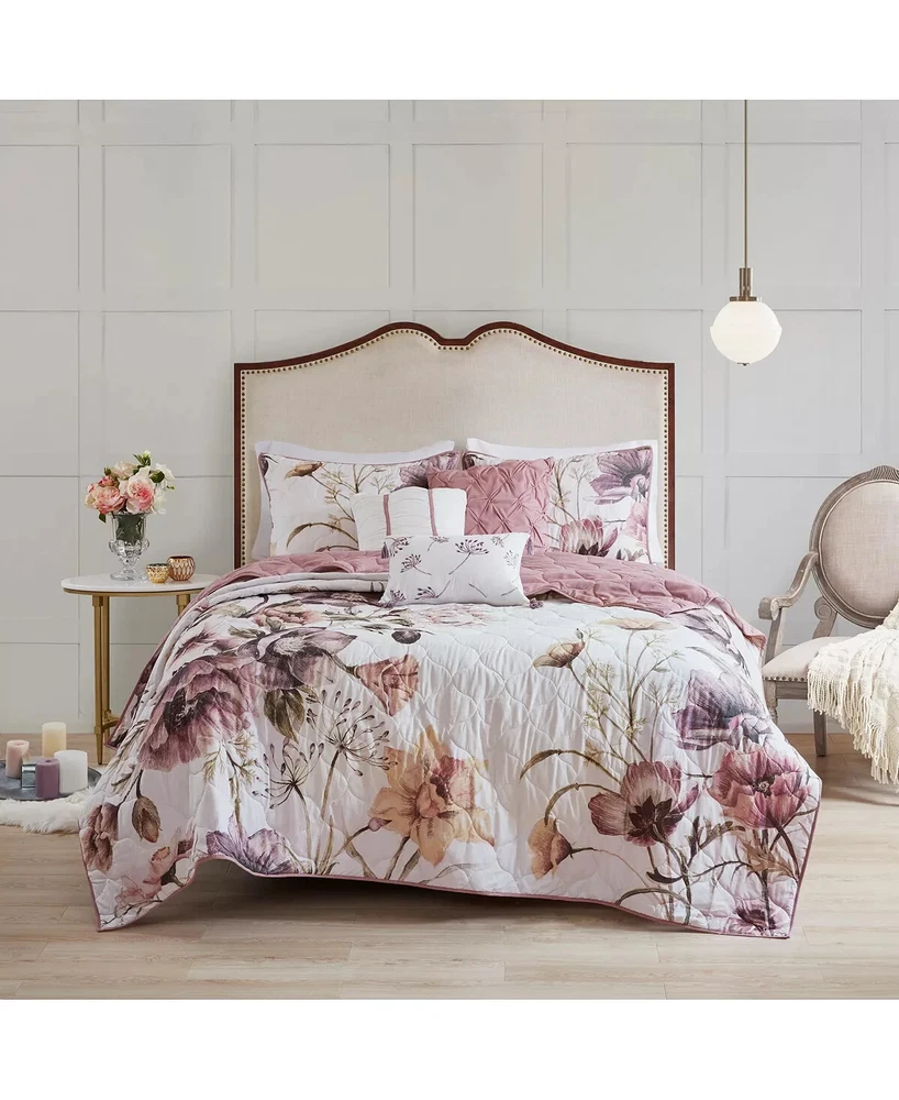 Pre-Owned - Smells as though it has been laundered Color: White / Pink Multicolor Size: King / California King Material: 100% Cotton Percale The Madison Park Cassandra 6 Floral Print Reversible Cotton Quilted Coverlet Set offers a beautiful shabby chic update to your bedroom. With a soft and romantic color combination, this cotton quilted coverlet set softens the look of your bedroom. Dimensions: Coverlet: 104" x 94", 2 King Shams: 20" x 36", 3 Decorative Pillows: 18" x 18"/12" x 18"/16" x 16" Set includes: Coverlet, 2 King Shams, 3 Decorative Pillows Hypoallergenic polyester filling in the coverlet and decorative pillows provides exceptional warmth and comfort. Coverlet/sham: cotton face, cotton/polyester back, polyester/cotton filling; Decorative pillow: polyester/cotton cover with polyester filling Machine washable Imported