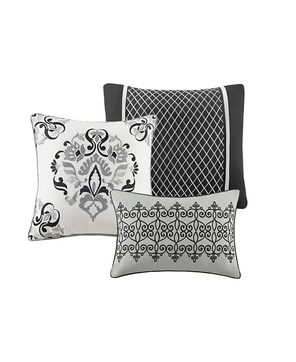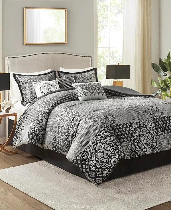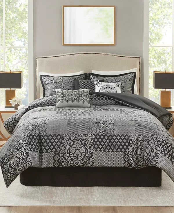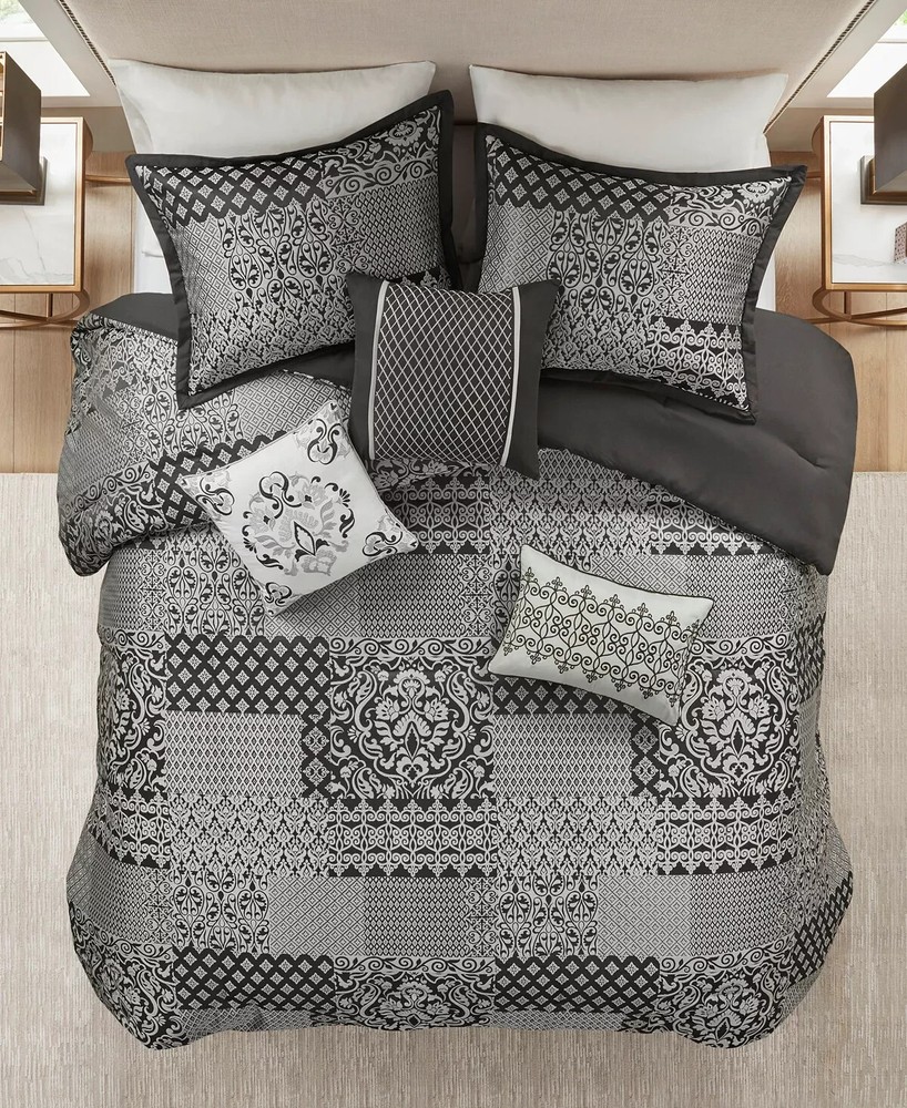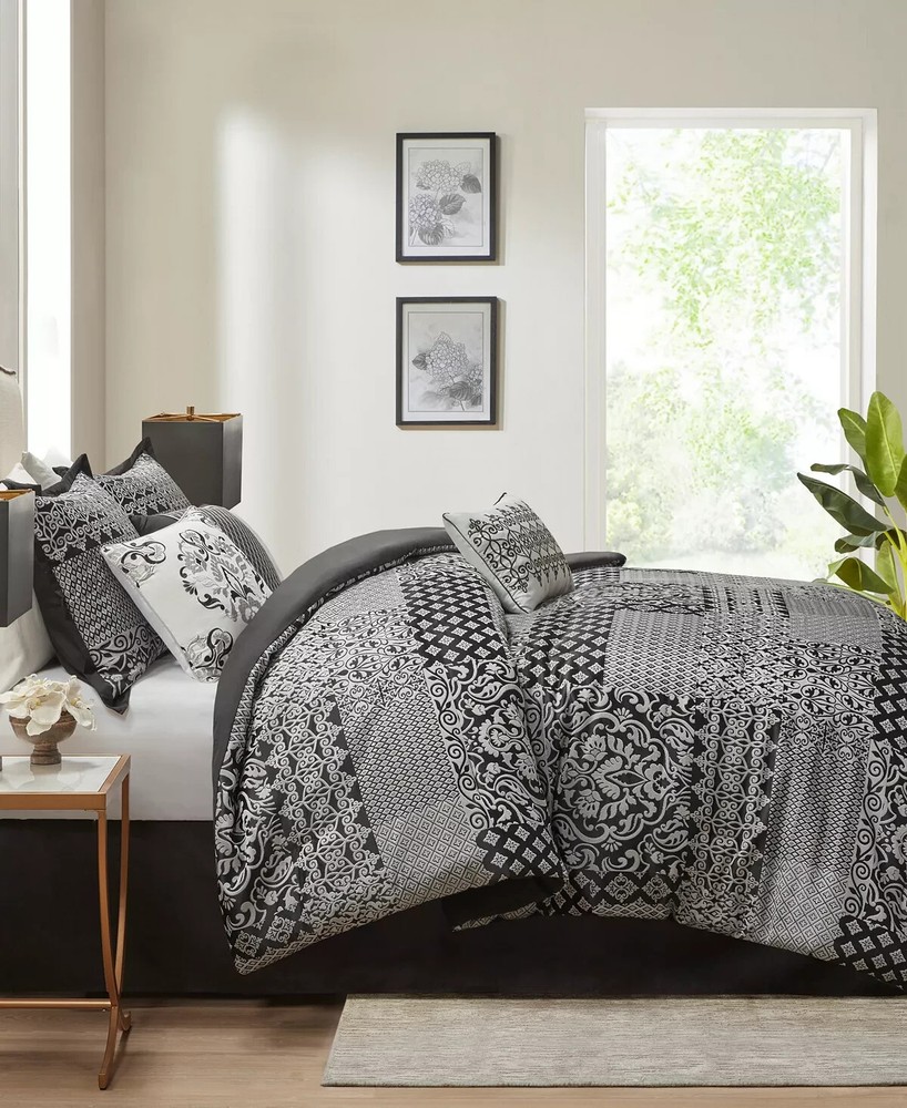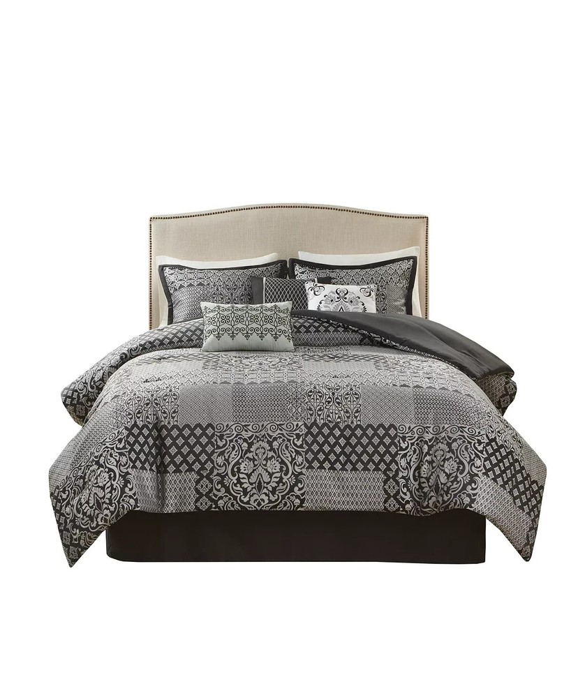 * Item info - Repackaged. Original packaging is lost, but some of the internal packaging is still there. (See pillows). I took a photo before and after I cut the ceiled plastic to inspect the new shams and skirt. Everything smells new, looks new and folds new as it appears in the photo's. Elevate your bedroom with the bold elegance of the Madison Park Cassian 7 Piece Jacquard Comforter Set. This polyester jacquard comforter flaunts a medallion design on the top with a soft microfiber reverse, for a luxurious transitional look. Product size- California king Comforter dimensions- 104" W x 92" L King sham dimensions- 20" W x 36" L Bed skirt dimensions- 72" W x 84" L + 15" D Decorative pillow 1 dimensions- 16" W x 16" L Decorative pillow 2 dimensions- 12" W x 18" L Decorative pillow 3 dimensions- 18" W x 18" L Product weight- 13.68 lbs Set includes- 1 comforter, 2 king shams, 1 bed skirt, 3 decorative pillows Embroidery details on decorative pillows Asian American & Pacific Islander Owned, Woman Owned Comforter, Sham- (Face Material- Polyester Jacquard), (Reverse Material- Microfiber), Fill- Polyester, Bedskirt- (Drop Material- Microfiber) and (Platform Material- Polyester), Pillow- Polyester Machine Washable Imported * My work environment is immaculately clean. There are no pets in my work area nor anything that can damage the item you purchased. I will never ship anything damaged, dirty or with foreign smells without mentioning it in that particular listing with a discount. The bed shown in some photo's is used as a model only. It's always precleaned. *** Return Policy My simple return policy. There will be no questions asked if you choose to return any item you purchase within 30 days. Items must be returned in the same condition you received it to receive a full refund. The buyer pays for return shipping with a 15% restocking fee. Thank you *** SHIPPING I will always ship out within one business day and sometimes the same day if I have enough time. Expect one business day and also expect Friday purchases to go out Monday. Sometimes I might switch shipping at the last minute between USPS and Fedex or visa versa. * Feedback - If you feel the transaction went well then I would appreciate a positive feedback. You can expect the same from me. Thank you