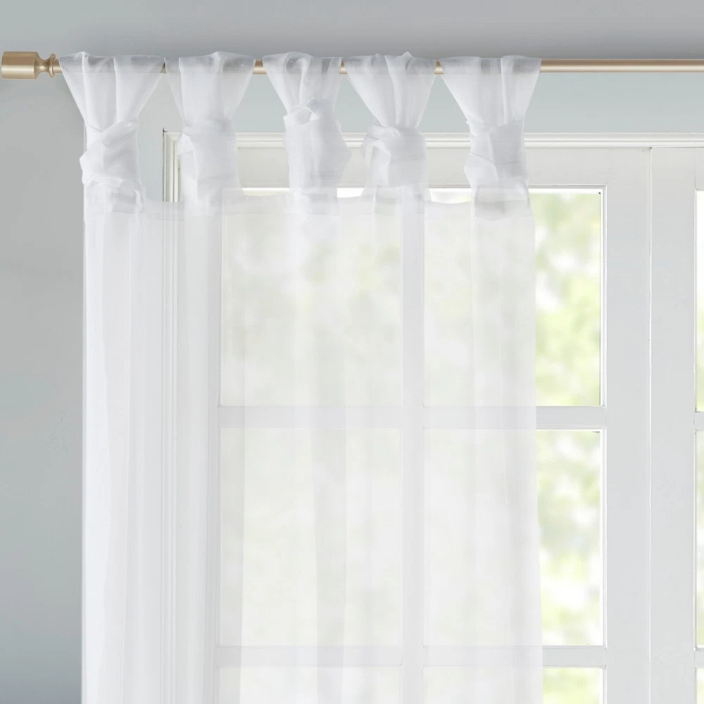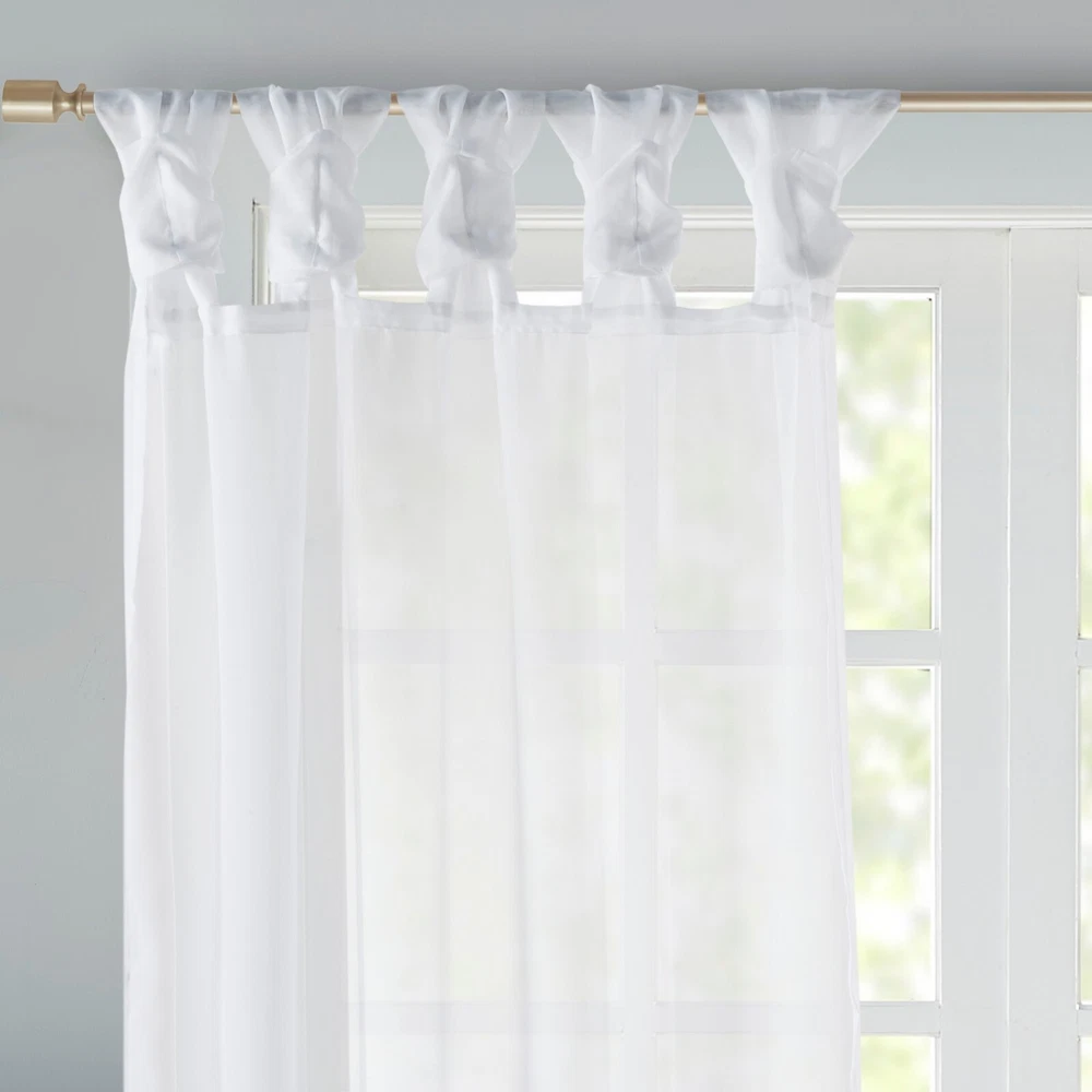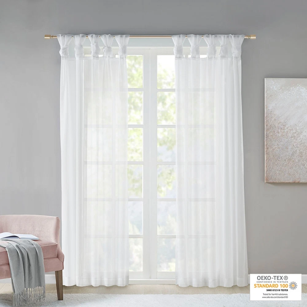 Store Categories Store Categories Bedding Comforters Decorative Pillows Duvet Covers Quilts & Coverlets Sheets Blankets & Throws Mattress Pads Pillows Home Decor Window Treatments Wall Art Home Accents Furniture Beds Dining Seating Ottomans & Benches Accent Chairs Accent Tables Dining Tables Sofas Bath Bath Robes Shower Curtains Towels Bath Rugs Bath Accessories Apparel Pajama Sets Nightgowns Rugs Rugs & Carpets Lighting Lamp Pendant Other Product Overview Details DESCRIPTION Soften your space with the Madison Park Ceres Twisted Tab Voile Sheer Window Pair. This soft panel pair provides a simple and airy update to your decor, with its lightweight voile sheer base and delicate color palette for the perfect ethereal touch. The DIY twist tab top creates beautiful and delicate folds for a stylish decorator's touch. This window panel is also OEKO-TEX certified, meaning it does not contain any harmful substances or chemicals, ensuring quality comfort and wellness. Machine washable and easy to hang, open, and close throughout the day and fits up to a 1.25" diameter rod. This window panel pair is perfect on its own for a soft filter or layer with others for a dramatic effect. FEATURES • Twisted tab DIY top finish window curtain pair • Light weight solid voile sheer home décor • Set of 2, each panel measures 50" wide • Use it alone or pair with another curtain panels • Oeko-Tex Certified, includes no harmful substances or chemicals • Machine washable MATERIAL 100% Polyester CARE INSTRUCTIONS Machine Washable Available Sizes (In Inches) 63" Panel Size: Includes 2 Window Sheers measuring 50"W x 63"L. 84" Panel Size: Includes 2 Window Sheers measuring 50"W x 84"L. 95" Panel Size: Includes 2 Window Sheers measuring 50"W x 95"L. Bedding Comforters Decorative Pillows Duvet Covers Quilts & Coverlets Sheets Blankets & Throws Mattress Pads Pillows Home Decor Window Treatments Wall Art Home Accents Furniture Beds Dining Seating Ottomans & Benches Accent Chairs Accent Tables Dining Tables Sofas Bath Bath Robes Shower Curtains Towels Bath Rugs Bath Accessories Rugs Rugs & Carpets Lighting Lamp Pendant Product Overview Product Details DESCRIPTION Soften your space with the Madison Park Ceres Twisted Tab Voile Sheer Window Pair. This soft panel pair provides a simple and airy update to your decor, with its lightweight voile sheer base and delicate color palette for the perfect ethereal touch. The DIY twist tab top creates beautiful and delicate folds for a stylish decorator's touch. This window panel is also OEKO-TEX certified, meaning it does not contain any harmful substances or chemicals, ensuring quality comfort and wellness. Machine washable and easy to hang, open, and close throughout the day and fits up to a 1.25" diameter rod. This window panel pair is perfect on its own for a soft filter or layer with others for a dramatic effect. FEATURES • Twisted tab DIY top finish window curtain pair • Light weight solid voile sheer home décor • Set of 2, each panel measures 50" wide • Use it alone or pair with another curtain panels • Oeko-Tex Certified, includes no harmful substances or chemicals • Machine washable MATERIAL 100% Polyester CARE INSTRUCTIONS Machine Washable Available Sizes (In Inches) 63" Panel Size: Includes 2 Window Sheers measuring 50"W x 63"L. 84" Panel Size: Includes 2 Window Sheers measuring 50"W x 84"L. 95" Panel Size: Includes 2 Window Sheers measuring 50"W x 95"L.