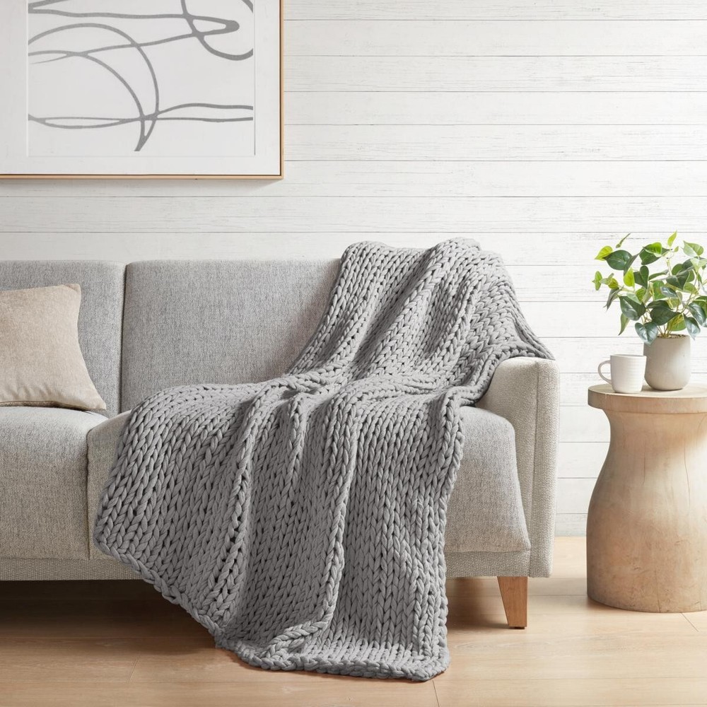 BRAND NEW STILL IN THE ORIGINAL BOX. COLOR GRAY RETAIL IS $140 GUARANTEED AUTHENTIC SEALED Get warm and cozy with the Madison Park Chunky Double Knit Handmade Throw. This handmade GRAY chunky cable knit throw is double-knitted for durability and an incredible soft-hand feel. The hand-knit throw has a lovely ribbon tied around it, making it a thoughtful gift. Soft and cozy, this handmade knit throw is perfect to snuggle up in and offers a shabby chic addition to your home. Spot clean or hand wash only. Dimensions: 1 Throw: 50 in W x 60 in L • Comfy hand-knit throw • Double knitted for durability • Soft hand feel • Giftable - Ribbon tied for easy gifting