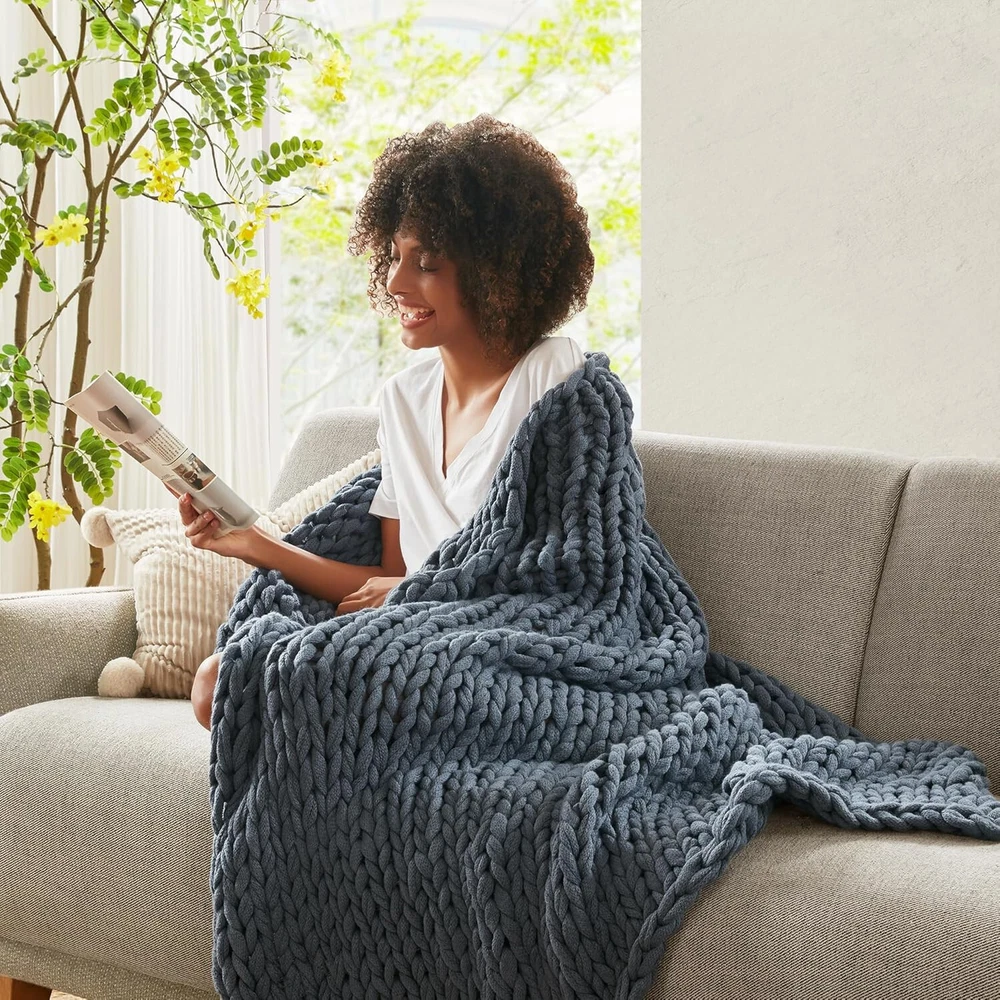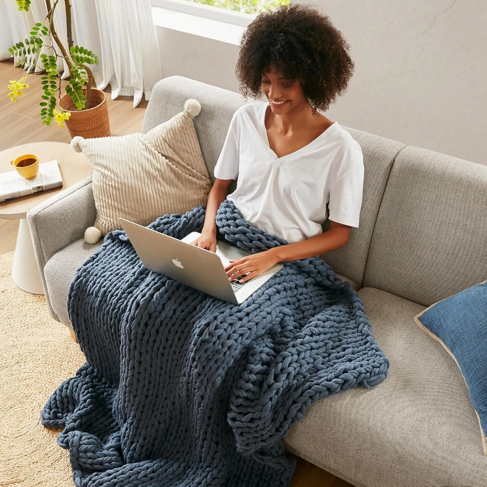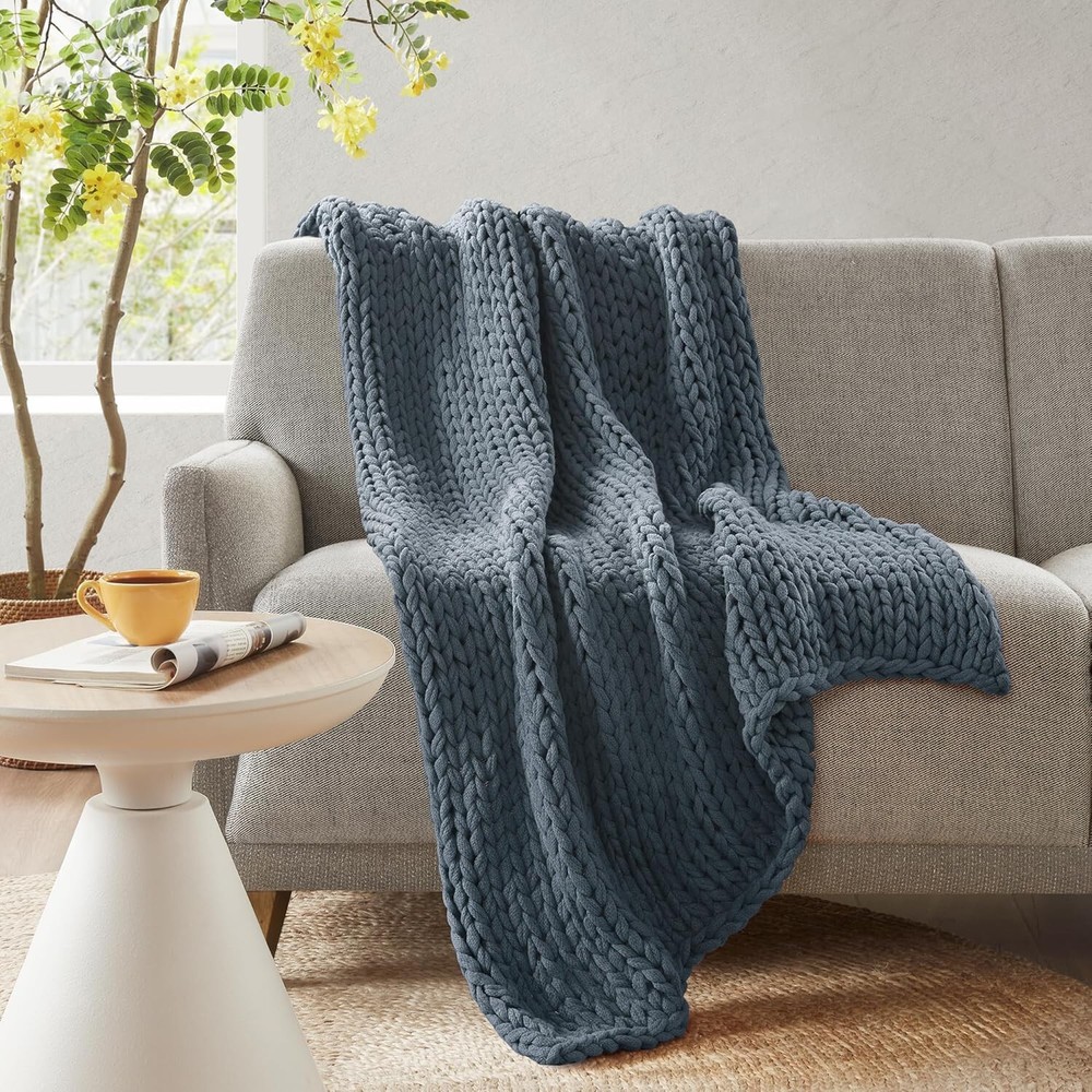 Madison Park Chunky-Knit Handmade Throw - 50" x 60", Solid Indigo Product Details: Brand: Madison Park Material: Soft Acrylic Color: Solid Indigo Size: 50" x 60" Pattern: Chunky-Knit Features: Lightweight, Breathable, Handmade Care Instructions: Dry Clean or Spot Clean Description: Wrap yourself in the cozy embrace of the Madison Park Chunky-Knit Handmade Throw, a perfect blend of style and comfort for any room in your home. Crafted from soft acrylic, this throw blanket boasts a plush, lightweight texture that's ideal for all-season use. Its rectangular shape, measuring 50 x 60 inches, is generously sized to drape beautifully over furniture or snuggle up in bed. The throw's solid indigo hue adds a touch of serene blue to your space, complementing a cottage-inspired decor with ease. Carefully handmade with a thread count of 200 or less, it ensures breathability and ease of maintenance, requiring only dry or spot cleaning. This versatile and gift-ready piece is a timeless addition to your living room, bedroom, or office, enhancing your comfort without the fuss of closures or complicated care instructions.