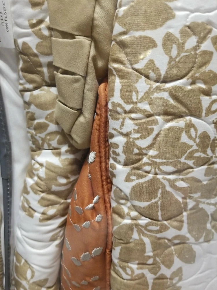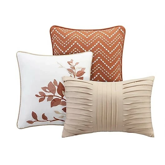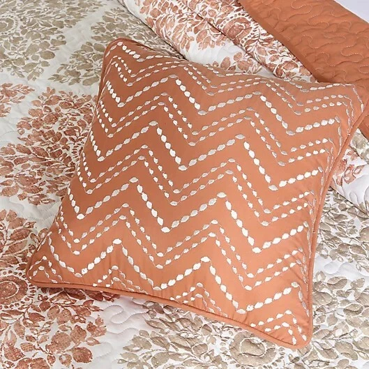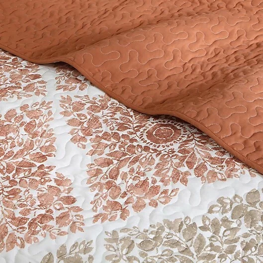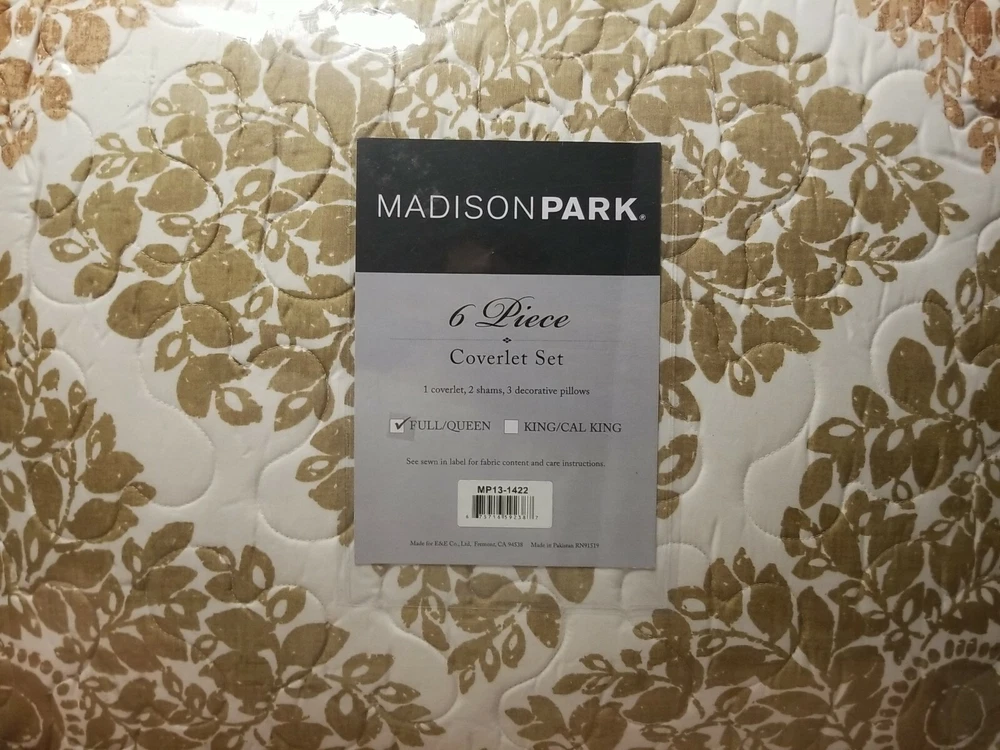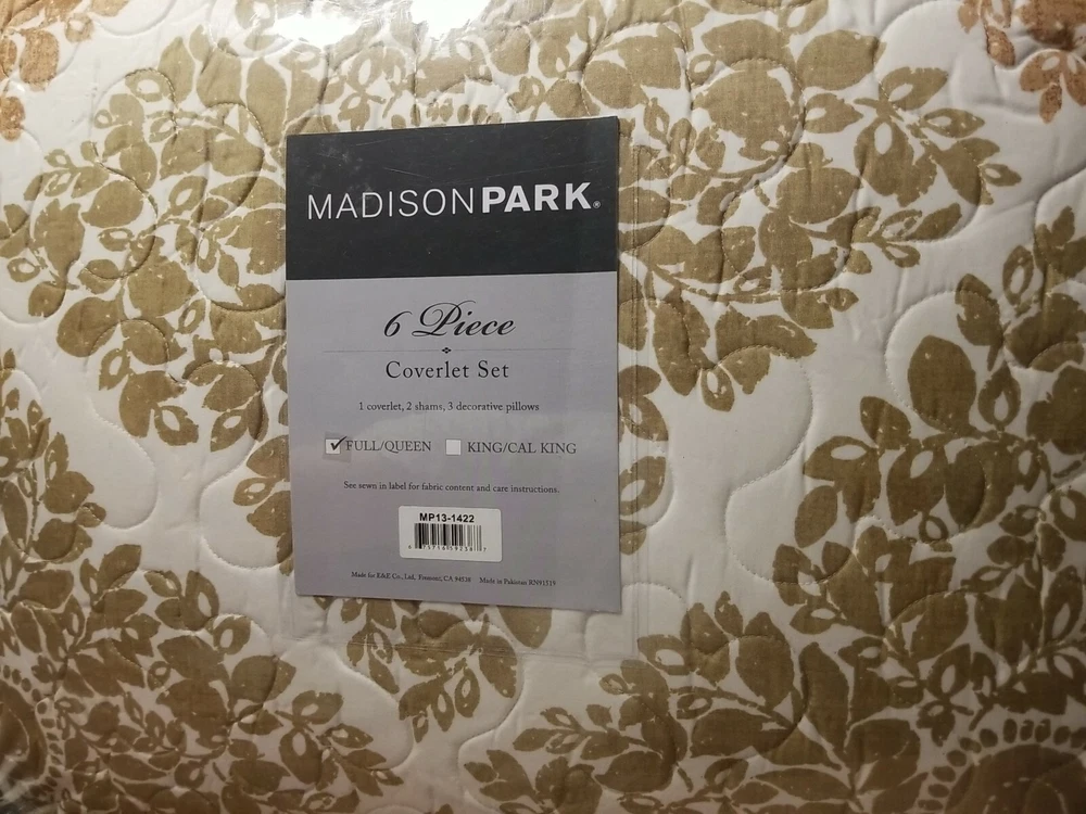 Madison Park Claire 6 Piece Reversible Coverlet Set, Full / Queen MP13-1422. Spruce up your space with the Madison Park Claire 6 Piece Reversible Coverlet Set. This unique pattern has a small leaf print inside each diamond that makes up this crisscross design. Pops of taupe give the perfect amount of color to add this collection into your neutral space. Three decorative pillows use embroidery and fabric manipulation for the perfect finishing touches to this collection. Color: Spice/Red PRODUCT DETAILS Full/Queen 1 Coverlet: 90"W x 90"L 2 Standard Shams: 20"W x 26"L (2) 1 Decorative Pillow: 18"W x 18"L 1 Decorative Pillow: 16"W x 16"L 1 Decorative Pillow: 12"W x 18"L MATERIAL Coverlet/Sham: 100% polyester microfiber, printed, quilted, 100% brushed polyester reverse, 90% cotton, 10% other fiber filling Pillow: 100% polyester microfiber shell, polyester filling