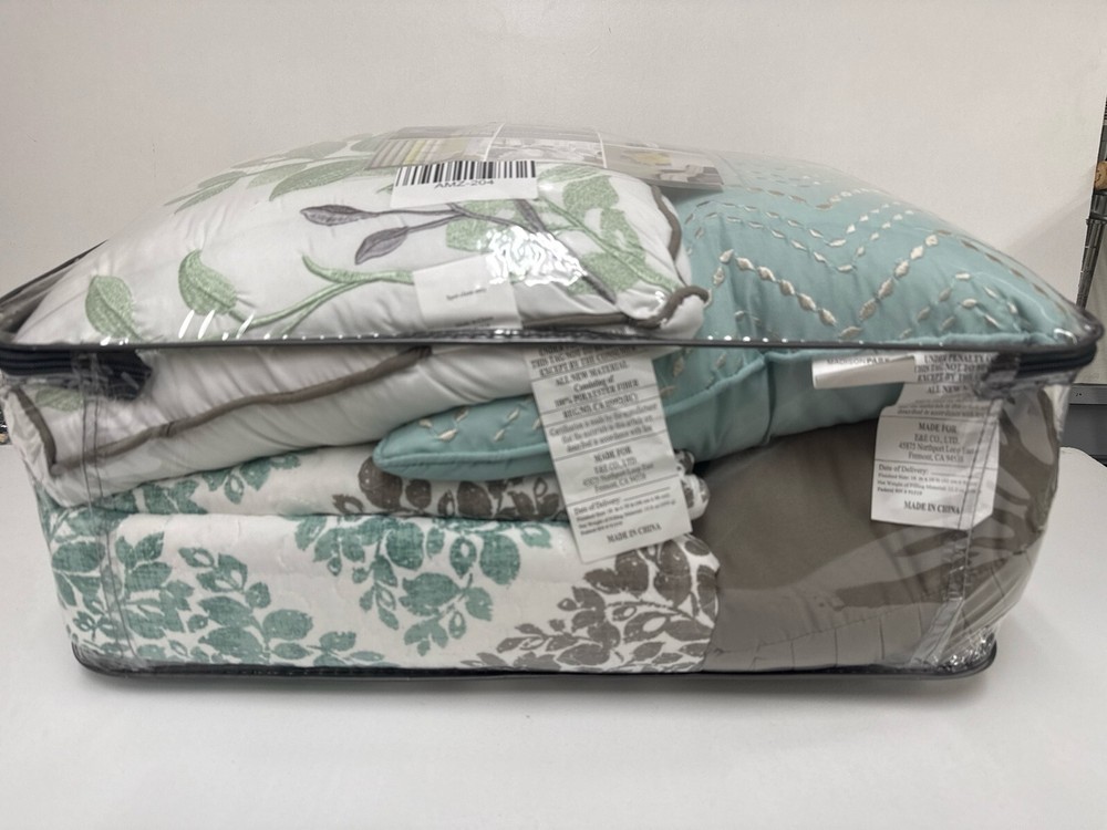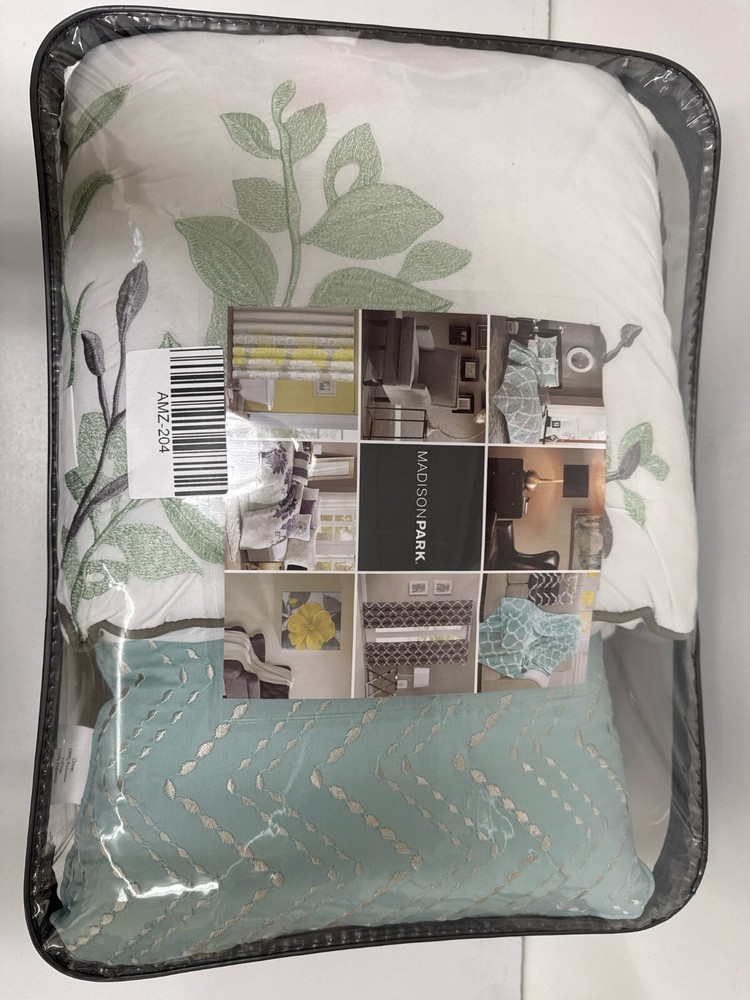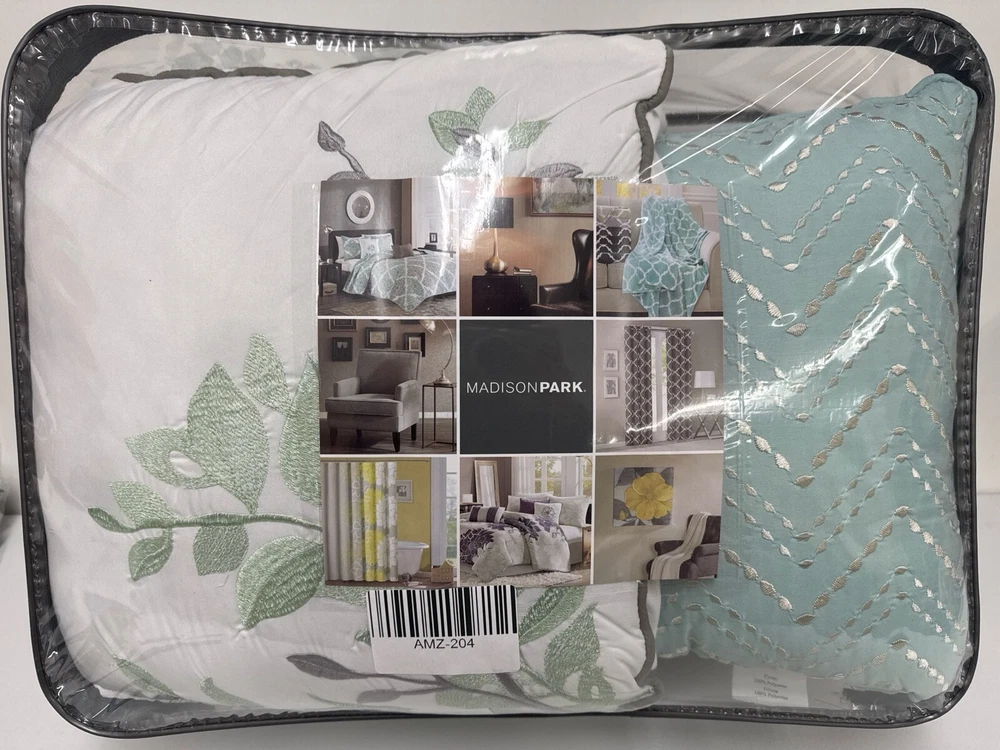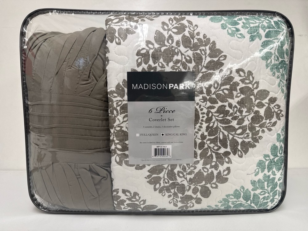 Madison Park Claire Quilt Modern Design - All Season, Breathable Coverlet Lightweight Bedding Set, Matching Shams, Decorative Pillow, King/Cal King (104 in x 94 in), Diamond Aqua 6 Piece Spruce up your space with the Madison Park Claire 6 Piece Reversible Coverlet Set. This unique pattern has a small leaf print inside each diamond that makes up this crisscross design. Pops of aqua give the perfect amount of color to add this collection into your neutral space. Three decorative pillows use embroidery and fabric manipulation for the perfect finishing touches to this collection. This bedding set is OEKO-TEX certified, meaning it does not contain any harmful substances or chemicals to ensure quality comfort and wellness. Items in the set may come in a rolled or compressed packaging, which will need to be fluffed up or steam ironed before use to remove wrinkles. 100% Polyester Imported Set includes: 1 coverlet, 2 King shams, 3 decorative pillows Cover: 100percent polyester filling: 90percent cotton/10percent other fiber Measurements: 104-by-94-inch coverlet, 20-by-36-inch king shams, 18-by-18-inch square pillow, 12-by-18-inch oblong pillow, 16-by-16-inch square pillow Machine washable. Do not bleach. Tumble dry low, remove promptly This unique pattern has a small leaf print inside each diamond that makes up this crisscross design