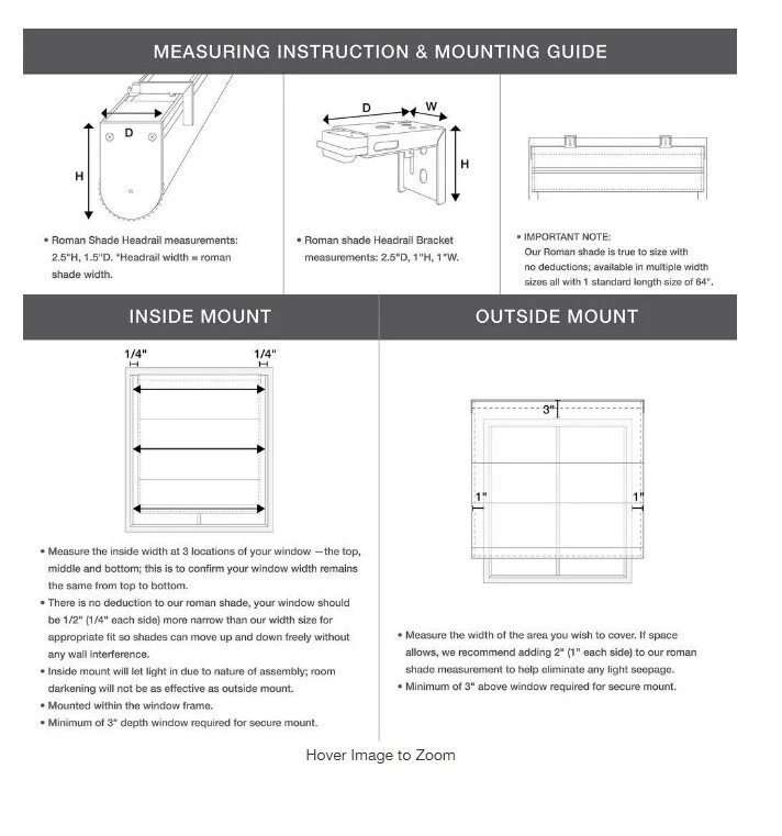 NEW UNUSED FAST SHIPPING # 314 BP NE About This Product The Madison Park Colm Basket Weave Room Darkening Roman Shade offers a simple and convenient update to your home decor. This grey roman shade features a basket weave texture base fabric that creates a natural look and feel. Ready to install right out of the packaging, this roman shade can be hung inside or above the windowpane allowing you to find the perfect fit for your home decor. Shade measures 64 in. L and comes in 8 in. W options to suit multiple standard window sizes; each roman shade is sold as a single and comes with a printed instructional guide as well as an instructional video available on site. Assembly is required. Highlights Set includes: 1-roman shade: 23/27/29/31/33/34/35/39 in. W x 64 in. L, head rail: W = roman shade width x 1.5 in. D x 2.5 in. H, slat depth front to back: 1.5 in., recommended mounting depth: 3 in. The cordless retraction mechanism makes it easy to open and close Weighted hem to keep shade more secure and in place Top face fabric is detachable, but not fully removable True to size, the actual width of this shade is the same as ordered Inside mount: please choose 1/2" narrower than your actual window width for full coverage and minimal wall interference; minimum of 3" depth window required Outside mount: please choose size with at least 2" added onto your actual window width for maximum coverage; minimum of 3" above window required Set Includes: 1 Roman Shade:39"W x 64"L, Head Rail:39"W x 1.5"D x 2.5"H, Slat Depth - Front to Back:1.5", Recommended Mounting Depth:3" Dimensions Actual Blind/Shade Width (In.) 23 Minimum window depth required (in.) 3 in Pre-Cut or True-to-Size Blind True-to-Size Product Length (in.) 64 in Product Width (in.) 23 in Width (in) x Length (in) 23in x 64 in Details Color Family Gray Color/Finish Grey Control Type N/A Decor Type Window Treatment Enclosure Type No Enclosure Features Tool Free Installation Front Color Grey Included Installation/Mounting Hardware Lift Systems Cordless Light Control Room Darkening Material Polyester Material Polyester (100%) Mount Type Inside Mount Opening type Top down and/or bottom up Orientation Horizontal Pre-Cut Deduction (in.) 0