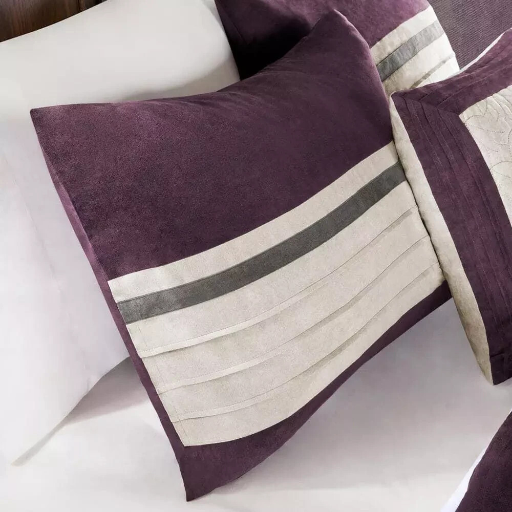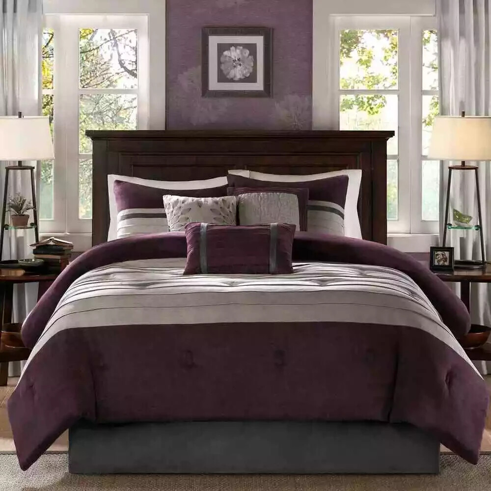 This Madison Park Comforter Set in King size features a textured polyester material in a transitional style with striped design in a plum color. The set includes a decorative pillow, comforter, and bed skirt. It is machine washable for easy care and made with polyester fill material for comfort and durability. Perfect for adding a touch of style and coziness to your bedroom.