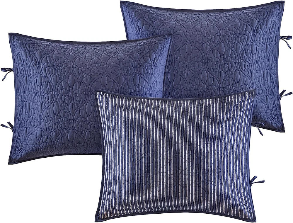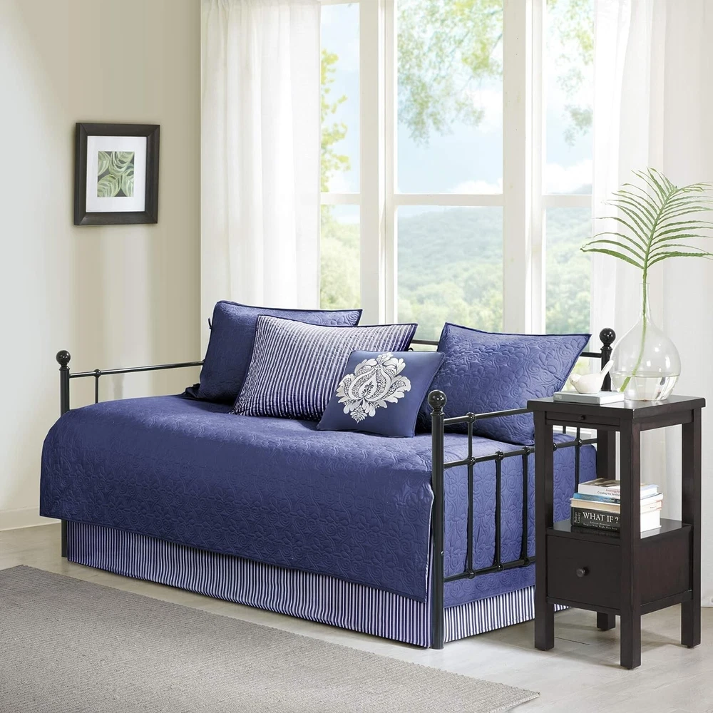 Madison Park Cotton Daybed Cover Set Quebec Navy 6 Piece NEW All Season Bedding Quoted from manufacturer's site: 100% Microfiber Face & Reverse, Filling: 90% Cotton, 10% Olefin Classic stitch pattern Reversible Set includes: daybed cover, 3 shams, bedskirt, decorative pillow Microfiber, 7oz/sq yard, 90% cotton, 10% other filling 1 Daybed Cover:75"W x 39"L 3 Standard Shams:20"W x 26"L (3) 1 Bedskirt:39"W x 75"L + 15"D 1 Decorative Pillow:18"W x 18"L machine washable, spot clean pillow Brand new with tags. The plastic zippered container has came apart at the seam but the item is still new and sealed. May show minor wear and tear from shelf storage. Shipping ** Shipping varies by location. Expedited shipping available. This covers shipping, tracking number, and packaging materials. Returns ** Returns only accepted on unopened items. There is a 20% restocking fee on all returns. Item must be returned in the same condition that it was shipped. Items will be compared for sellers marks before return is accepted. Buyer must pay return shipping cost. Sales Tax ** Ebay will charge sales tax on items as required by the state you live in.