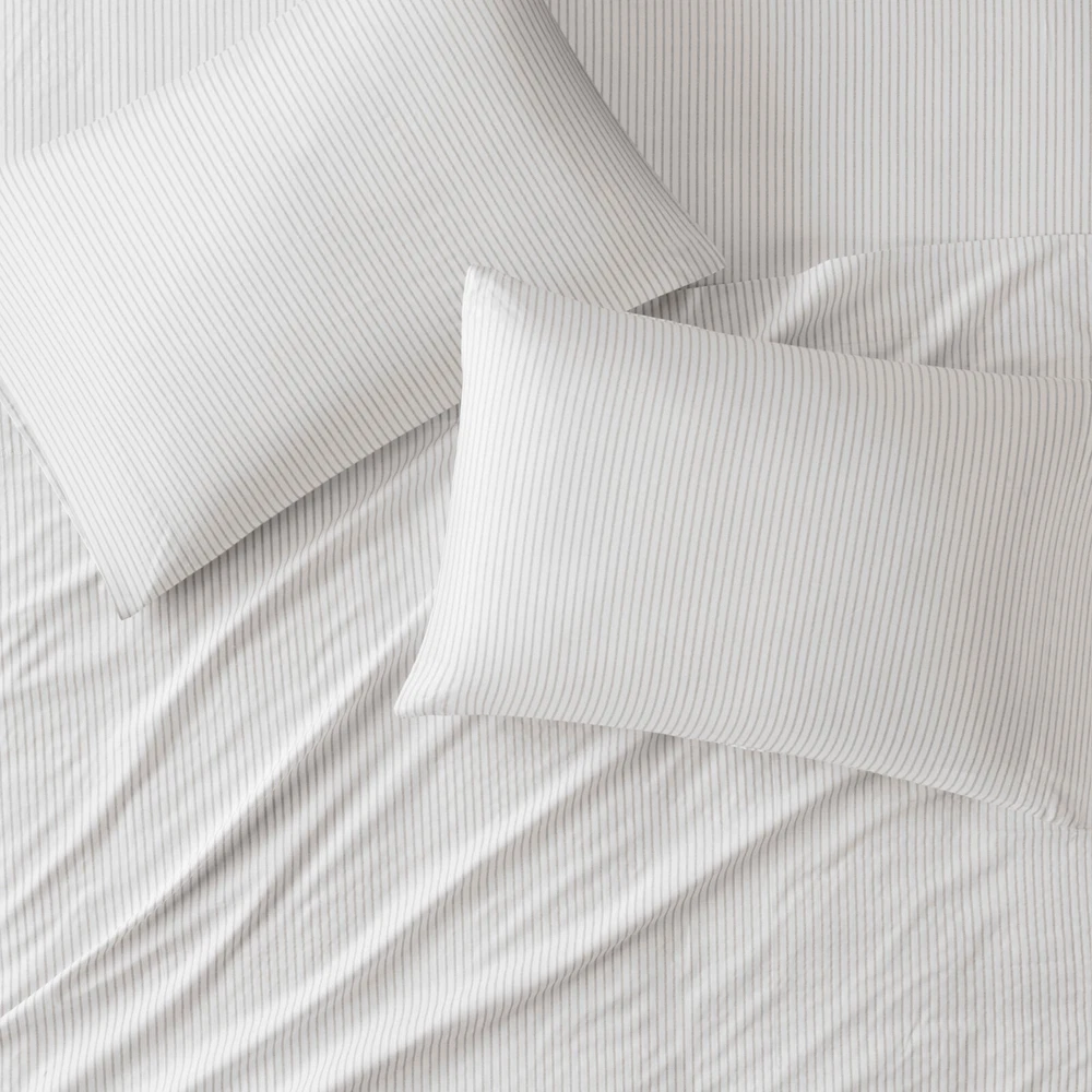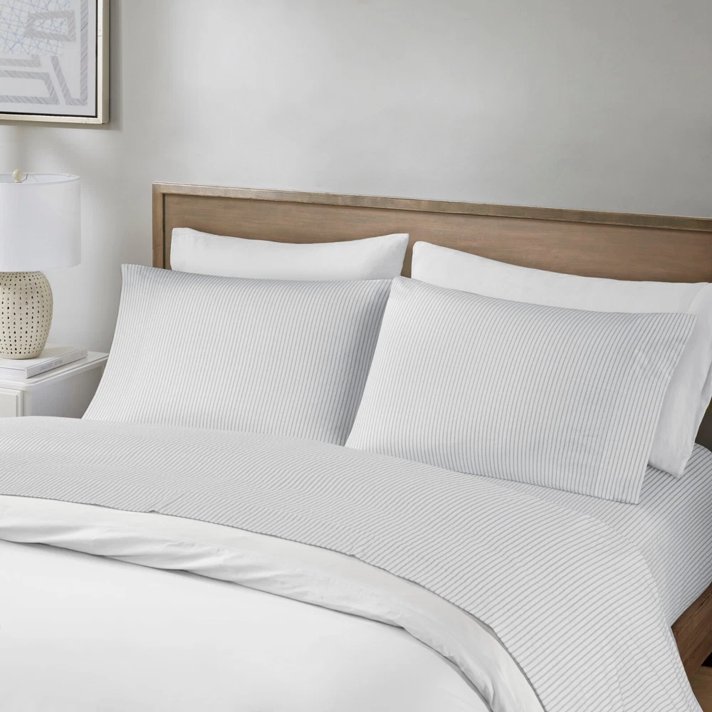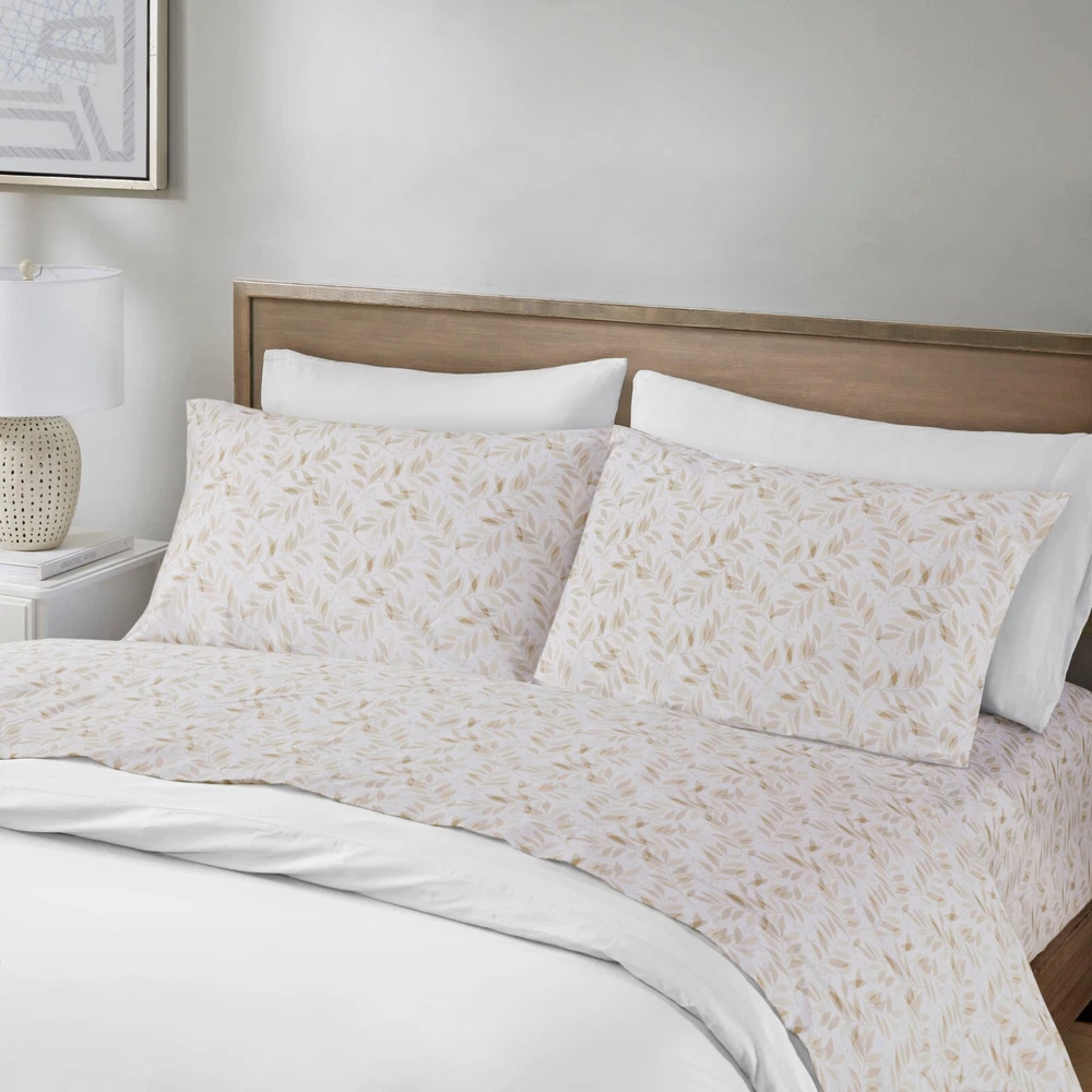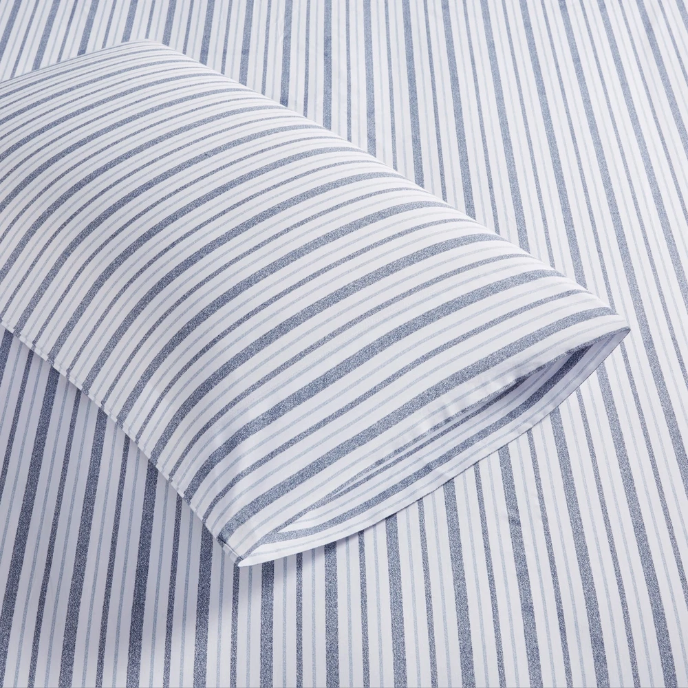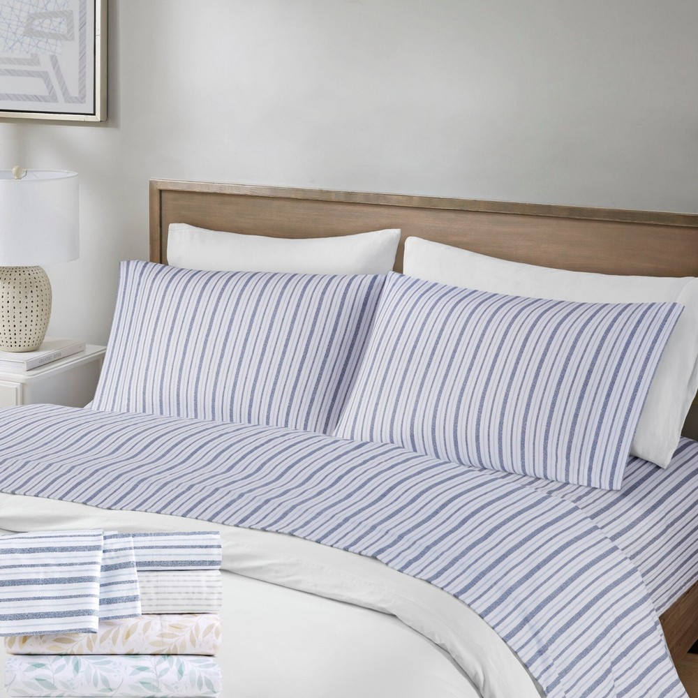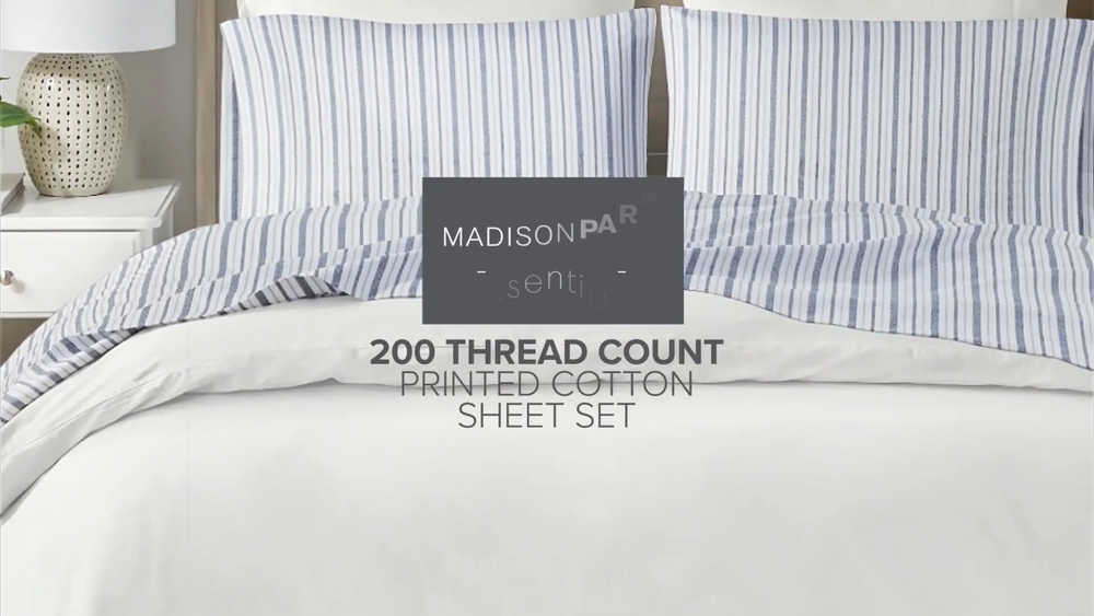 Madison Park Count Printed Deep Pocket Cotton Sheet Set Full Queen King Size DESCRIPTION Sleep in year-round breathable comfort with these printed cotton percale sheet set. This ultra-soft feel sheet set is moisture absorbent and features printed designs, to add a refined pop of color to your bedroom. The percale weave combined with the cotton makes this the perfect sheet set if you're looking for a cooler and airy good night's sleep. This sheet set is also OEKO-TEX certified, meaning it does not contain any harmful substances or chemicals to ensure quality comfort and wellness. Machine washable for easy care fitted sheet fits up to 17" pocket depth mattresses (14" for Full). FEATURES • 200 thread count 100% printed cotton sheet set • Percale weave is light brushed to have a soft fuzz feel • Breathable and moisture absorbent • Sheet set includes flat sheet, fitted sheet, 2 pillowcases • Fitted sheet fits up to 17" pocket depth mattresses (14" for Full), comes fully elasticized for better coverage and fit • Machine washable for easy care • OEKO-TEX labeled textile certified as safe on skin MATERIAL 100% Cotton Percale Available Sizes: Full Sheet Set includes: 1 Flat Sheet: 81"W x 96"L 1 Fitted Sheet: 54"W x 75"L + 12"D 2 Pillowcases: 20"W x 30"L Queen Sheet Set includes: 1 Flat Sheet: 90"W x 102"L 1 Fitted Sheet: 60"W x 80"L + 15"D 2 Pillowcases: 20"W x 30"L King Sheet Set includes: 1 Flat Sheet: 108"W x 102"L 1 Fitted Sheet: 78"W x 80"L + 15"D 2 Pillowcases: 20"W x 40"L