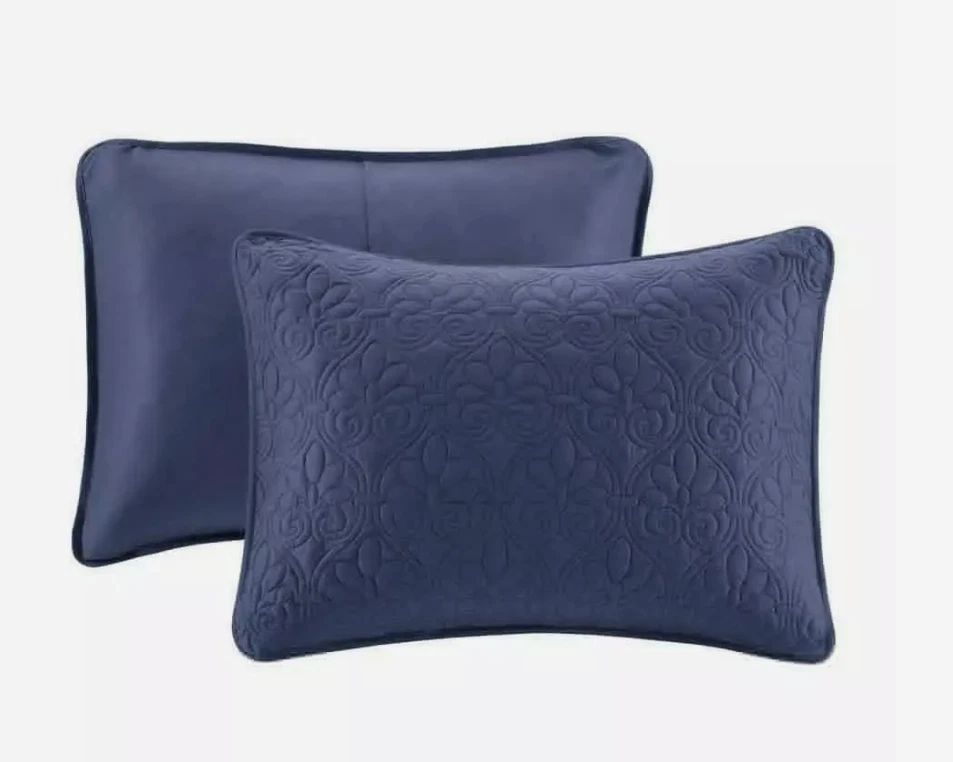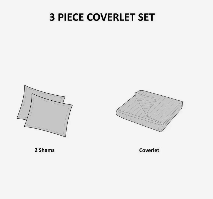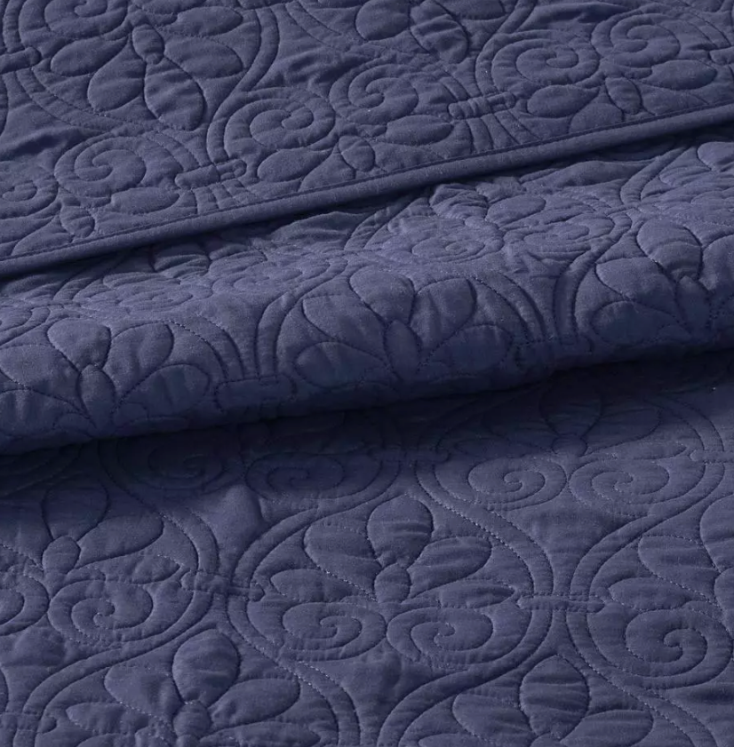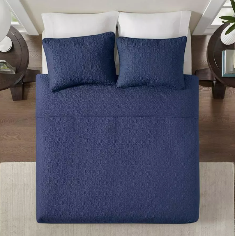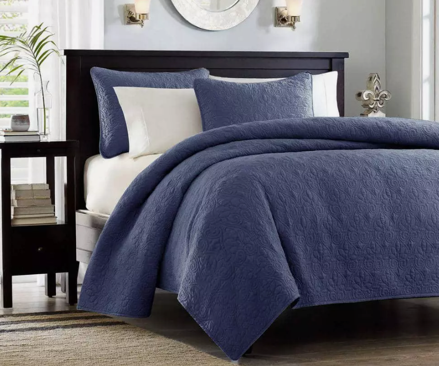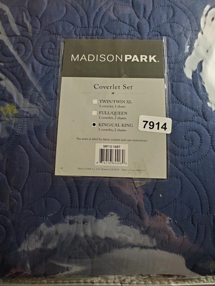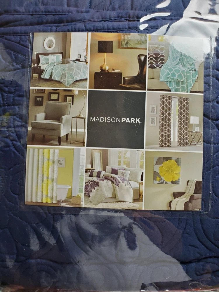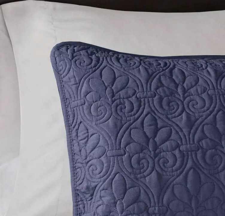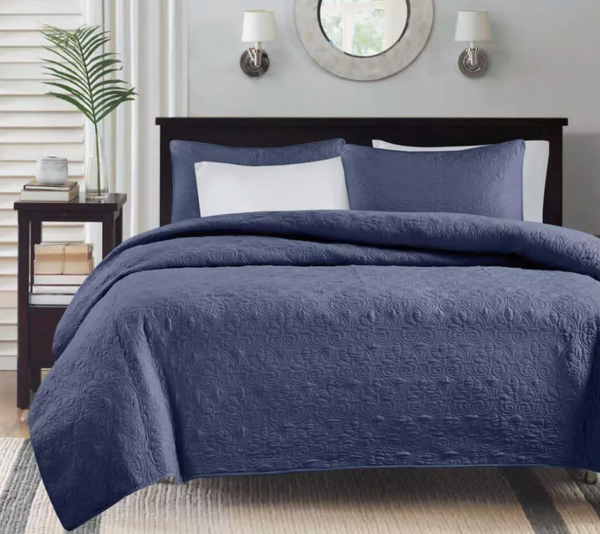 Madison Park Mansfield Reversible Coverlet Set is the perfect coverlet to use as a layering piece or an alternative to your comforter for a new solid look. The classic stitch pattern pairs easily with your existing decor and will sure to add a new decorative element to your bedroom. The face and the reverse of the coverlet are a super soft brushed fabric. Bedding Material: Polyester Care Instructions: Machine Wash Color: Navy Color Family: Blue Decor Type: Bedroom Linen Decorative Accents: No Decorative Accents Features: Reversible Fill Material: Cotton Lifestage: Adult Linen Type: Coverlet Set Material: Polyester (100%) Material Family: Polyester Number of Pieces: 3 Origin: Imported Pattern Type: Floral Returnable: 30-Day Set Includes: Coverlet,Sham Size: King/Cal King Thread Count: 0 Quilt/Coverlet Length (in.): 104 in Quilt/Coverlet Width (in.): 94 in Sham Length (in.): 36 in Sham Width (in.): 20 in