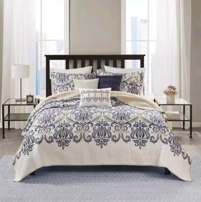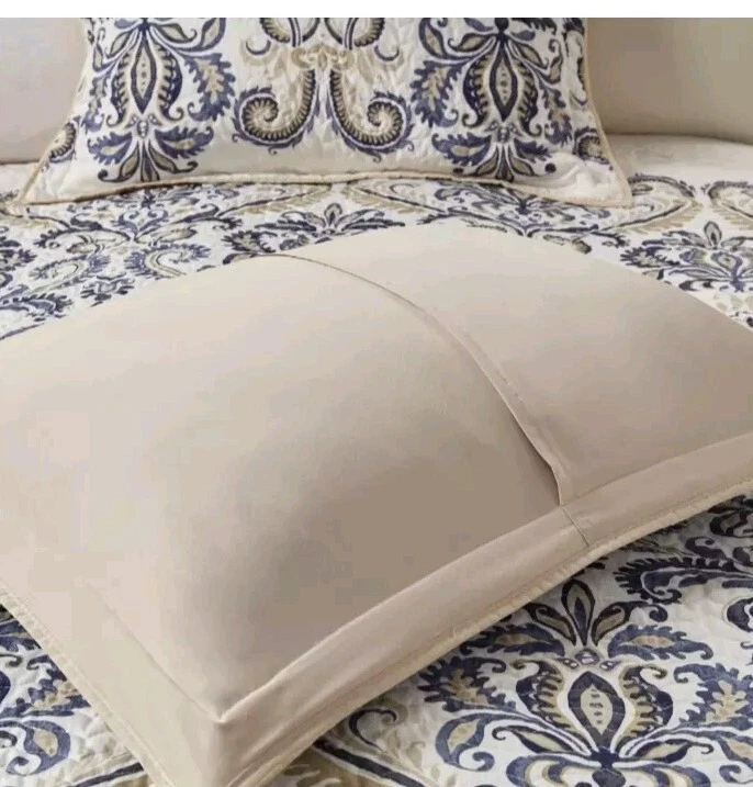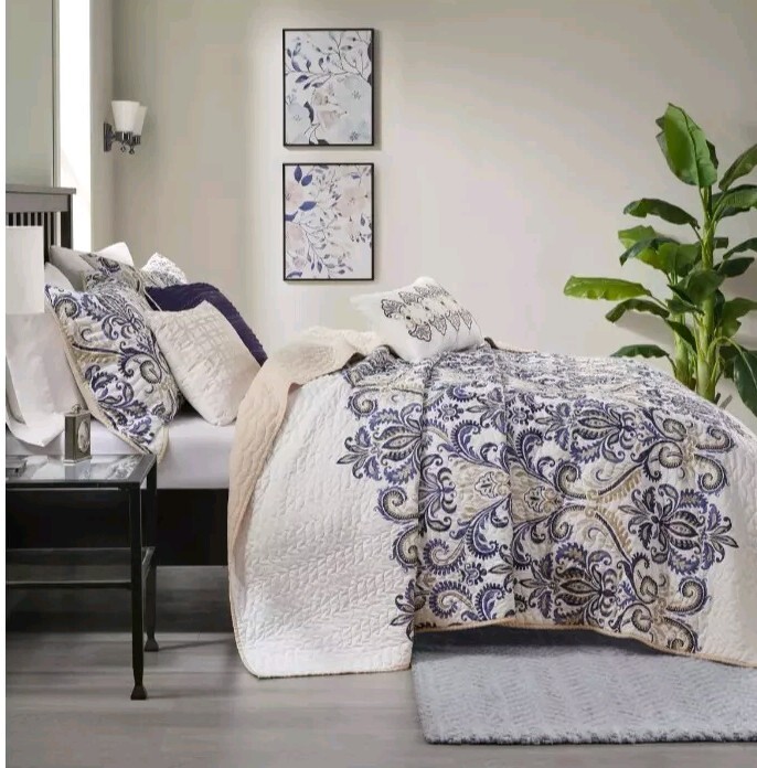Add a touch of elegance to your bedroom with this beautiful Madison Park Coverlet Set. The set includes six pieces of a cotton blend material in a navy and tan paisley pattern. The full/queen size covers a bed measuring 90 inches in both length and width. This coverlet set is perfect for anyone looking to add a cozy and stylish touch to their bedroom. The polyester material is easy to care for with machine wash instructions included. The set is ideal for a variety of bedroom decor styles and is sure to impress your guests.