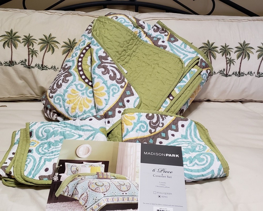 “Perfect condition was only used a short time. Note: This is only a 3 piece set ( throw pillows not included) / cotton blend, soft,& reversible. Beautiful colors. Machine wash/ tumble dry . Coverlet s...