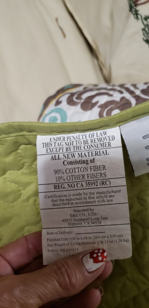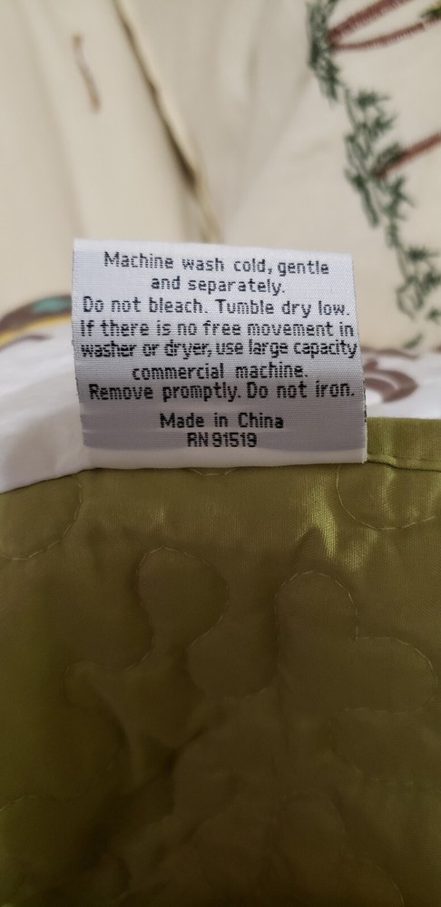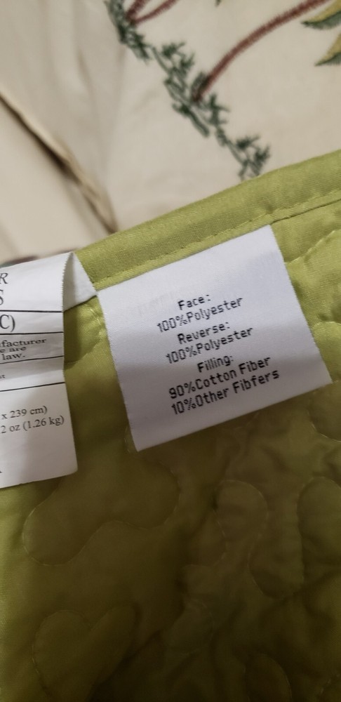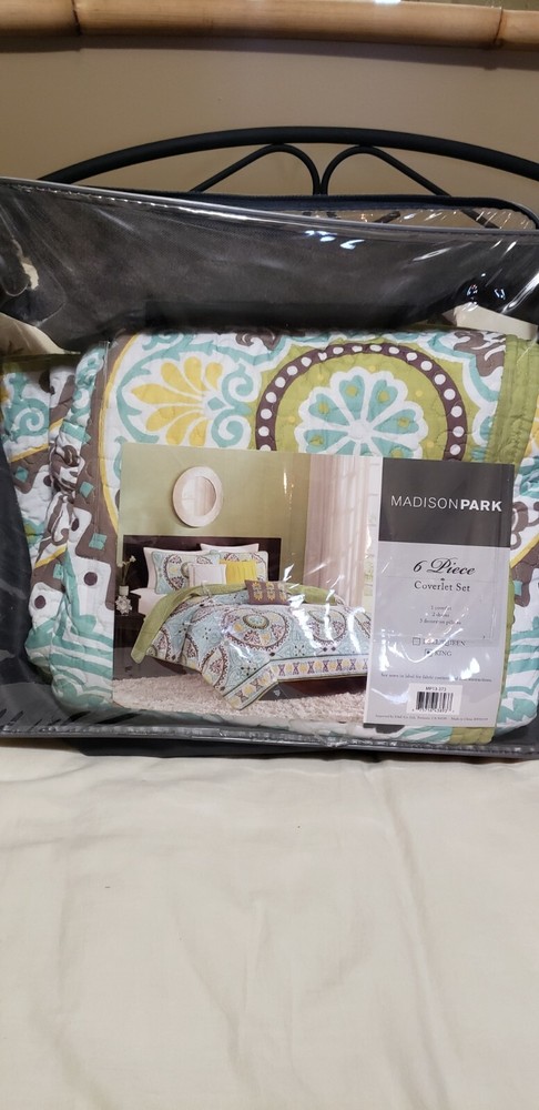 “Perfect condition was only used a short time. Note: This is only a 3 piece set ( throw pillows not included) / cotton blend, soft,& reversible. Beautiful colors. Machine wash/ tumble dry . Coverlet size 104 x 94