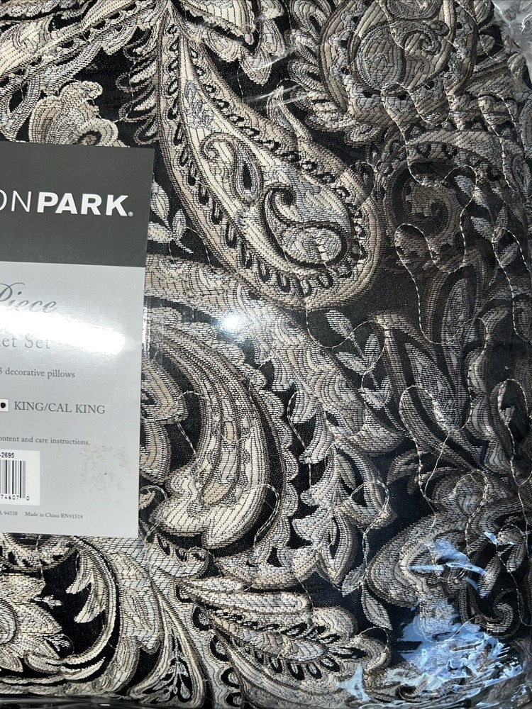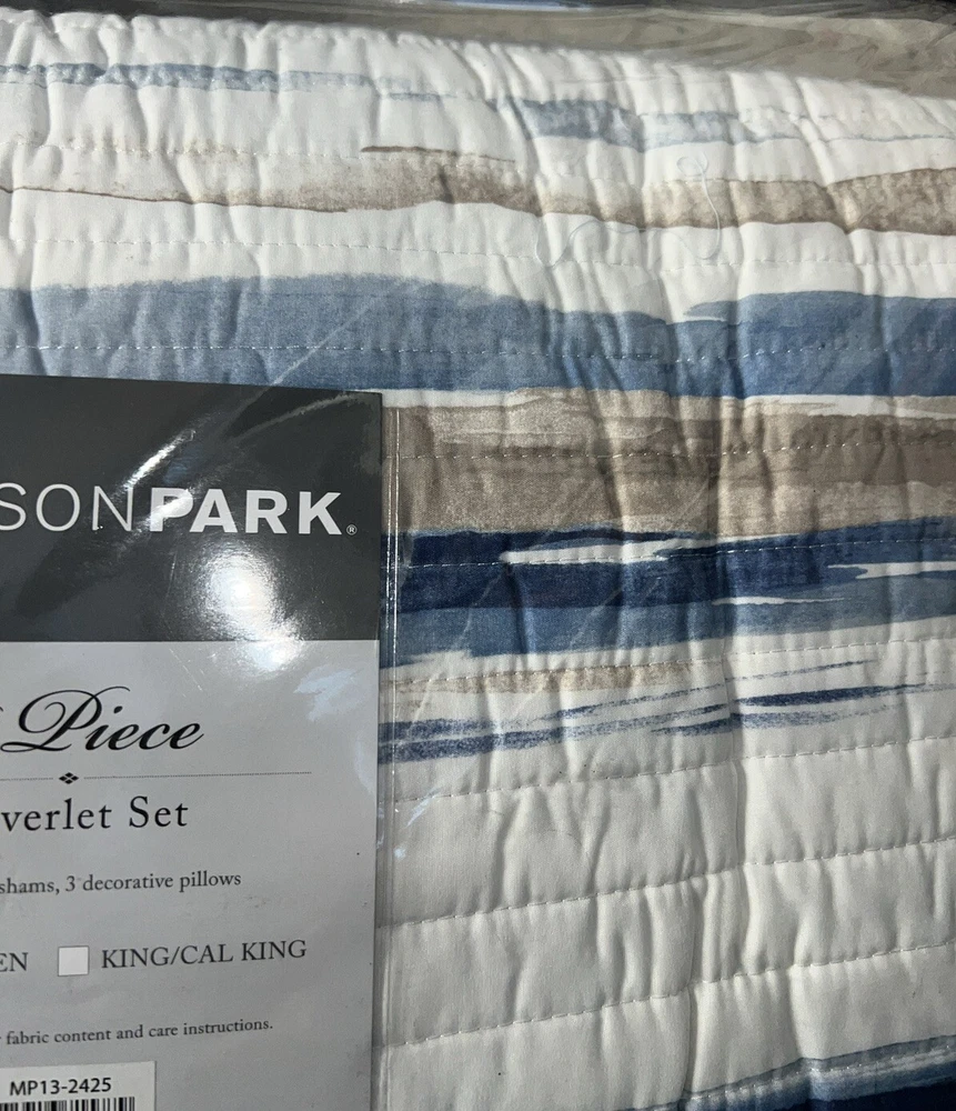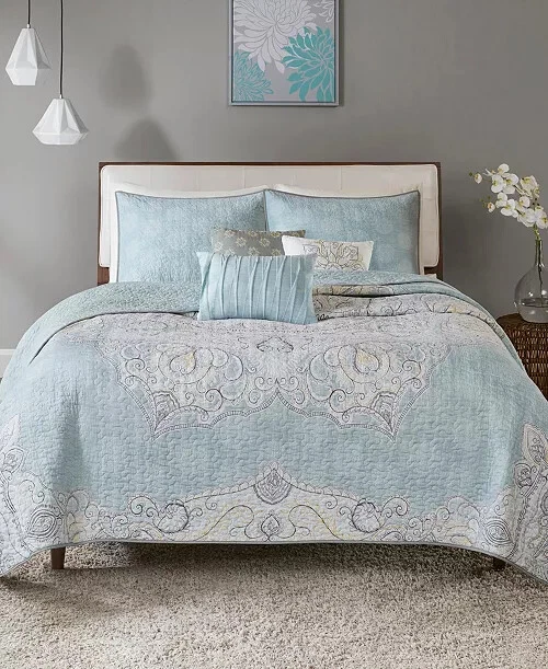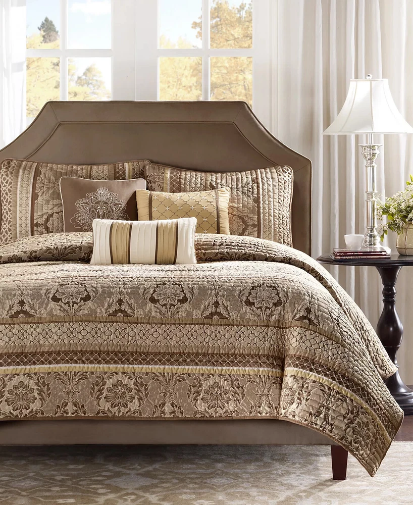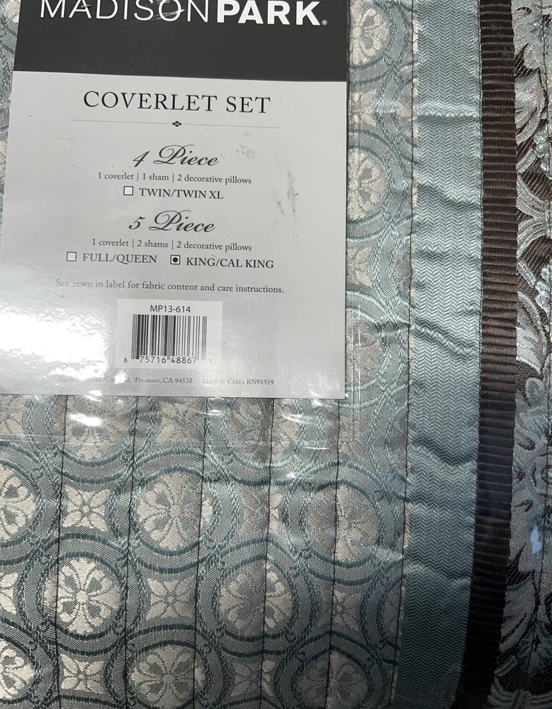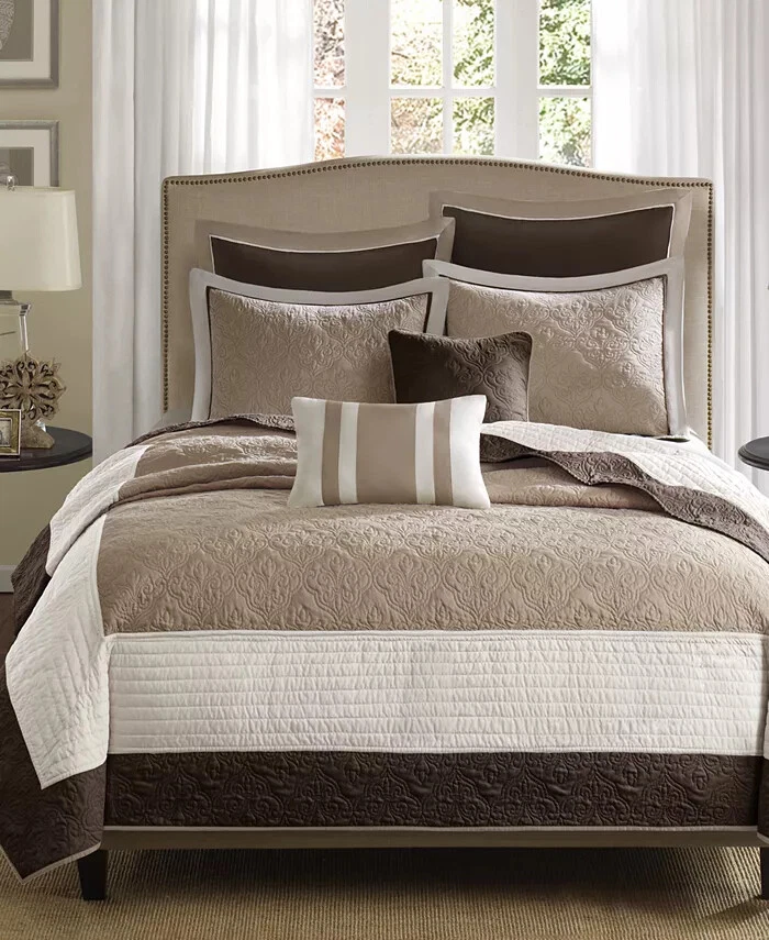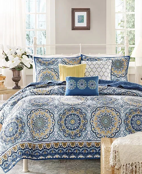 Marina Printed 6 Piece Coverlet Full/Queen: The Madison Park Marina 6 piece reversible coverlet set provides a modern take on the coastal stripe. Its watercolor motif provides the calming feel of the ocean in your space: Quilt dimensions - 90" L x 90" W x 0.25" H 2 standard shams - 20" W x 26" L Decorative pillow 1 dimension - 16" W x 16" L Decorative pillow 2 dimension - 12" W x 18" L Decorative pillow 3 dimension - 18" W x 18" L Set includes - 1 quilt, 2 standard shams, 3 decorative pillows Serene and tranquil watercolor printed 6 piece quilted coverlet set The coverlet features watercolor stripe in storm blue, aqua and teal hues and a pastel blue reverse Quilted soft microfiber offer great comfort and soft to the touch Use coverlet alone for summer season or layer it on the comforter for extra warmth Machine washable for easy care Items in this set may come in rolled or compressed packaging and will need to be fluffed up The coverlet features watercolor stripe and solid color reverse Coverlet and Shams - 100% Polyester Face and Back, Cotton and Polyester Filling, Pillows - Polyester Machine Washable Imported Princeton 5-Pc Coverlet Set King Blue: Add a touch of richness to your home décor with the Madison Park Princeton 5 Piece Bedspread Set. Made from polyester jacquard, the bedspread and shams share leaf, striping, and medallion motifs that are accentuated by a solid chocolate brown border and reverse. Pops of red and ivory are also used throughout this bedding collection, adding a lavish feeling to your décor. Two decorative pillows feature pleating and embroidery details that coordinate with the top of the bed to bring the entire look together. bedspread, 2 king shams, 2 decorative pillows bedspread:118" x 120", king sham (2):20" x 36" + 2", decorative pillows (2):18" x 18"/12" x 18" Stripe - Geometric Colors: Brown ground with red, white accents 100% polyester; Bedspread fill: 90% cotton, 5% polyester, 5% other fiber Machine Washable, Spot Clean Pillows Imported Aubrey 6 Piece Coverlet King/Cal King Black: King/California king set includes: 1-coverlet:104 in. x 94 in., 2-king shams:20 in. x 36 in.+ 2 in. (2), 3-decorative pillows: 18 in. x 18 in./ 16 in. x 16 in./ 6.5 in. x 18 in. 6-piece reversible coverlet set Machine wash Tangiers 6-Pc. Full/Queen Clue: Add a vibrant look and feel to your room with the Tangiers coverlet set from Madison Park, featuring an allover medallion motif on the quilted coverlet, while two shams and three decorative pillows complete the look. Set includes: coverlet (90" x 90"), two standard shams (20" x 26") and three decorative pillows (18" x 18, 16" x 16", 12" x 18") Medallion motif Coverlet/sham/pillow: polyester; coverlet fill: cotton/polyester/other 200 grams per square meter; pillow fill: polyester Machine washable. Spot clean pillows. Imported Lucinda Reversible 6-Pc. Coverlet Set, Full/Queen Blue: The Madison Park Lucinda 6 Piece Reversible Cotton Sateen Coverlet Set easily refreshes your bedroom décor. Completely reversible, this quilted coverlet features an over-scale printed medallion with delicate motifs in seafoam, white, and grey hues and a blue patterned reverse that creates a graceful look. Cotton rich filling within the coverlet boasts exceptional softness and warmth to keep you comfortable. The matching shams mirror the reverse of the coverlet for a beautiful coordinated ensemble, while three embroidered decorative pillows, in corresponding colors, add dimension and charm. With its globally inspired style, this cotton sateen coverlet set displays an elegant sheen and is machine washable for easy care. coverlet, 2 standard shams, 3 decorative pillows coverlet:90" x 90", standard sham (2):20" x 26"+ 0.5", decorative pillow (3):18" x 18"/12" x 18"/16" x 16" Geometric Reversible 210TC face; 180TC back Colors: Seafoam ground with grey, yellow accents Coverlet/Sham: 100% cotton sateen face, cotton/ polyester cross weave reverse; Pillow: cotton/polyester cross weave shell; Coverlet fill: 90% cotton, 5% plyester,5% other fibers; Decorative pillow fill: 100% polyester Machine Washable, Spot Clean Pillows Imported Luna 6-Pc. Quilt Set, King/California King Blue: Add charm to your bedroom with the Luna quilt set from Madison Park, featuring quilted fabric and a beautiful floral design on the face of the reversible quilt. Set includes: quilt (104" x 94"), three decorative pillows (18" x 18", 16" x 16", 12" x 18") and two king shams (20" x 36") Polyester, cotton Machine washable. Spot clean pillows. Imported Bellagio 6-Pc. Quilt Set, King, Brown: Take your room's decor from basic to bold with the stunning jacquards and rich sparkling tones of this Bellagio quilt set from Madison Park. The included decorative pillows add a splash of cool color and distinct style to the ensemble. Set includes: king quilt (104" x 94"), two king shams (20" x 36") and three decorative pillows (16" x 16", 10" x 18", 12" x 18") Asian American & Pacific Islander Owned, Woman Owned Quilt and sham: polyester; Decorative pillows: polyester; polyester fill; quilt fill: 5-oz. cotton Machine washable. Spot clean pillows. Imported Attingham 7-Pc. Quilt Set, King/California King, Beige: Create a relaxed sleeping environment in your room with the Attingham coverlet set from Madison Park, featuring a cozy quilted design. Set includes: coverlet (104" x 94"), two European shams (26" x 26"), two king shams (20" x 36") and two pillows (16" x 16", 12" x 18") Quilted Reversible Asian American & Pacific Islander Owned, Woman Owned Coverlet/pillows: polyester 75 grams per square meter; shams: polyester; coverlet fill: cotton/polyester/rayon; pillow fill: polyester Machine washable. Spot clean pillows. Imported Harmony Oversized Reversible Matelasse 4 Piece Coverlet Set, King/California King: Indulge in the beauty of this matelasse coverlet set. The delicate botanical motifs, intricately crafted with reverse applique style, create a stunning texture. With a fully reversible design, you ca