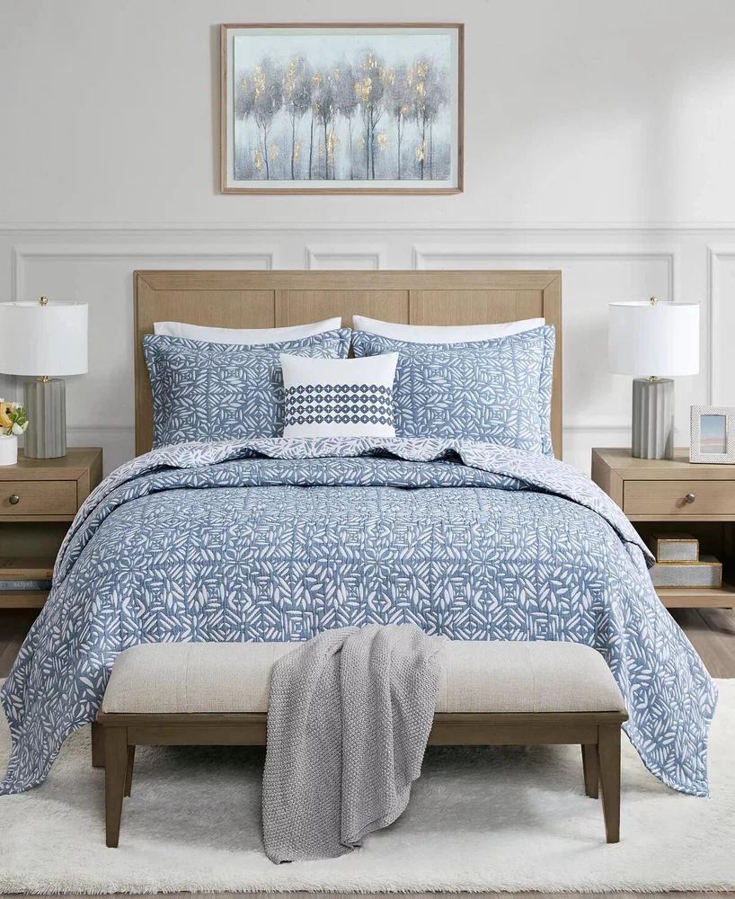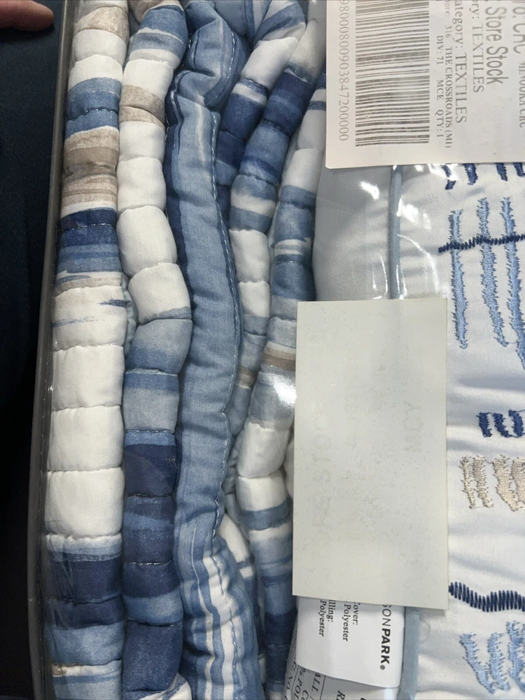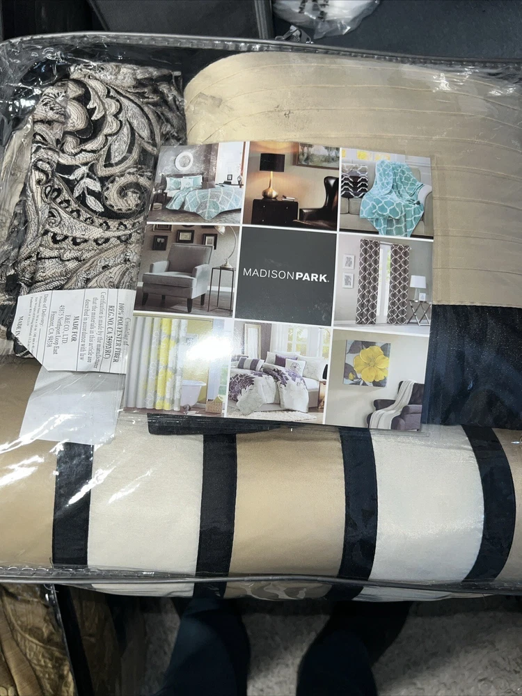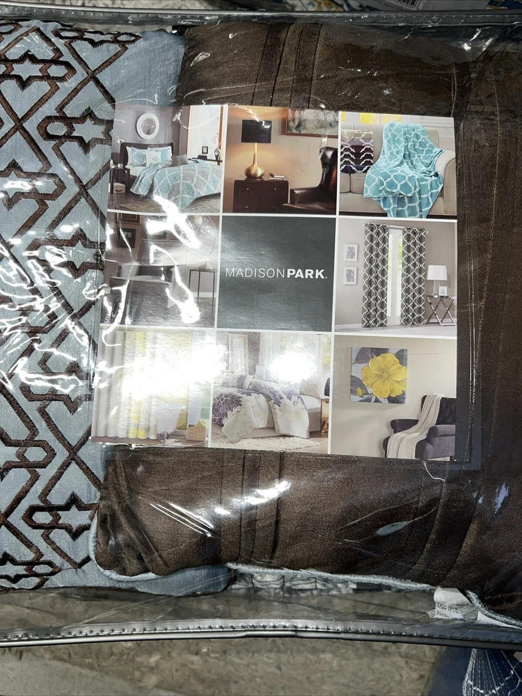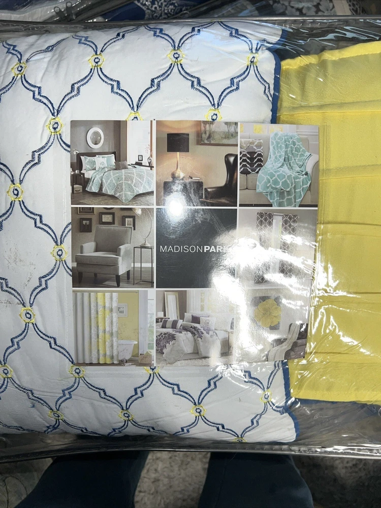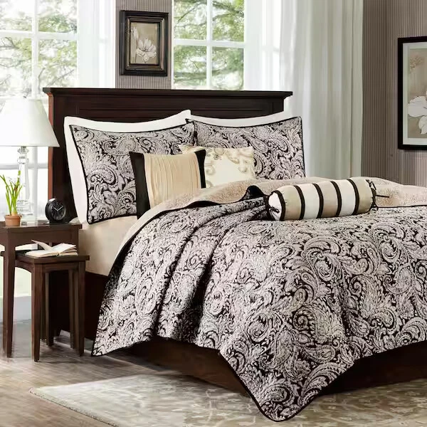 Marina Printed 6 Piece Coverlet Full/Queen: The Madison Park Marina 6 piece reversible coverlet set provides a modern take on the coastal stripe. Its watercolor motif provides the calming feel of the ocean in your space: Quilt dimensions - 90" L x 90" W x 0.25" H 2 standard shams - 20" W x 26" L Decorative pillow 1 dimension - 16" W x 16" L Decorative pillow 2 dimension - 12" W x 18" L Decorative pillow 3 dimension - 18" W x 18" L Set includes - 1 quilt, 2 standard shams, 3 decorative pillows Serene and tranquil watercolor printed 6 piece quilted coverlet set The coverlet features watercolor stripe in storm blue, aqua and teal hues and a pastel blue reverse Quilted soft microfiber offer great comfort and soft to the touch Use coverlet alone for summer season or layer it on the comforter for extra warmth Machine washable for easy care Items in this set may come in rolled or compressed packaging and will need to be fluffed up The coverlet features watercolor stripe and solid color reverse Coverlet and Shams - 100% Polyester Face and Back, Cotton and Polyester Filling, Pillows - Polyester Machine Washable Imported Princeton 5-Pc Coverlet Set King Blue: Add a touch of richness to your home décor with the Madison Park Princeton 5 Piece Bedspread Set. Made from polyester jacquard, the bedspread and shams share leaf, striping, and medallion motifs that are accentuated by a solid chocolate brown border and reverse. Pops of red and ivory are also used throughout this bedding collection, adding a lavish feeling to your décor. Two decorative pillows feature pleating and embroidery details that coordinate with the top of the bed to bring the entire look together. bedspread, 2 king shams, 2 decorative pillows bedspread:118" x 120", king sham (2):20" x 36" + 2", decorative pillows (2):18" x 18"/12" x 18" Stripe - Geometric Colors: Brown ground with red, white accents 100% polyester; Bedspread fill: 90% cotton, 5% polyester, 5% other fiber Machine Washable, Spot Clean Pillows Imported Aubrey 6 Piece Coverlet King/Cal King Black: King/California king set includes: 1-coverlet:104 in. x 94 in., 2-king shams:20 in. x 36 in.+ 2 in. (2), 3-decorative pillows: 18 in. x 18 in./ 16 in. x 16 in./ 6.5 in. x 18 in. 6-piece reversible coverlet set Machine wash Tangiers 6-Pc. Full/Queen Clue: Add a vibrant look and feel to your room with the Tangiers coverlet set from Madison Park, featuring an allover medallion motif on the quilted coverlet, while two shams and three decorative pillows complete the look. Set includes: coverlet (90" x 90"), two standard shams (20" x 26") and three decorative pillows (18" x 18, 16" x 16", 12" x 18") Medallion motif Coverlet/sham/pillow: polyester; coverlet fill: cotton/polyester/other 200 grams per square meter; pillow fill: polyester Machine washable. Spot clean pillows. Imported Lucinda Reversible 6-Pc. Coverlet Set, Full/Queen Blue: The Madison Park Lucinda 6 Piece Reversible Cotton Sateen Coverlet Set easily refreshes your bedroom décor. Completely reversible, this quilted coverlet features an over-scale printed medallion with delicate motifs in seafoam, white, and grey hues and a blue patterned reverse that creates a graceful look. Cotton rich filling within the coverlet boasts exceptional softness and warmth to keep you comfortable. The matching shams mirror the reverse of the coverlet for a beautiful coordinated ensemble, while three embroidered decorative pillows, in corresponding colors, add dimension and charm. With its globally inspired style, this cotton sateen coverlet set displays an elegant sheen and is machine washable for easy care. coverlet, 2 standard shams, 3 decorative pillows coverlet:90" x 90", standard sham (2):20" x 26"+ 0.5", decorative pillow (3):18" x 18"/12" x 18"/16" x 16" Geometric Reversible 210TC face; 180TC back Colors: Seafoam ground with grey, yellow accents Coverlet/Sham: 100% cotton sateen face, cotton/ polyester cross weave reverse; Pillow: cotton/polyester cross weave shell; Coverlet fill: 90% cotton, 5% plyester,5% other fibers; Decorative pillow fill: 100% polyester Machine Washable, Spot Clean Pillows Imported Luna 6-Pc. Quilt Set, King/California King Blue: Add charm to your bedroom with the Luna quilt set from Madison Park, featuring quilted fabric and a beautiful floral design on the face of the reversible quilt. Set includes: quilt (104" x 94"), three decorative pillows (18" x 18", 16" x 16", 12" x 18") and two king shams (20" x 36") Polyester, cotton Machine washable. Spot clean pillows. Imported Bellagio 6-Pc. Quilt Set, King, Brown: Take your room's decor from basic to bold with the stunning jacquards and rich sparkling tones of this Bellagio quilt set from Madison Park. The included decorative pillows add a splash of cool color and distinct style to the ensemble. Set includes: king quilt (104" x 94"), two king shams (20" x 36") and three decorative pillows (16" x 16", 10" x 18", 12" x 18") Asian American & Pacific Islander Owned, Woman Owned Quilt and sham: polyester; Decorative pillows: polyester; polyester fill; quilt fill: 5-oz. cotton Machine washable. Spot clean pillows. Imported Attingham 7-Pc. Quilt Set, King/California King, Beige: Create a relaxed sleeping environment in your room with the Attingham coverlet set from Madison Park, featuring a cozy quilted design. Set includes: coverlet (104" x 94"), two European shams (26" x 26"), two king shams (20" x 36") and two pillows (16" x 16", 12" x 18") Quilted Reversible Asian American & Pacific Islander Owned, Woman Owned Coverlet/pillows: polyester 75 grams per square meter; shams: polyester; coverlet fill: cotton/polyester/rayon; pillow fill: polyester Machine washable. Spot clean pillows. Imported Harmony Oversized Reversible Matelasse 4 Piece Coverlet Set, King/California King: Indulge in the beauty of this matelasse coverlet set. The delicate botanical motifs, intricately crafted with reverse applique style, create a stunning texture. With a fully reversible design, you ca