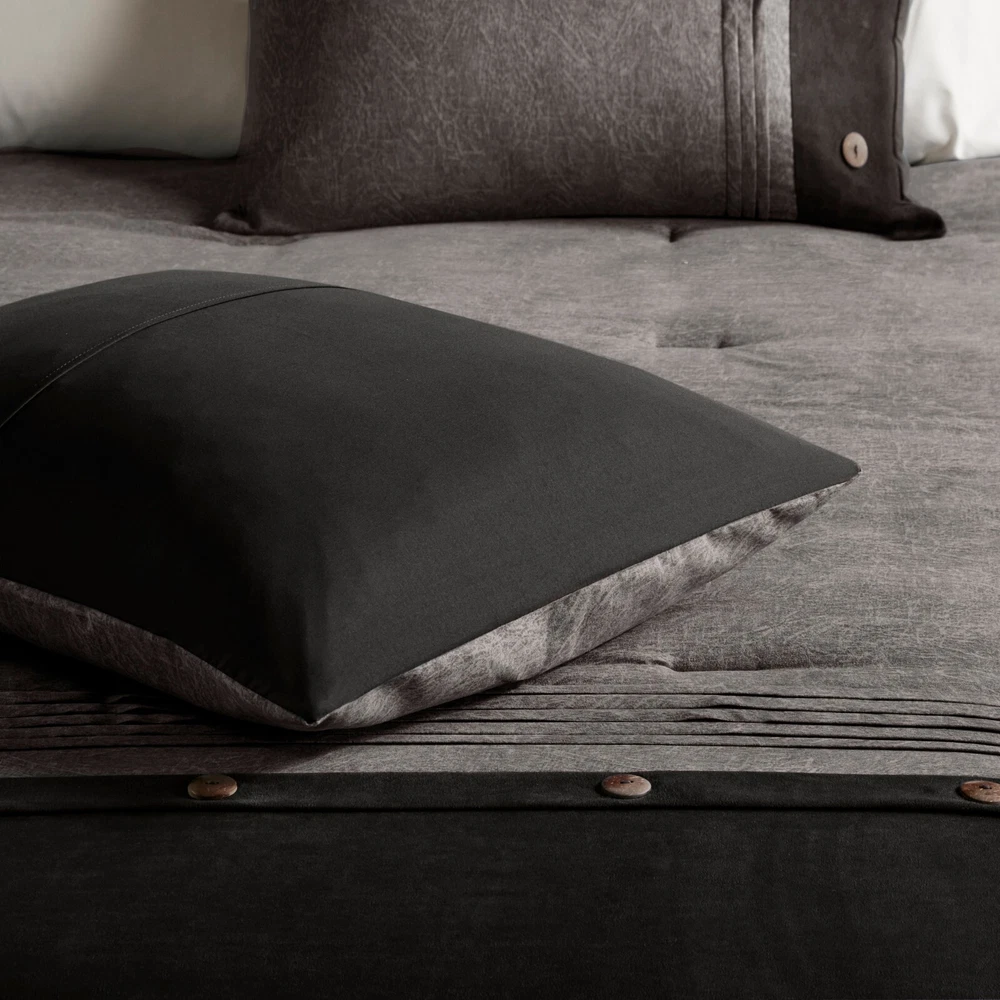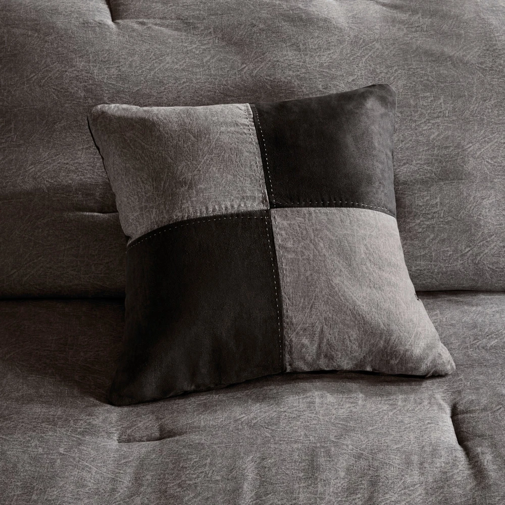 Store Categories Store Categories Bedding Comforters Decorative Pillows Duvet Covers Quilts & Coverlets Sheets Blankets & Throws Mattress Pads Pillows Home Decor Window Treatments Wall Art Home Accents Furniture Beds Dining Seating Ottomans & Benches Accent Chairs Accent Tables Dining Tables Sofas Bath Bath Robes Shower Curtains Towels Bath Rugs Bath Accessories Apparel Pajama Sets Nightgowns Rugs Rugs & Carpets Lighting Lamp Pendant Other Product Overview Details DESCRIPTION For a warm, lodge look in your space, the Madison Park Boone Collection is perfect for you. The unique fabric used in this set has a textured earthy print pieced with polyester microsuede at the bottom and buttons for a personal touch. Three decorative pillows using piecing and embroidery of both top of bed fabrics completing this cohesive look. Machine washable for easy care, this comforter set brings a refresh update to your bedroom décor. Items in the set may come in a rolled or compressed packaging, which will need to be fluffed up or steam ironed before use to remove wrinkles. FEATURES • Soft 7 piece faux suede comforter set • Lodge Cabin style pieced fabric and decorative buttons on top of the bed • Set includes comforter, bedskirt, 2 shams, 2 square and 1 oblong decorative pillows • Hypoallergenic polyester filling in the comforter and decorative pillows • Machine washable and steam iron for wrinkle removal • Items in this set may come in rolled or compressed packaging and will need to be fluffed up MATERIAL Faux suede comforter and shams, 100% Polyester filling; faux suede bedskirt and pillows Available Sizes: Queen Comforter Set includes: 1 Comforter: 90"W x 90"L 2 Standard Shams: 20"W x 26"L 1 Bedskirt: 60"W x 80"L + 15"D 1 Decorative Pillow: 16"W x 16"L 1 Decorative Pillow: 12"W x 18"L 1 Decorative Pillow: 18"W x 18"L King Comforter Set includes: 1 Comforter: 104"W x 92"L 2 King Shams: 20"W x 36"L 1 Bedskirt: 78"W x 80"L + 15"D 1 Decorative Pillow: 16"W x 16"L 1 Decorative Pillow: 12"W x 18"L 1 Decorative Pillow: 18"W x 18"L California King Comforter Set includes: 1 Comforter: 104"W x 92"L 2 King Shams: 20"W x 36"L 1 Bedskirt: 72"W x 84"L + 15"D 1 Decorative Pillow: 16"W x 16"L 1 Decorative Pillow: 12"W x 18"L 1 Decorative Pillow: 18"W x 18"L Bedding Comforters Decorative Pillows Duvet Covers Quilts & Coverlets Sheets Blankets & Throws Mattress Pads Pillows Home Decor Window Treatments Wall Art Home Accents Furniture Beds Dining Seating Ottomans & Benches Accent Chairs Accent Tables Dining Tables Sofas Bath Bath Robes Shower Curtains Towels Bath Rugs Bath Accessories Rugs Rugs & Carpets Lighting Lamp Pendant Product Overview Product Details DESCRIPTION For a warm, lodge look in your space, the Madison Park Boone Collection is perfect for you. The unique fabric used in this set has a textured earthy print pieced with polyester microsuede at the bottom and buttons for a personal touch. Three decorative pillows using piecing and embroidery of both top of bed fabrics completing this cohesive look. Machine washable for easy care, this comforter set brings a refresh update to your bedroom décor. Items in the set may come in a rolled or compressed packaging, which will need to be fluffed up or steam ironed before use to remove wrinkles. FEATURES • Soft 7 piece faux suede comforter set • Lodge Cabin style pieced fabric and decorative buttons on top of the bed • Set includes comforter, bedskirt, 2 shams, 2 square and 1 oblong decorative pillows • Hypoallergenic polyester filling in the comforter and decorative pillows • Machine washable and steam iron for wrinkle removal • Items in this set may come in rolled or compressed packaging and will need to be fluffed up MATERIAL Faux suede comforter and shams, 100% Polyester filling; faux suede bedskirt and pillows Available Sizes: Queen Comforter Set includes: 1 Comforter: 90"W x 90"L 2 Standard Shams: 20"W x 26"L 1 Bedskirt: 60"W x 80"L + 15"D 1 Decorative Pillow: 16"W x 16"L 1 Decorative Pillow: 12"W x 18"L 1 Decorative Pillow: 18"W x 18"L King Comforter Set includes: 1 Comforter: 104"W x 92"L 2 King Shams: 20"W x 36"L 1 Bedskirt: 78"W x 80"L + 15"D 1 Decorative Pillow: 16"W x 16"L 1 Decorative Pillow: 12"W x 18"L 1 Decorative Pillow: 18"W x 18"L California King Comforter Set includes: 1 Comforter: 104"W x 92"L 2 King Shams: 20"W x 36"L 1 Bedskirt: 72"W x 84"L + 15"D 1 Decorative Pillow: 16"W x 16"L 1 Decorative Pillow: 12"W x 18"L 1 Decorative Pillow: 18"W x 18"L