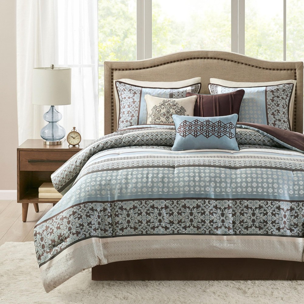 Madison Park Cozy Comforter Set - Luxurious Jaquard Traditional Damask Design, All Season Down Alternative Bedding with Matching Shams, Decorative Pillow Princeton Blue Queen(90"x90") 7 Piece Description Update your bedroom with the Princeton comforter set. PRINCETON creates character with intricate geometric and damask prints in a mix of grey, ivory, and soft blue tones. Features: 100% Polyester Imported To add a touch of richness to your current decor, the Madison Park 7 Piece Princton Comforter Set offers a luxurious update to your room PRINCETON creates character with intricate geometric and damask prints in a mix of subtle color creating a beautiful contrast. Jacquard fabric comes with a natural sheen creating a lustrous and luxurious design Set includes: 1 Comforter: 90"W x 90"L, 1 Bed Skirt: 60"W x 80"L + 15"D, 3 Decorative Pillows: 18"W x 18"L/16"W x 16"L/12"W x 18"L, 2 Standard Shams: 20"W x 26"L + 0.5"D Care instructions: Machine wash cold, gentle cycle, and separately. Do not bleach. Tumble dry low, remove promptly. Do not iron. Spot clean pillow. If there is no free movement in the washer or dryer, use large capacity commercial washer/dryer. Product Details: Size: Queen (90 in x 90 in) Included Components: Pillow Sham, Comforter, Bed Skirt, Pillow Color: Princeton Blue Style: Traditional Brand: Madison Park Size: Queen (90 in x 90 in) Included Components: Pillow Sham, Comforter, Bed Skirt, Pillow Color: Princeton Blue Style: Traditional Brand: Madison Park Theme: Geometric,Damask,Character Pattern: Geometric Material: Polyester Fabric Type: 100% Polyester Number of Pieces: 7 Seasons: All Product Care Instructions: Machine Wash Manufacturer: Madison Park UPC: 675716507756 Item dimensions L x W x H: 90 x 90 x 2 inches Global Trade Identification Number: 56 Product Dimensions: 90 x 90 x 2 inches Item Weight: 12.42 pounds Department: unisex-adult Country of Origin: China Item model number: MP10-694 Is Discontinued By Manufacturer: No Refill: Polyester Form Factor: Platform Assembly required: No Batteries required: No Import: Imported Shipping Free fast shipping Return Policy All items qualify for returns within 30 days of receipt.