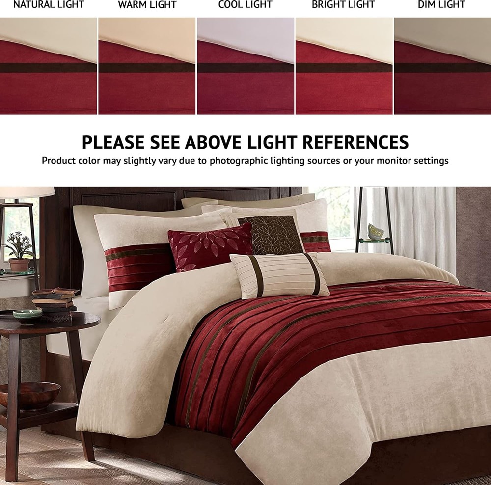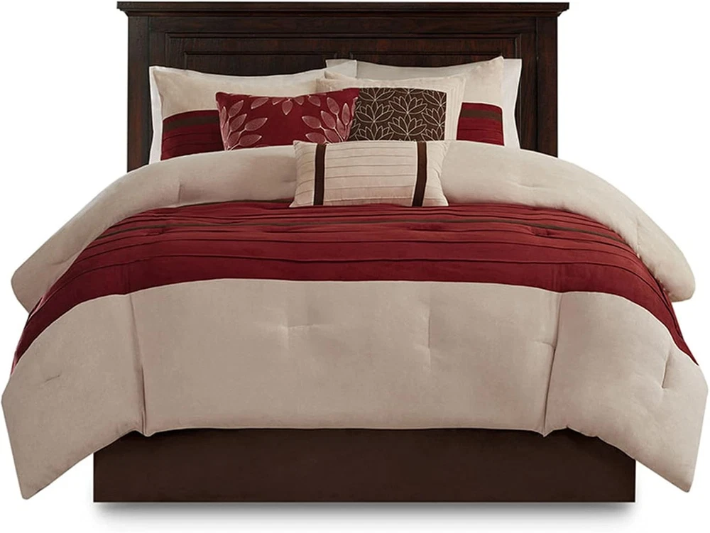 This is an OpenBoxed Item. Our Opened Box items are in great condition. Typically the item is 100% brand new in a replaced box. A great way to get a lot more for your money. All our items are 100% guaranteed! So buy worry free! Madison Park Cozy Comforter Set-Luxury California King (104 in x 92 in), Red Product Details Size: California King (104 in x 92 in) Included Components: 1 Comforter, 3 Decoratvie Pillows, 2 King Shams, 1 Bedskirt Color: Red Style: Transitional Brand: Madison Park Theme: Love Pattern: Striped Material: Polyester Fabric Type: 100% Faux Suede to Microfiber Number of Pieces: 7 Seasons: All Product Care Instructions: Machine Wash Manufacturer: Madison Park Item dimensions L x W x H: 104 x 92 x 1.5 inches Product Dimensions: 104 x 92 x 1.5 inches Item Weight: 0.01 ounces Department: unisex-adult Country of Origin: China Item model number: MP10-2268 Refill: polyester Assembly required: No Batteries required: No 100% Faux Suede to Microfiber For comfort and a chic design, the Palmer bedding collection is the perfect fit Its khaki comforter is made from pieced microsuede for a soft feel while the piecing details add texture and color with their red and brown details. The decorative pillows add a mix of nature-inspired leaves and solid neutrals to combine perfectly with this collection. Set Include:1 Comforter:104x92"2 King Shams:20x36"(2) 1 Bedskirt:72x84+15"3 Decorative Pillows:18x18"/16x16"/12x20" Material Details:Comforter/Sham: 100% polyester microsuede, pieced, 100% brushed polyester reverse, 270g/m2 polyester filling;Bedskirt: 100% polyester microsuede drop, 100% polyester platform;Pillow: 100% polyester shell, polyester filling Item Package Dimension: 18.9 L x 14.2 W x 11.8 H inches Item Package Weight - 14.19 Pounds Item Package Quantity - 1 Product Type - BEDDING SET The Madison Park Palmer 7 Piece Comforter Set offers a classic and refined update to your bedroom decor. This transitional style comforter features a pieced microsuede design in rich contrasting red and khaki colors to create an incredibly soft look and feel. The 2 matching shams also flaunt a pieced construction to coordinate with the faux suede comforter. A solid brown bed skirt and 3 decorative pillows with a mix of embroidered designs add the perfect finishing touches to complete this lush traditionally-inspired comforter. Machine washable for easy care, items in the set may come in a rolled or compressed packaging, which will need to be fluffed up or steam ironed before use to remove wrinkles.