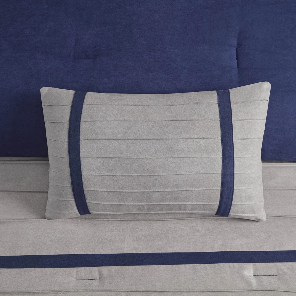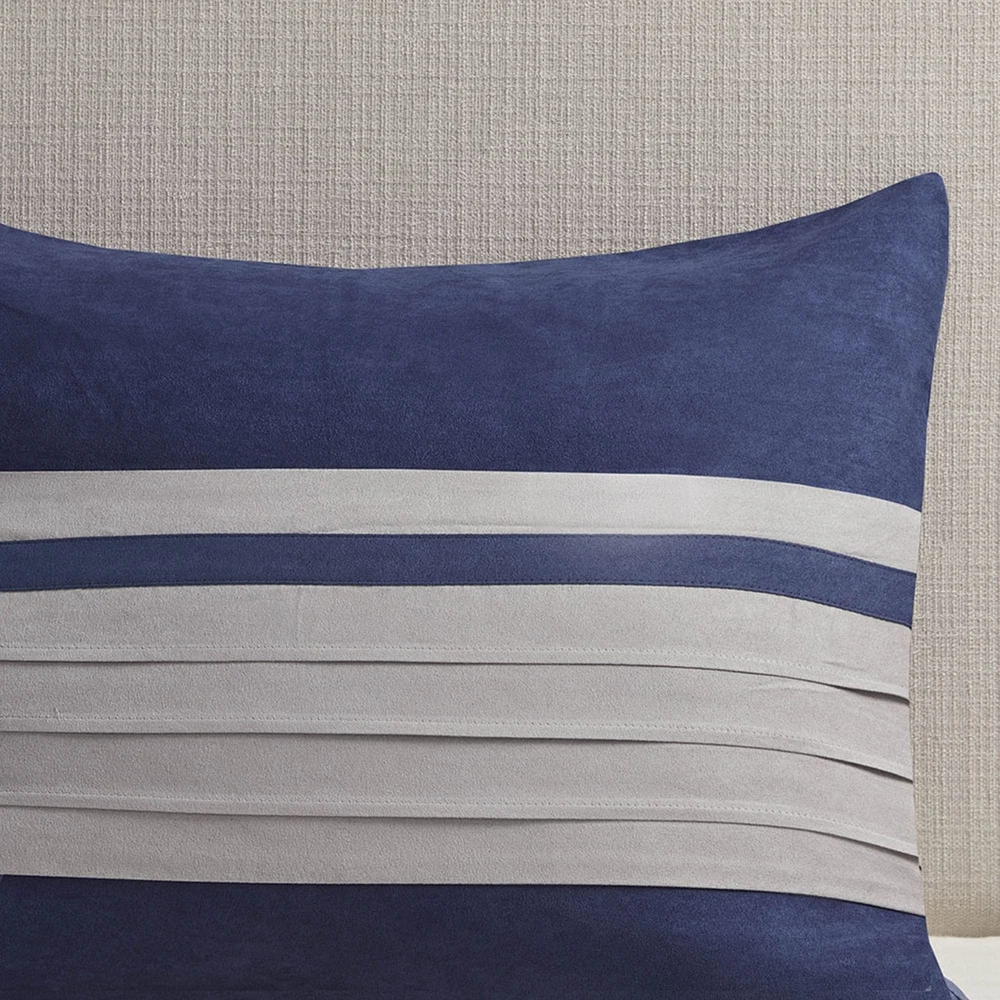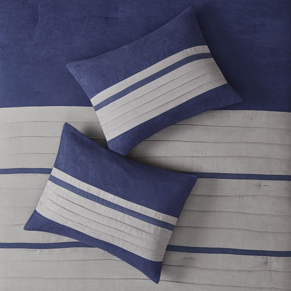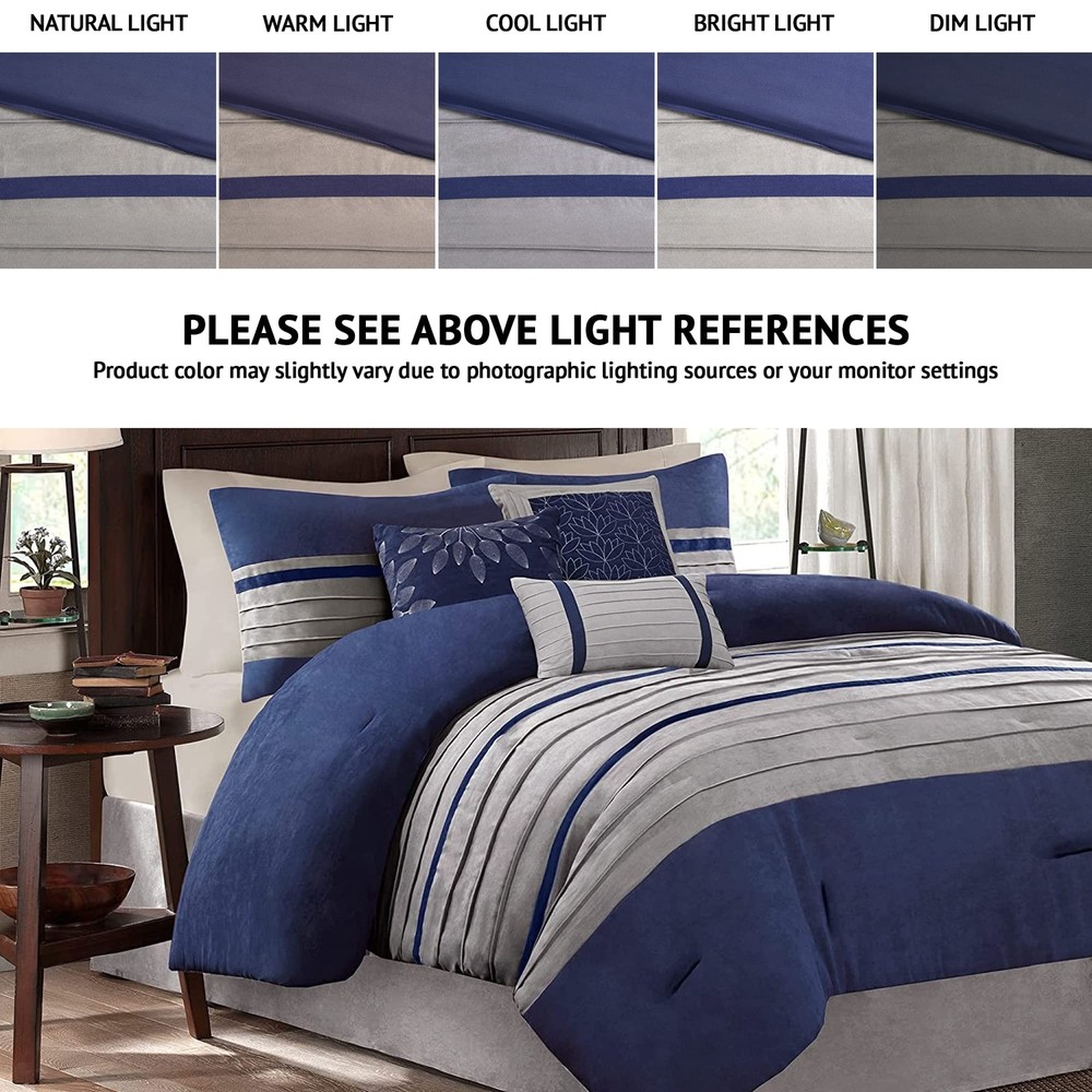 Madison Park Cozy Comforter Set-Luxury Faux Suede Design, Striped Accent, All Season Down Alternative Bedding, Matching Shams, Decorative Pillow, Blue, California King (104 in x 92 in) The Madison Park Palmer 7 Piece Comforter Set offers a classic and refined update to your bedroom decor. This transitional style comforter features a pieced microsuede design in rich contrasting blue and grey colors to create an incredibly soft look and feel. The 2 matching shams also flaunt a pieced construction to coordinate with the faux suede comforter. A solid grey bed skirt and 3 decorative pillows with a mix of embroidered designs add the perfect finishing touches to complete this lush traditionally-inspired comforter. Machine washable for easy care, items in the set may come in a rolled or compressed packaging, which will need to be fluffed up or steam ironed before use to remove wrinkles. Product Features Color: Blue Size: California King (104 in x 92 in) Brand: Madison Park MPN: MP10-2265 UPC: 675716702953 EAN: 0675716702953 100% Polyester Imported For comfort and a chic design, the Palmer bedding collection is the perfect fit Features faux suede comforter face, decorative pillow and extend to the bedskirt for a complete sophisticated design It's blue comforter is made from pieced microsuede for a soft feel while the piecing details add texture and color with their grey and blue colorways Microfiber fabric is a really soft, durable and easy to care fabric;Comforter might arrive compressed;Shake and snap comforter to fluff or put in the dryer with a dryer ball on a no heat cycle for 20 minutes to bring it back to shape Set includes: 1 Comforter: 104"W x 92 "L, 1 Decorative Pillow: 18"W x 18"L,1 Decorative Pillow: 16"W x 16"L,1 Decorative Pillow: 12"W x 12"L, 1 Bedskirt: 72"W x 84"L + 15"D, 2 Shams: 20"W x 36"L Item Package Dimension: 23.4 L x 18.9 W x 16.9 H inches Item Package Weight - 15.39 Pounds Item Package Quantity - 1 Product Type - BEDDING SET Open Box Condition Notice: Items are in perfect working condition. Items may have some minor signs of use, and the original protective wrapping may be absent or the item may be repackaged. All accessories will be included. Return Policy: You may return any item purchased within 30 days of receiving the shipment.