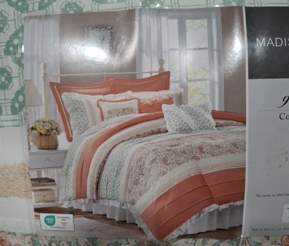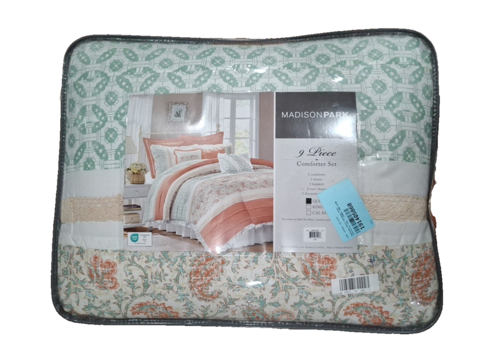 Bring soft elegance and vintage charm to your bedroom with the Madison Park Dawn 9-Piece Cotton Percale Comforter Set in Queen size . This beautifully detailed set features a shabby chic floral print in soft blues, grays, and whites, complemented by pintuck detailing and delicate embroidery. Made from 100% cotton percale , it's breathable, lightweight, and perfect for year-round comfort.