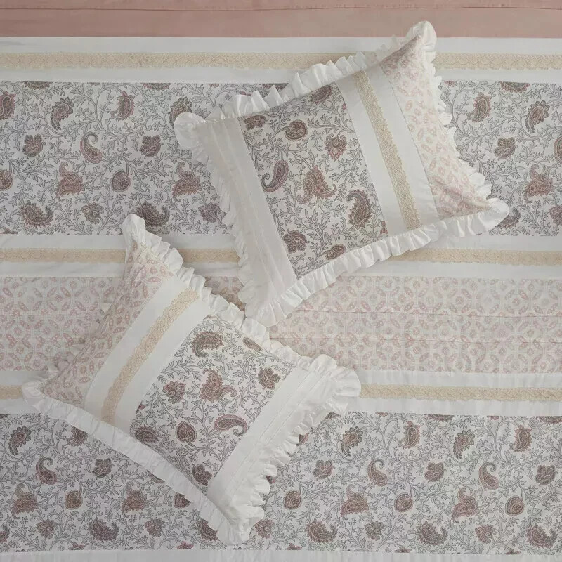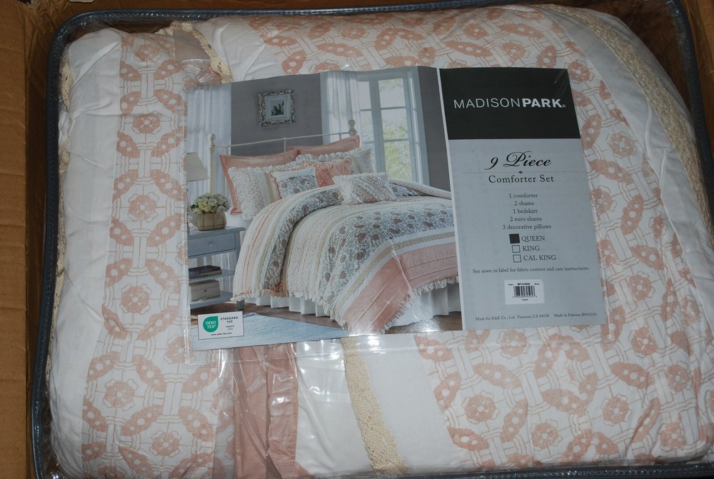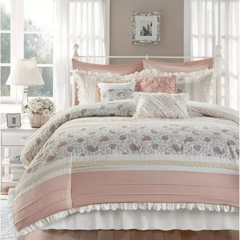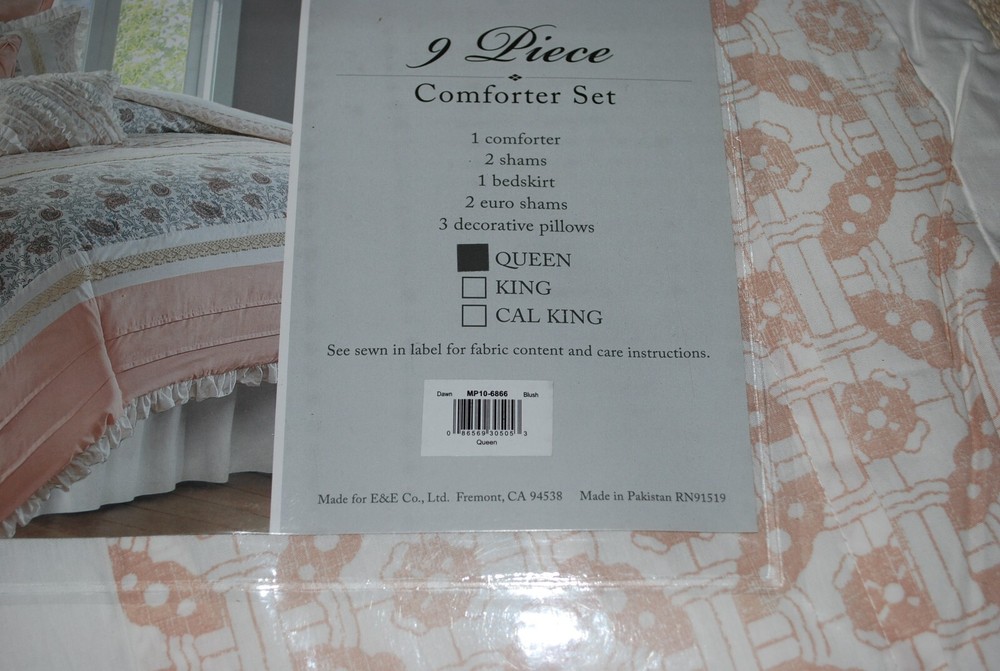 $449.84 INCREDIBLE SALE PRICE UNDER $100 Highlights Cottage and shabby chic comforter set in cotton fabrication Sophisticated elegance using pintucking, pieced and printed textile variety Soothing farmhouse bedroom decorating idea Lace taping embellishment for a feminine and shabby chic touch Pillows featuring pleating and ruching details Oeko-Tex Certified, includes no harmful substances or chemicals (# 7995CIT) Machine washable for easy care Number of Pieces: 9 Piece 1: Comforter: 90 Inches (L) x 90 Inches (W), Quantity 1 Piece 2: Pillow Sham: 26 Inches (L) x 20 Inches (W), Quantity 2 Piece 3: Bed Skirt: 80 Inches (L) x 60 Inches (W), Quantity 1 Piece 4: Decorative Pillow: 16 Inches (L) x 16 Inches (W), Quantity 1 Piece 5: Decorative Pillow: 18 Inches (L) x 12 Inches (W), Quantity 1 Piece 6: Decorative Pillow: 18 Inches (L) x 18 Inches (W), Quantity 1 Piece 7: Pillow Sham 26 Inches (L) x 26 Inches (W), Quantity 2 Closure Type: Pillow Sham: 4" Inner Envelope Fill Material: 100% Polyester Fabric Name: Percale Bedskirt Drop Length: 15 Inches Style: Comforter Bedding Sets Sheet Features: Pleated, Ruching Textile Material: 100% Cotton Backing Material: 52% Polyester, 48% Cotton Includes: 3 Decorative Pillows, 2 Standard Shams, 2 Euro Shams, Bed Skirt, Comforter Thread Count: 180 Industry or Government Certifications: STANDARD 100 by OEKO-TEX Fabric Weight Type: Midweight Fabric Flange Width: 2 Inches OEKO-TEX Certification Number: 7995CIT Care and Cleaning: Machine Wash, Tumble Dry If you have some inquires or problems, Please feel free to contact us. We will reply your email within 1 business day (except weekend). When delivery is delayed or items are damaged during delivery, please email us first before you leave feedback. Thank you. CR-W 380-111 20