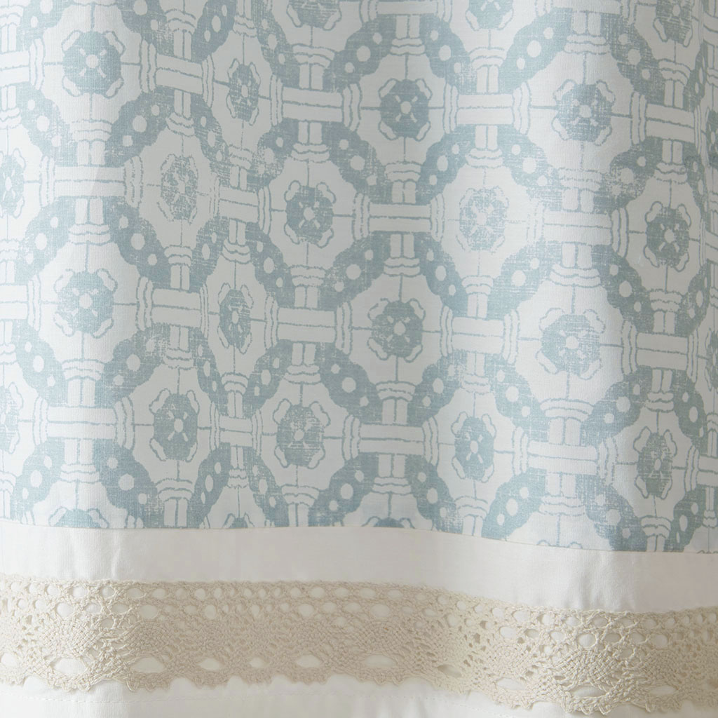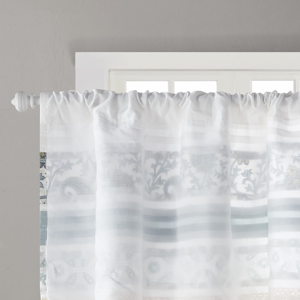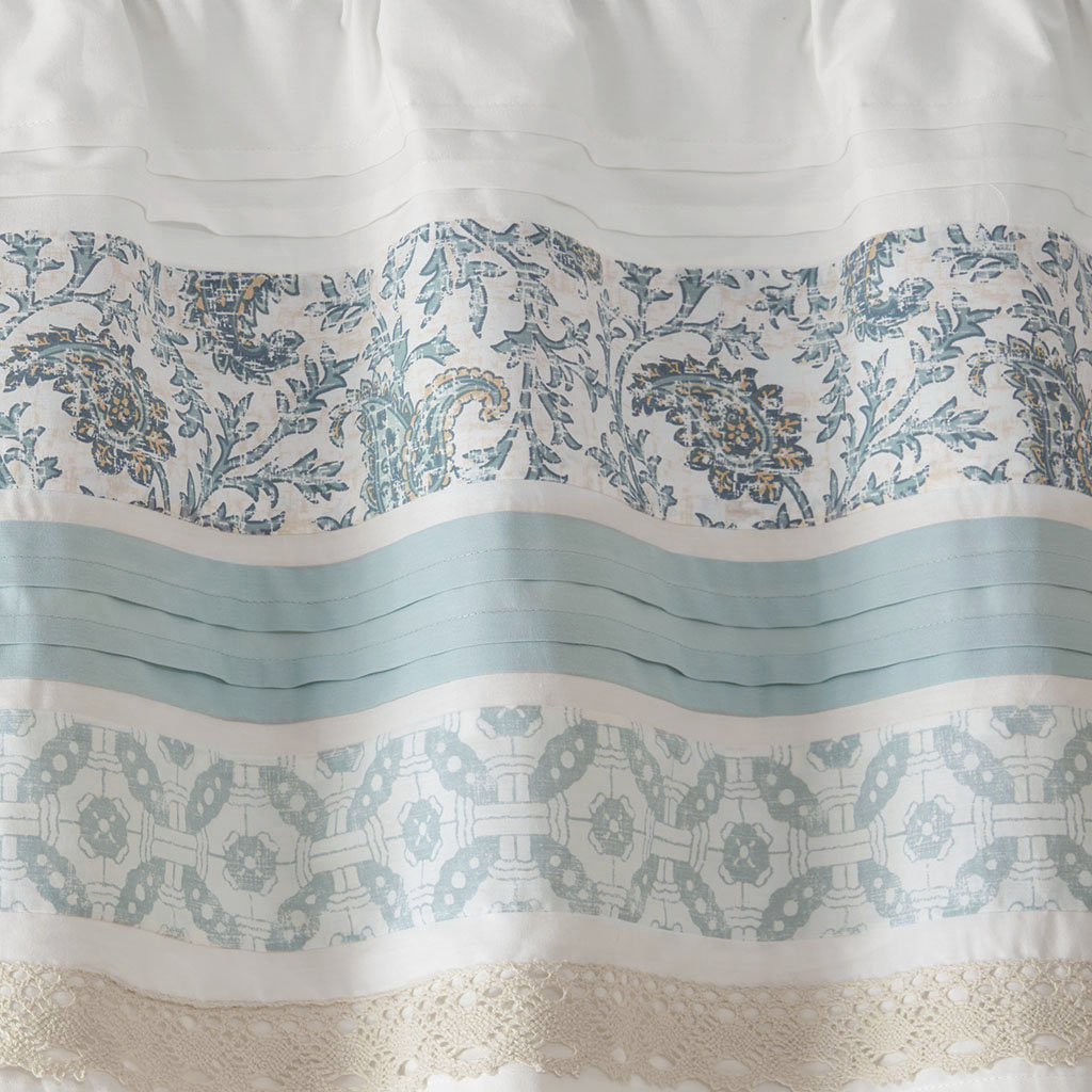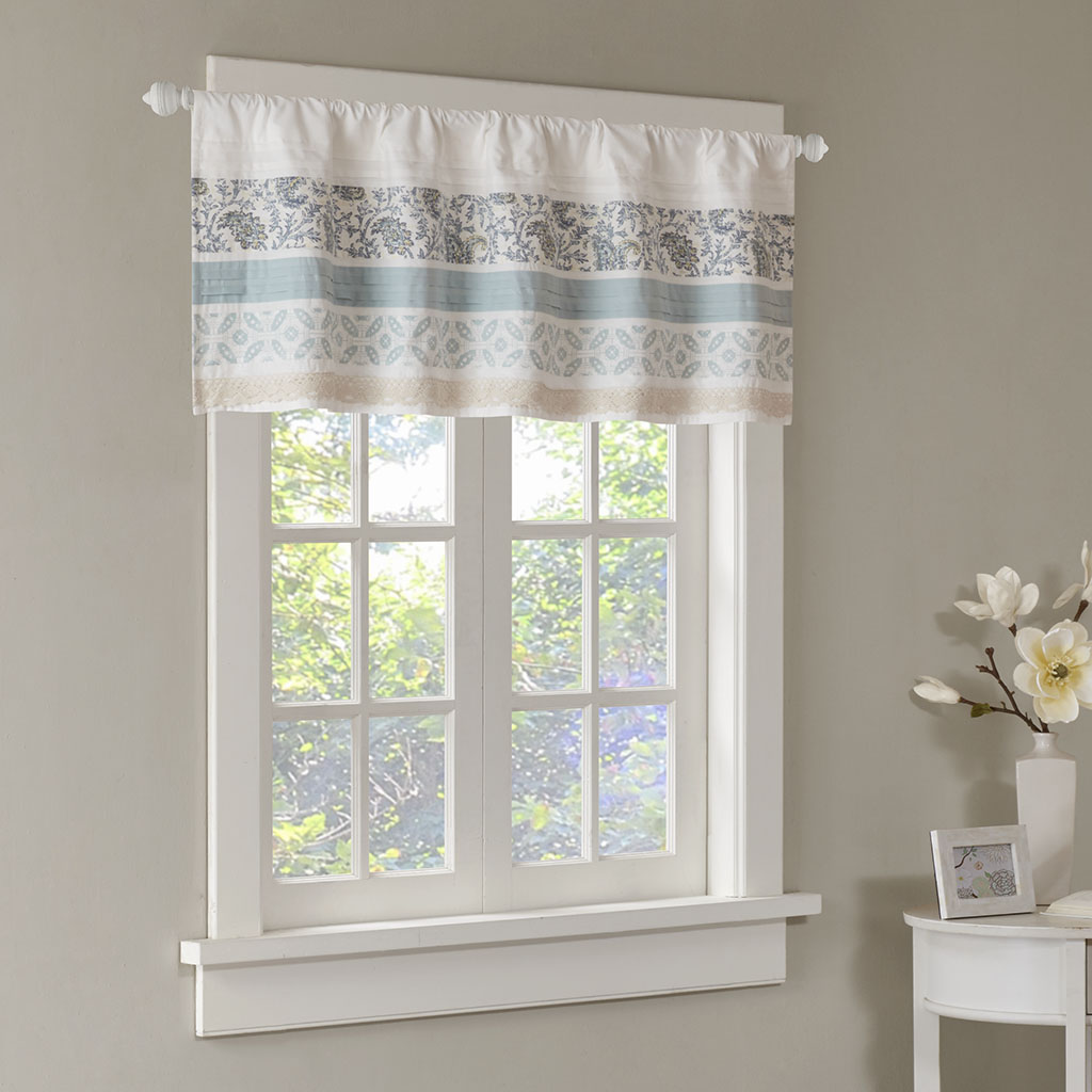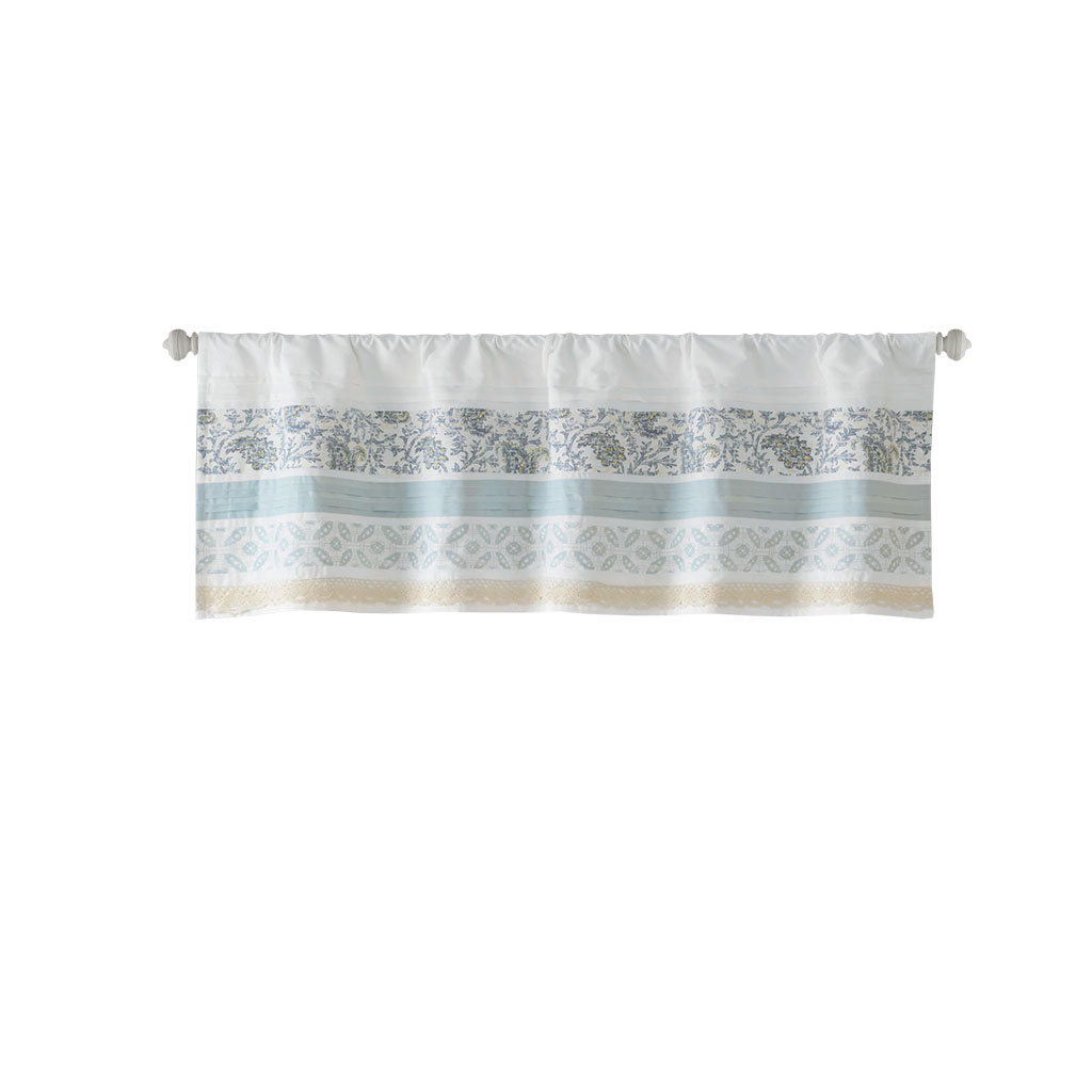 Madison Park Dawn Printed and Pieced Rod Pocket Valance DESCRIPTION Shabby chic in all the right ways, our Madison Park Dawn valance is the perfect update for any room. The paisley print and delicate pieced design showcases a soft color palette of aqua, periwinkle, and white hues, finished with a lace trim for additional charm and texture. The window valance is also OEKO-TEX certified, meaning it does not contain any harmful substances or chemicals, ensuring quality comfort and wellness. Made from 100% cotton for natural appeal, this valance features a rod pocket that fits up to 1.25" diameter rod. Complete the look with coordinating kitchen tiers or perfect on its own for small windows or layering. Complete the set with coordinate kitchen tier, bedding and shower curtain available and sold separately. FEATURES • Cottage and shabby chic valance in 100% cotton fabric • Sophisticated elegance using pintucking, pieced and printed textile variety • Lace taping embellishment for a feminine and shabby chic touch • Rod pocket fits up to 1.25" diameter rod • Oeko-Tex Certified, includes no harmful substances or chemicals (# 7995CIT) • Coordinate kitchen tier, bedding and shower curtain available and sold separately MATERIAL Cotton T180 CARE INSTRUCTIONS Machine Washable Available Size (In Inches): 50x18" Size: Includes 1 Window Valance measuring 50"W x 18"L.