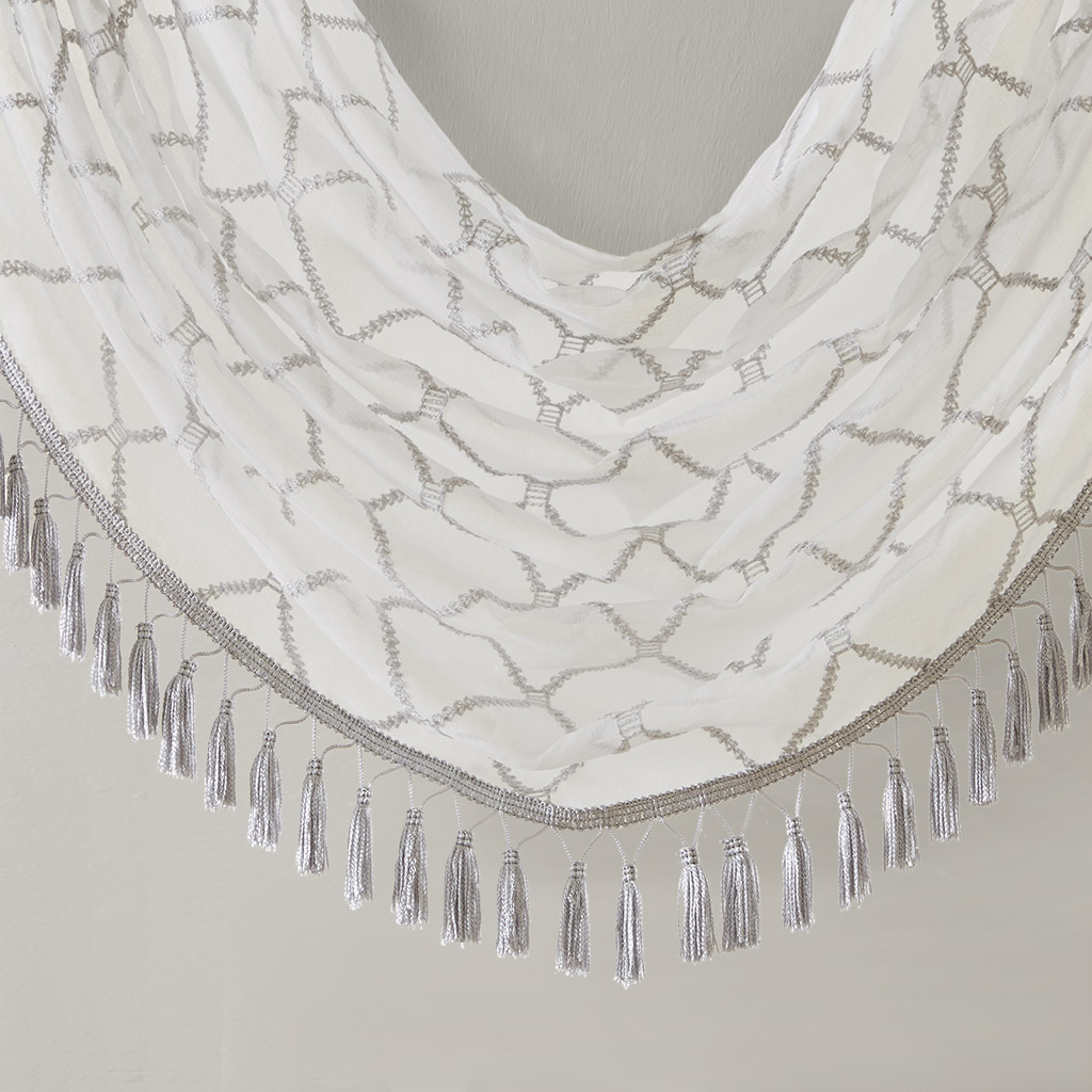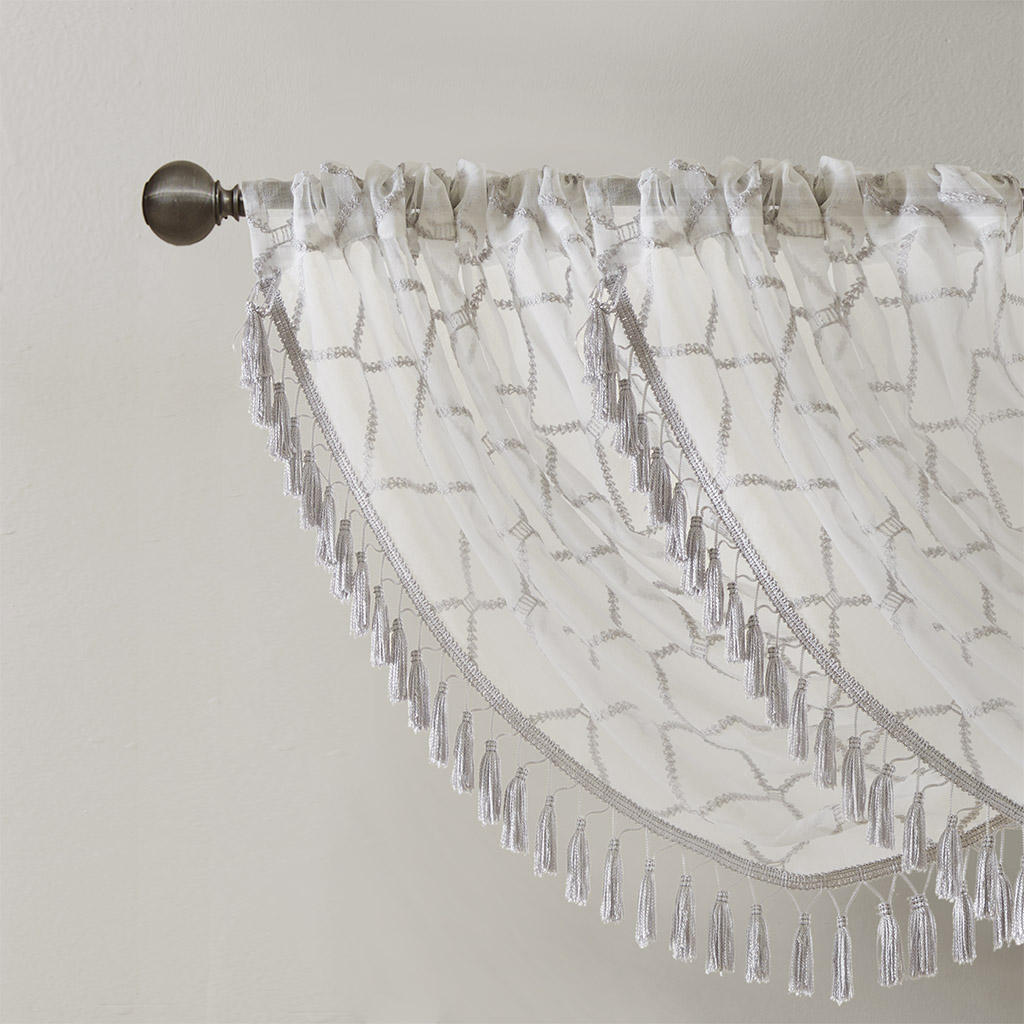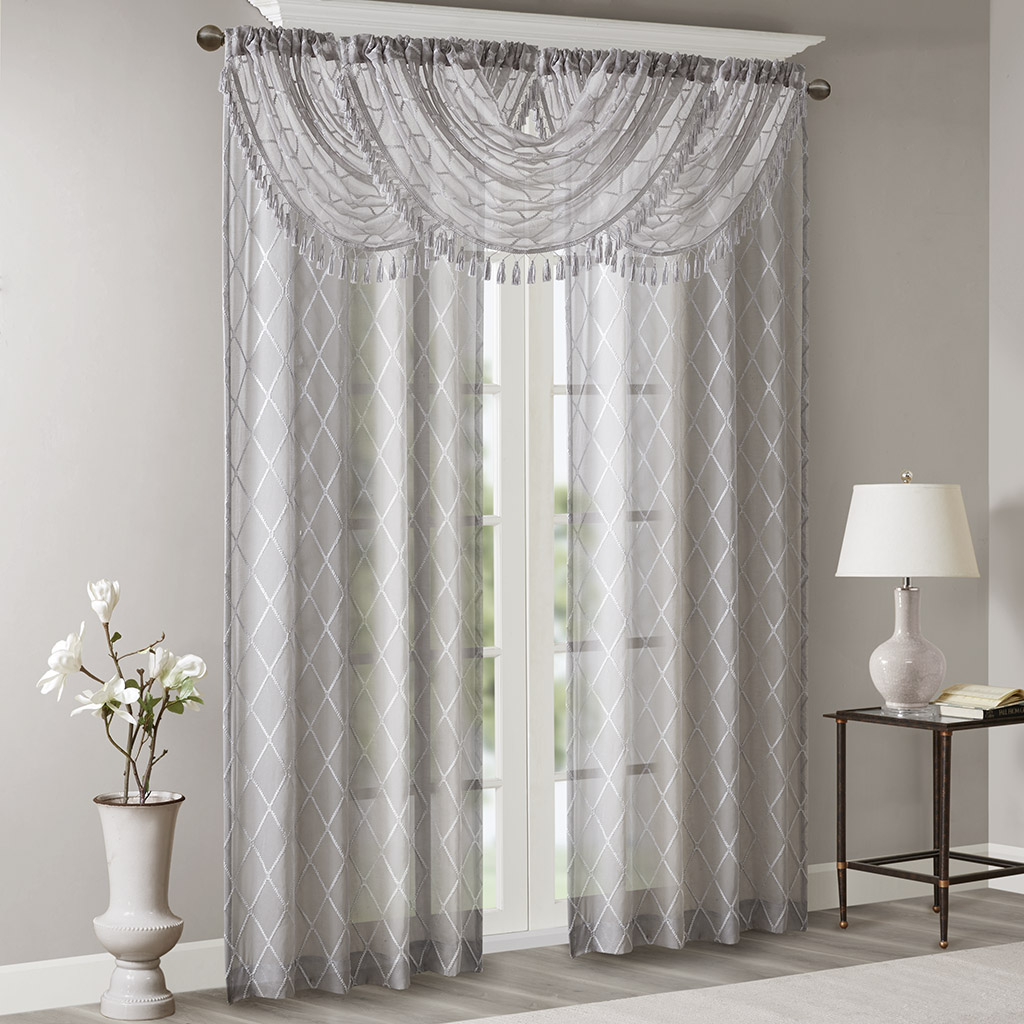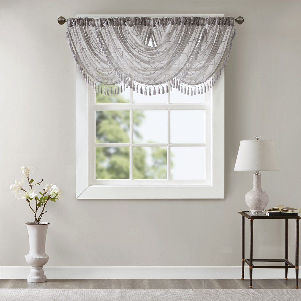 Madison Park Irina Diamond Sheer Embroidered Waterfall Valance DESCRIPTION Madison Park’s Irina Diamond Sheer Waterfall Valance provides an alluring update to your home. An elegant diamond pattern is beautifully embroidered on a soft sheer fabric, adding grace and charm to your décor. The neutral colors and light fabric helps create a delicate look to soften any room, combined with the beautiful tassel trim and rich draping details, makes this the perfect dressing to any window. Complete the look with coordinating window panels, sold separately. Multiple valances used to create this look. FEATURES All over diamond embroidery design Lightweight sheer base fabric Rod pocket top finish Trim embellishment detailing Center waterfall draping detail MATERIAL 100% Polyester Sheer CARE INSTRUCTIONS Machine Washable Available Sizes (In Inches): 4 46x38" Size: Includes 1 Window Valance measuring 46"W x 38"L.