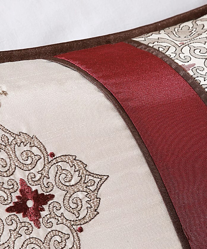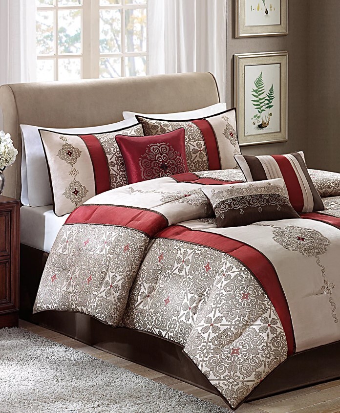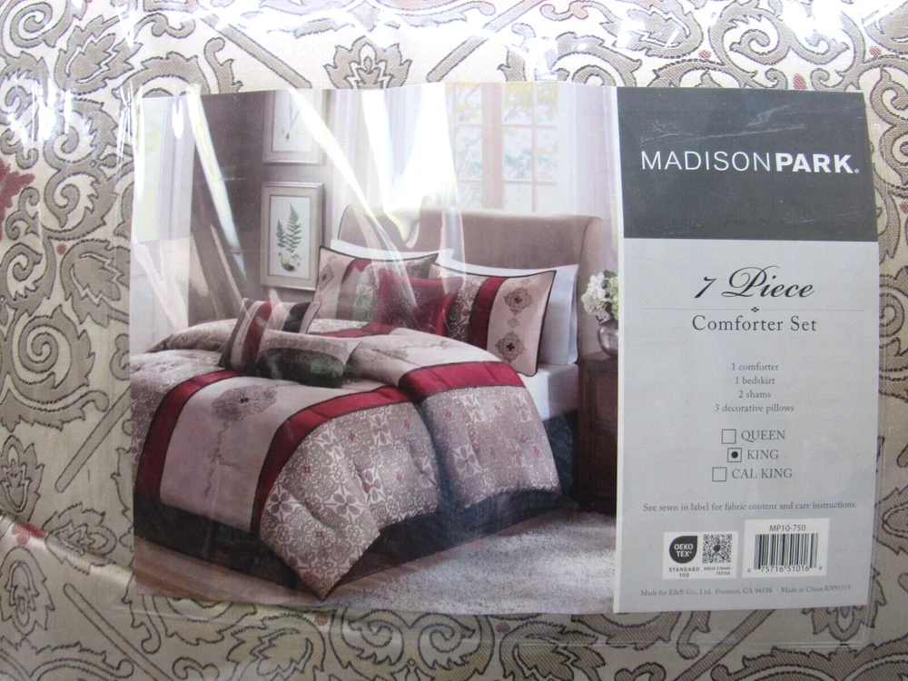 Madison Park Donovan 7-Pc. Medallion Jacquard Red King T4103978 Retail $270 Instantly elevate any bedroom's look and feel with the elegant medallion jacquard, pieced accents and embroidered detailing of this luxe Donovan comforter set from Madison Park. Set includes: king comforter (104" x 92"), king bed skirt (78" x 80" + 15"), two king shams (20" x 36") and three decorative pillows (12" x 18", 16" x 16", 18" x 18") Fabric and fill: polyester Medallion jacquard with pieced and embroidered accents; reverses to solid brushed ground Asian American & Pacific Islander Owned, Woman Owned Machine washable Imported