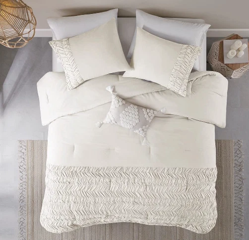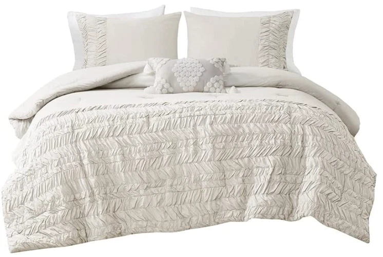 Give your bedroom a bold and fresh look with this bedding set. This silky, soft sheet offer a restful sleeping experience submerged in luxurious fabrics and colors. Give your bedroom the attention that it deserves with this bedding set. This bedding set enhance the beauty and functionality of your bedroom. Features Style: Shabby Chic Pattern: Doreen Color: White Material: Cotton solid with ruched face, cotton solid back comforter and shams, 8oz/sq yard polyester filling, cotton cover with poly fill pillow Product Size: Full/Queen : 90"W x 90"L/20"W x 26"L(2)/12"W x 18"L