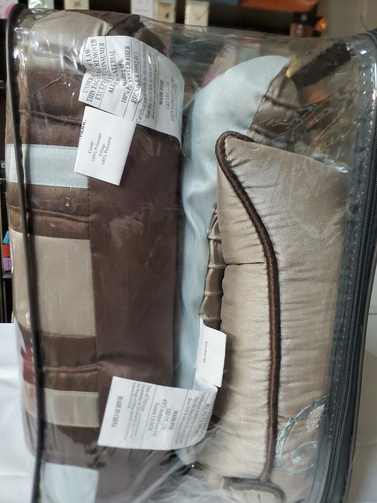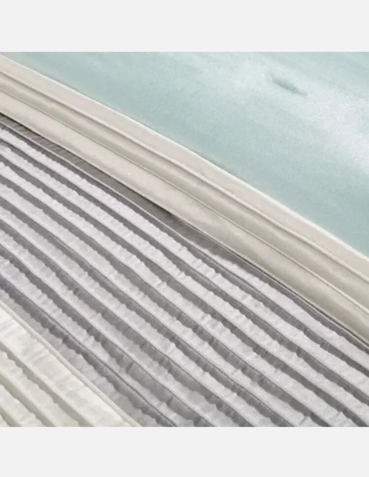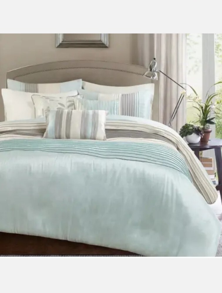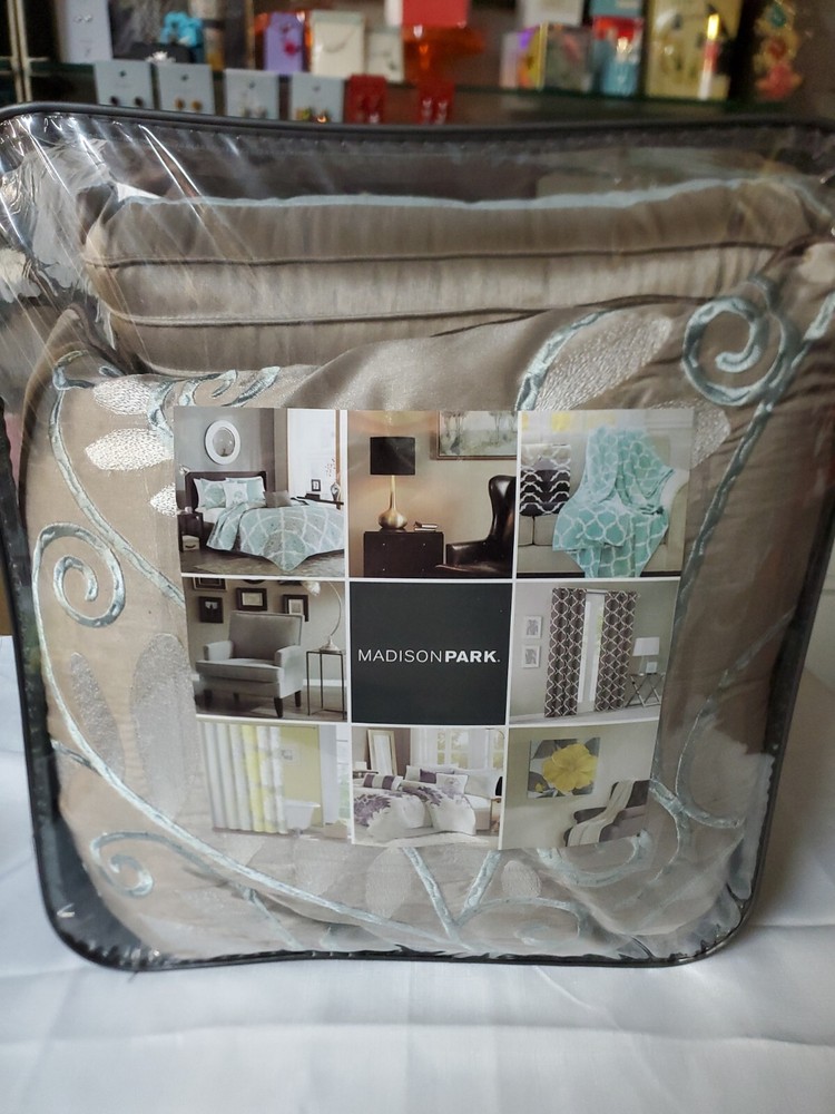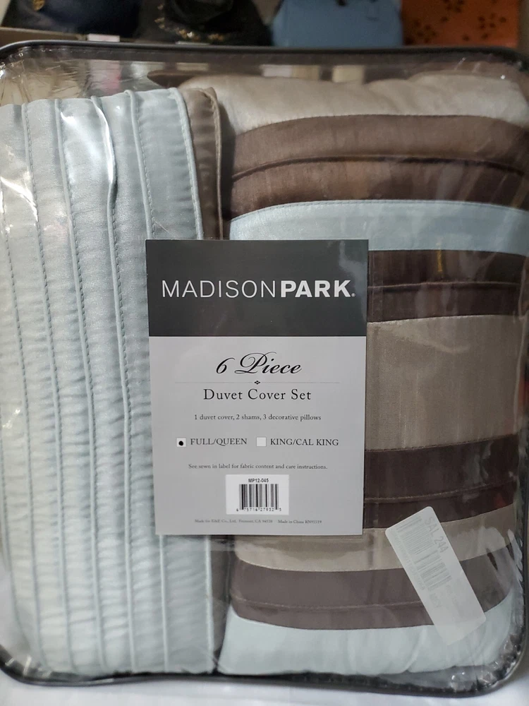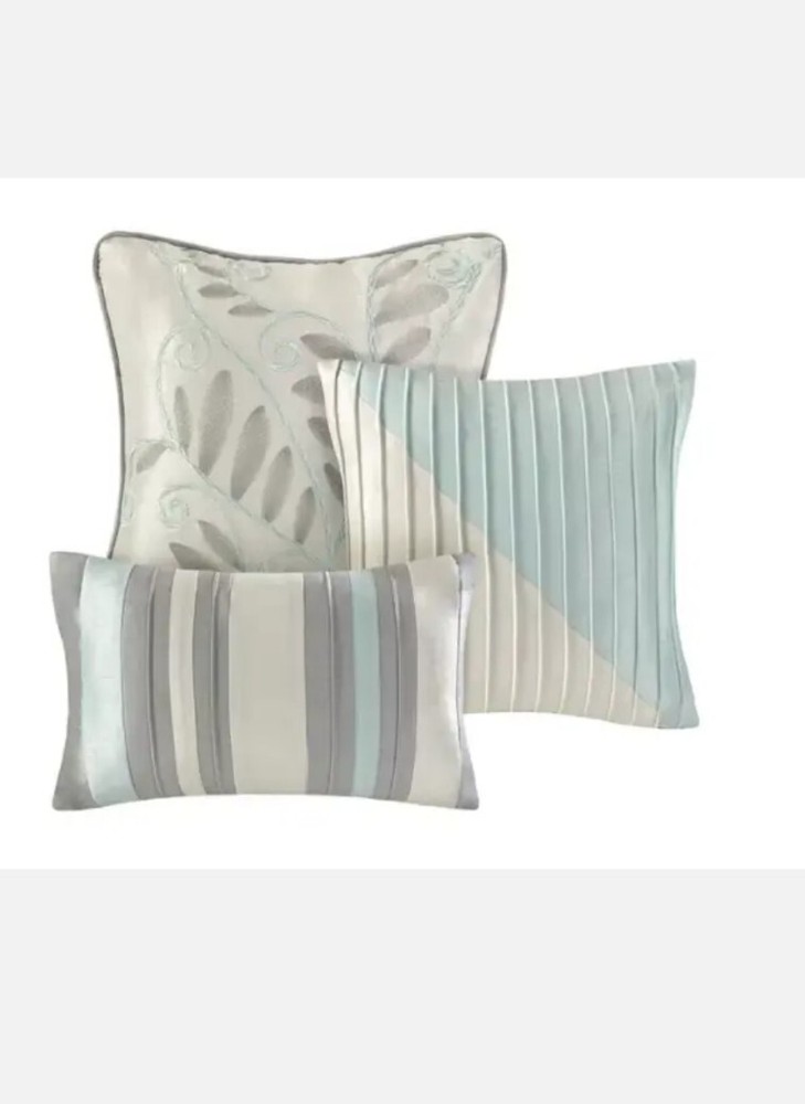 Madison Park Eastridge 6-piece Duvet Cover Set Full / Queen Aqua Blue. NEW. The elegant pintuck details combined with leaf, scroll and striped accents on this Madison Park Eastridge duvet cover set add a chic touch to your bedroom decor. FEATURES 6 pieces FULL / QUEEN 6-PIECE SET Duvet cover: 90" x 90" Two shams: 20" x 26" Oblong pillow: 12" x 20" Small square pillow: 16" x 16" Large square pillow: 18" x 18" CONSTRUCTION & CARE Polyester Machine wash Imported