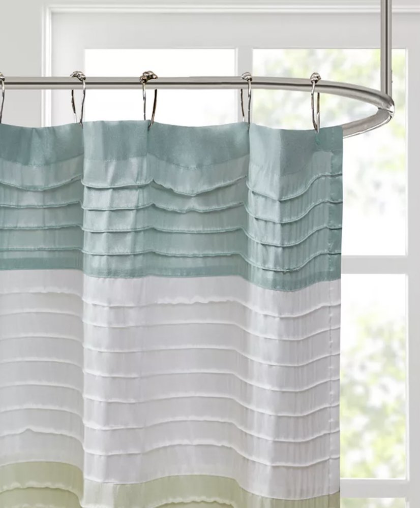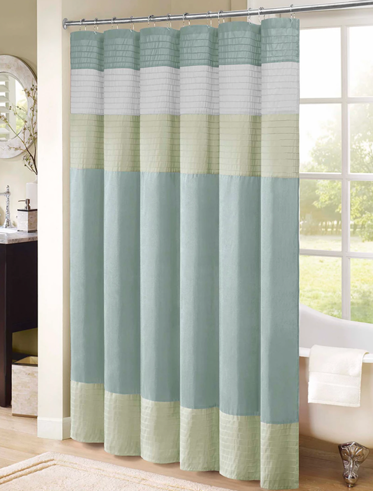 Madison Park Eastridge Faux Silk Colorblock 72x72 Shower Curtain L93808 Details & Care Give any bath a fresh modern look and feel with the subtly textured faux silk, cool contemporary tones and stylish colorblocked design of this Amherst shoer curtain from Madison Park. -Dimensions: 72" x 72" -Faux-silk fabric: polyester -Each shower curtain sold individually -Shower curtain features piecing and pintucking details -Machine washable -Imported