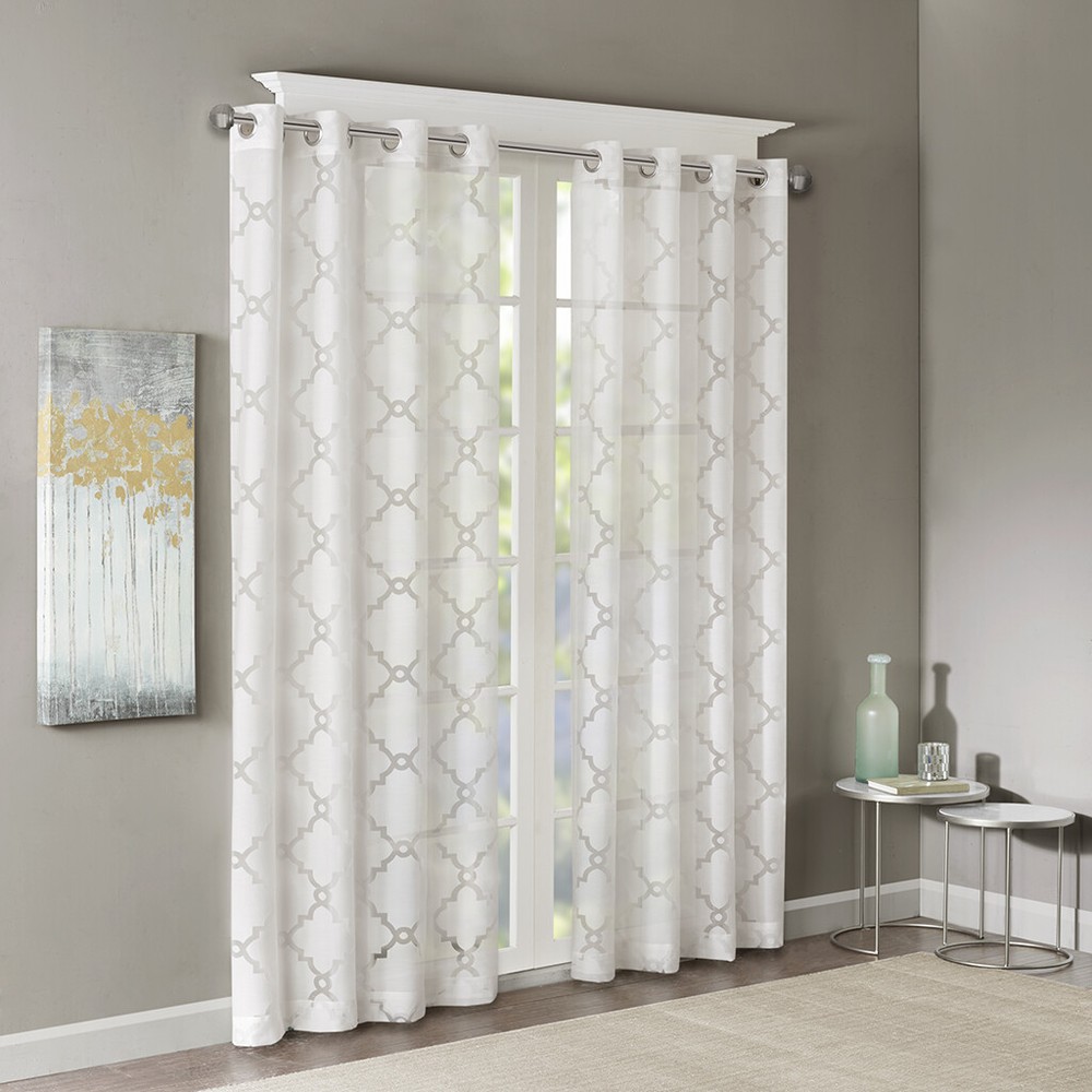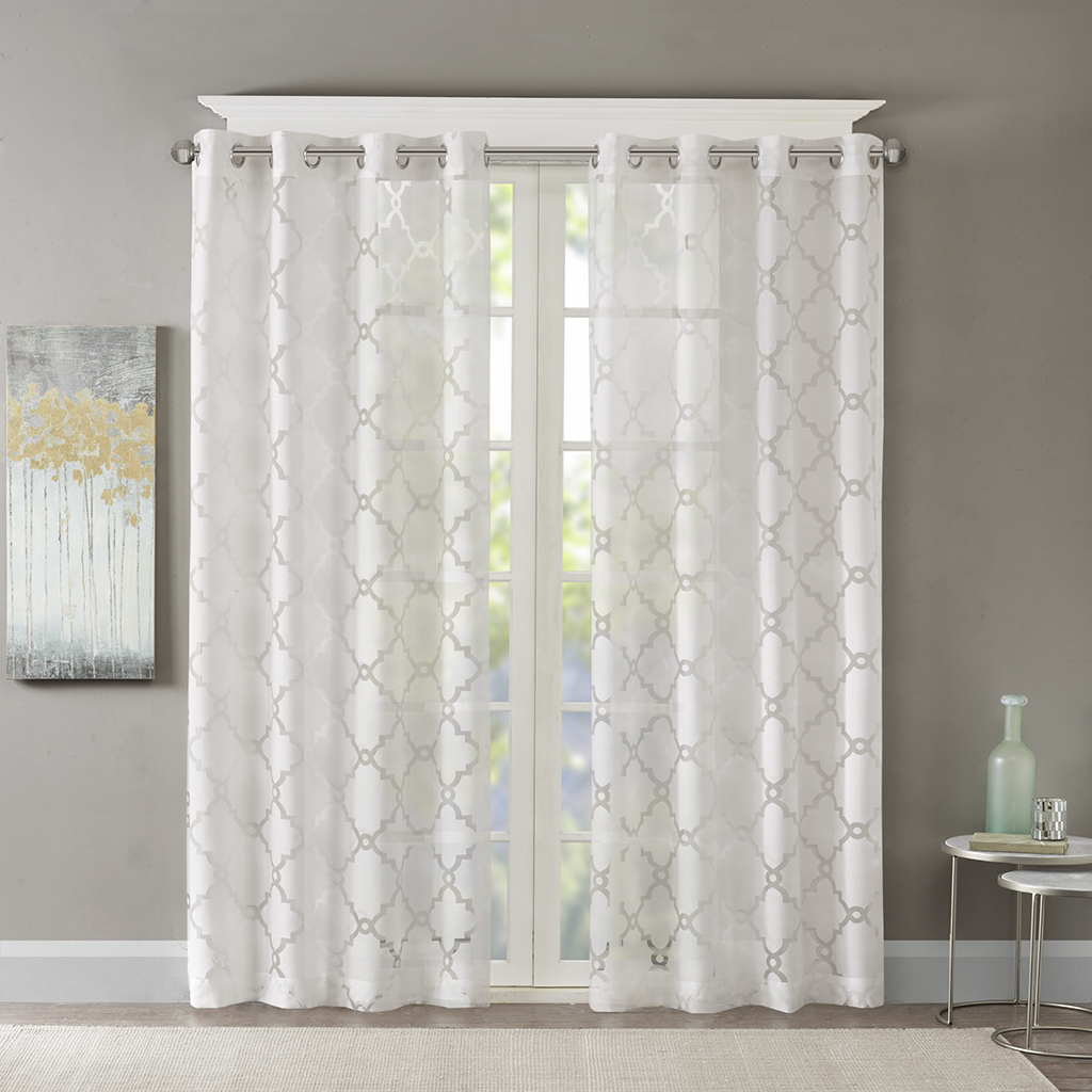 Store Categories Store Categories Bedding Comforters Decorative Pillows Duvet Covers Quilts & Coverlets Sheets Blankets & Throws Mattress Pads Pillows Home Decor Window Treatments Wall Art Home Accents Furniture Beds Dining Seating Ottomans & Benches Accent Chairs Accent Tables Dining Tables Sofas Bath Bath Robes Shower Curtains Towels Bath Rugs Bath Accessories Apparel Pajama Sets Nightgowns Rugs Rugs & Carpets Lighting Lamp Pendant Other Product Overview Details DESCRIPTION Stylish yet delicate, the Madison Park Eden Fretwork Sheer Curtain will update and soften any room. The lightweight sheer fabric features a burnout fretwork design on a grey ground, for a dimensional and airy look. Finished with a grommet top detail making it easier to hang, open, and close panels throughout the day. Fits up to 1.25” diameter rod. FEATURES • All over burnout fretwork window curtain panel • Single piece item measures 50" wide; Recommended 2 pieces for standard coverage • Silver grommet top that fits up to 1.25 inches in diameter rod • Lightweight sheer and see through fabric • Great for layering curtain as the second panel • Machine washable MATERIAL 38% polyester 62% Rayon; CARE INSTRUCTIONS Machine Wash Available Sizes (In Inches): 50x63" Size: Includes 1 Panel measuring 50x63". 50x84" Size: Includes 1 Panel measuring 50x84". 50x95" Size: Includes 1 Panel measuring 50x95". Bedding Comforters Decorative Pillows Duvet Covers Quilts & Coverlets Sheets Blankets & Throws Mattress Pads Pillows Home Decor Window Treatments Wall Art Home Accents Furniture Beds Dining Seating Ottomans & Benches Accent Chairs Accent Tables Dining Tables Sofas Bath Bath Robes Shower Curtains Towels Bath Rugs Bath Accessories Rugs Rugs & Carpets Lighting Lamp Pendant Product Overview Product Details DESCRIPTION Stylish yet delicate, the Madison Park Eden Fretwork Sheer Curtain will update and soften any room. The lightweight sheer fabric features a burnout fretwork design on a grey ground, for a dimensional and airy look. Finished with a grommet top detail making it easier to hang, open, and close panels throughout the day. Fits up to 1.25” diameter rod. FEATURES • All over burnout fretwork window curtain panel • Single piece item measures 50" wide; Recommended 2 pieces for standard coverage • Silver grommet top that fits up to 1.25 inches in diameter rod • Lightweight sheer and see through fabric • Great for layering curtain as the second panel • Machine washable MATERIAL 38% polyester 62% Rayon; CARE INSTRUCTIONS Machine Wash Available Sizes (In Inches): 50x63" Size: Includes 1 Panel measuring 50x63". 50x84" Size: Includes 1 Panel measuring 50x84". 50x95" Size: Includes 1 Panel measuring 50x95".