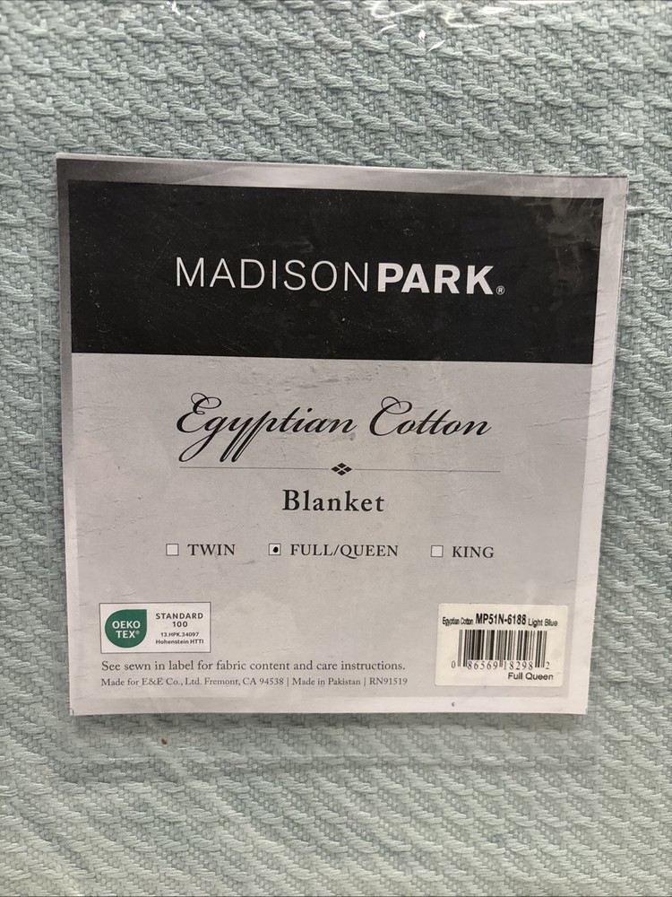 This is a Madison Park Egyptian Cotton Full Queen Blanket in Light Blue. It is a solid color, rectangular-shaped blanket made of Egyptian cotton with a thread count between 201-400. The blanket is suitable for all seasons, has a GSM of 150 to 300, and is machine washable. It features OEKO TEX Standard 100 certification and measures 84 inches in length and 96 inches in width. The closure type is not specified.NWT