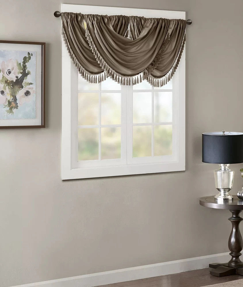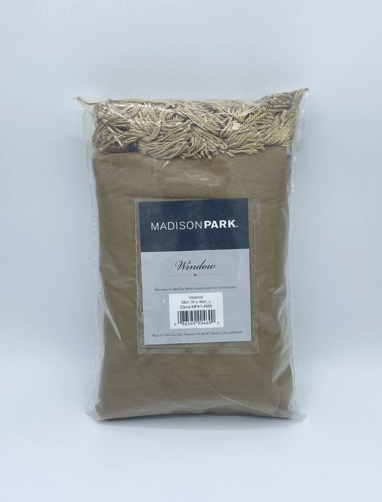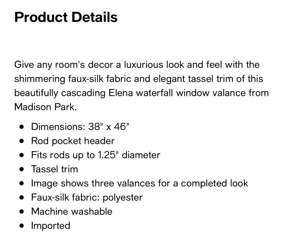 Madison Park Elena Waterfall Rod Pocket Faux-Silk Valance, 38" x 46". Brand new, packaging has some sticker residue but Valence is still in new condition. Retail: $74.00