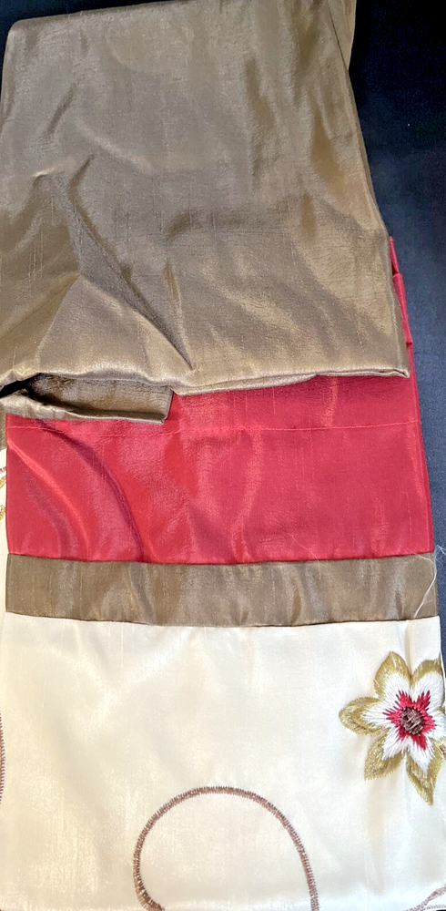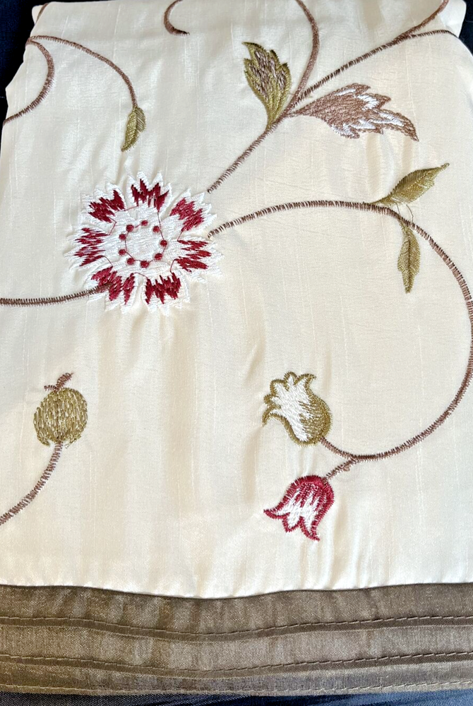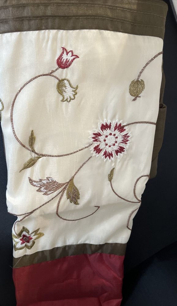 Introduce style and color to your home decor with this Madison Park Embroidered Curtain Panel. The panel, measuring 50 inches wide by 84 inches long, features a beautiful Belle pattern with colorful embroidery flowers and stems. The tan with brown and burgundy trim panel is made of 100% polyester and has a light filtering property that is perfect for any room. The rod pocket and/or back tabs, curtain heading makes for easy wall mounting. Care instructions are simple as it is machine washable. Sold as a single panel, this modern style curtain will add a touch of elegance to your home. TRI COLOR, REDS, BROWN AND TANS