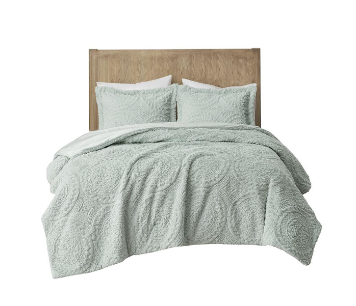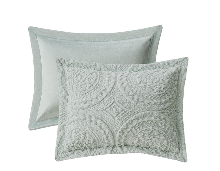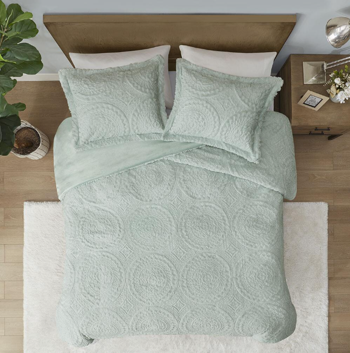 DESCRIPTION Transform your bedroom with the elegant style of Madison Park’s Arya Medallion Faux Fur Comforter Mini Set. The rich aqua comforter and matching sham feature an embroidered medallion design on the ultra-soft plush fabric. Machine washable for easy care, this comforter set makes a stunning addition to your home. FEATURES • Faux fur comforter features an embroidered medallion pattern • Reverse is a soft faux mink • Hypoallergenic fill for comfort and wellness • Set includes comforter and two matching shams (1 in Twin) • Machine wash separately in large capacity washer with cold water on gentle cycle, do not use fabric softener or bleach • Tumble dry separately in large capacity dryer on low heat • Minor shedding is expected with faux fur material and should subside after 3-4 washes MATERIAL Comforter: 100% Polyester Embroidered Long fur on face 100% Polyester Solid Mink on Back Poly Fiber Filling Jump Tack Stitched w/ Knife Edge Sham: 100%polyester Embroidered Long fur on face 100%polyester Solid Mink on Back Zipper on the back open W/ 2" Flange Set include: 1 Comforter: 90"W x 90"L, 2 Standard Shams: 20"W x 26"L + 2"D
