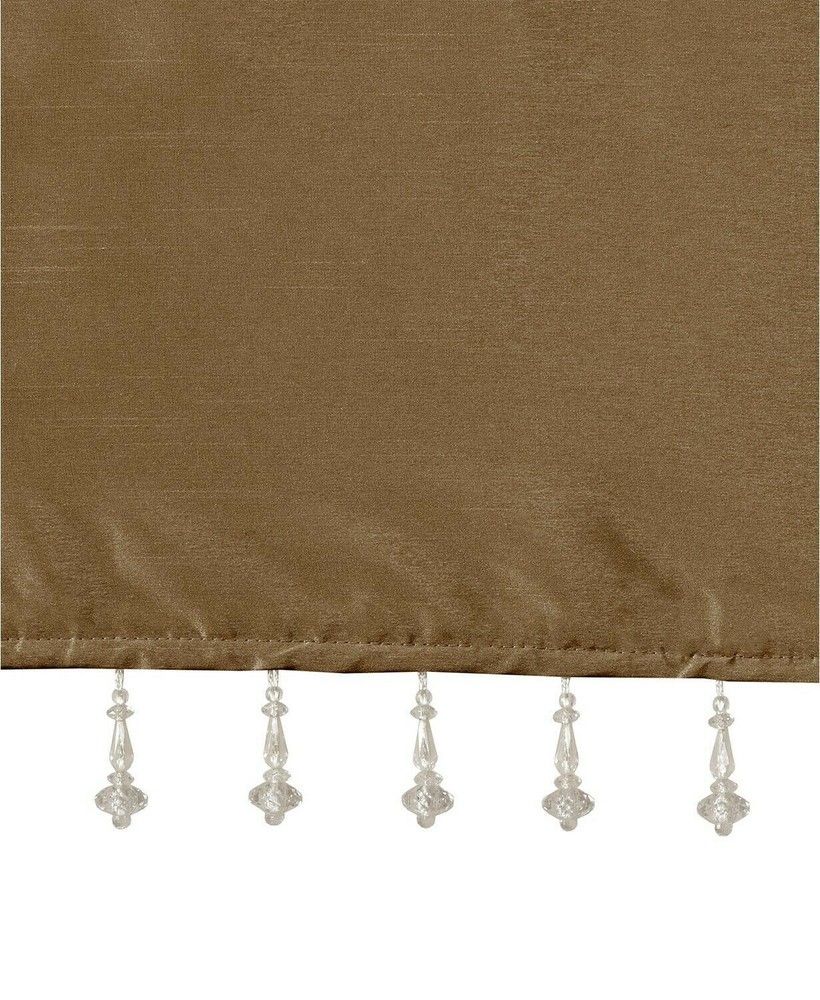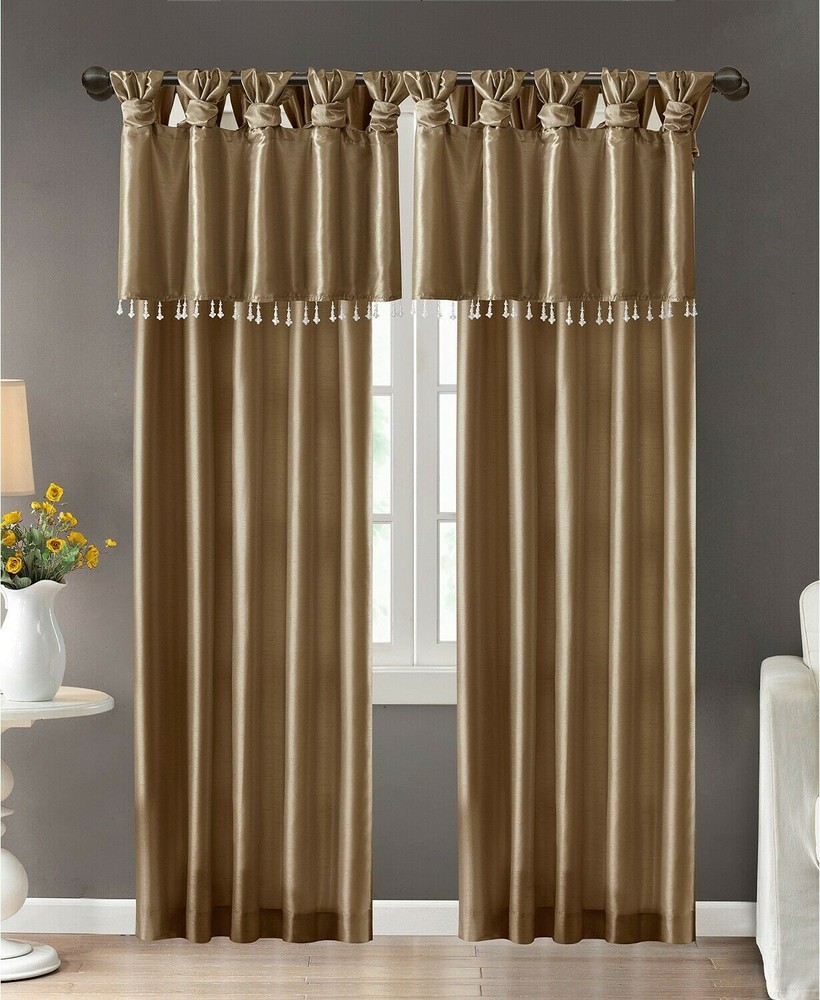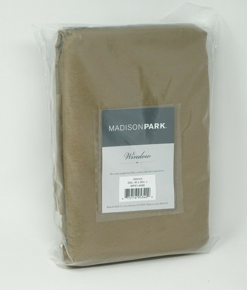 * Color: Bronze * Size: 50" x 26" Maximize and room's style and privacy with the shimmering faux silk and lined design of the Emilia twisted tab window valance from Madison Park. ** Dimensions: 50" x 26" ** Twisted tab top ** Fits rods up to 2" diameter ** Beaded fringe trim ** NOTE: photo displays two panels and valance for a finished look, but this item contains only 1 valance. Panels and valances are sold separately ** Polyester ** Machine washable ** Imported
