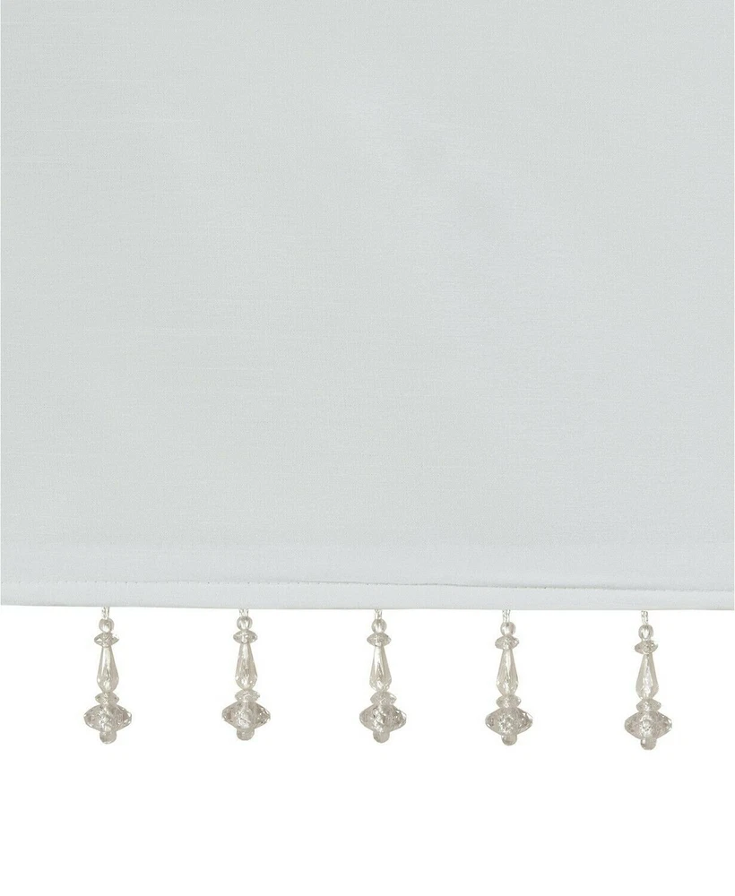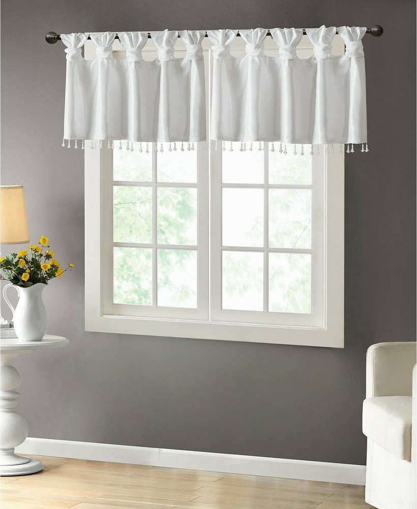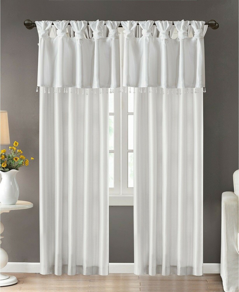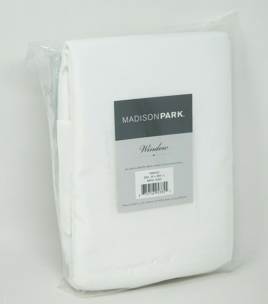 * Color: White * Size: 50" x 26" Maximize and room's style and privacy with the shimmering faux silk and lined design of the Emilia twisted tab window valance from Madison Park. ** Dimensions: 50" x 26" ** Twisted tab top ** Fits rods up to 2" diameter ** Beaded fringe trim ** NOTE: photo displays two panels and valance for a finished look, but this item contains only 1 valance. Panels and valances are sold separately ** Polyester ** Machine washable ** Imported