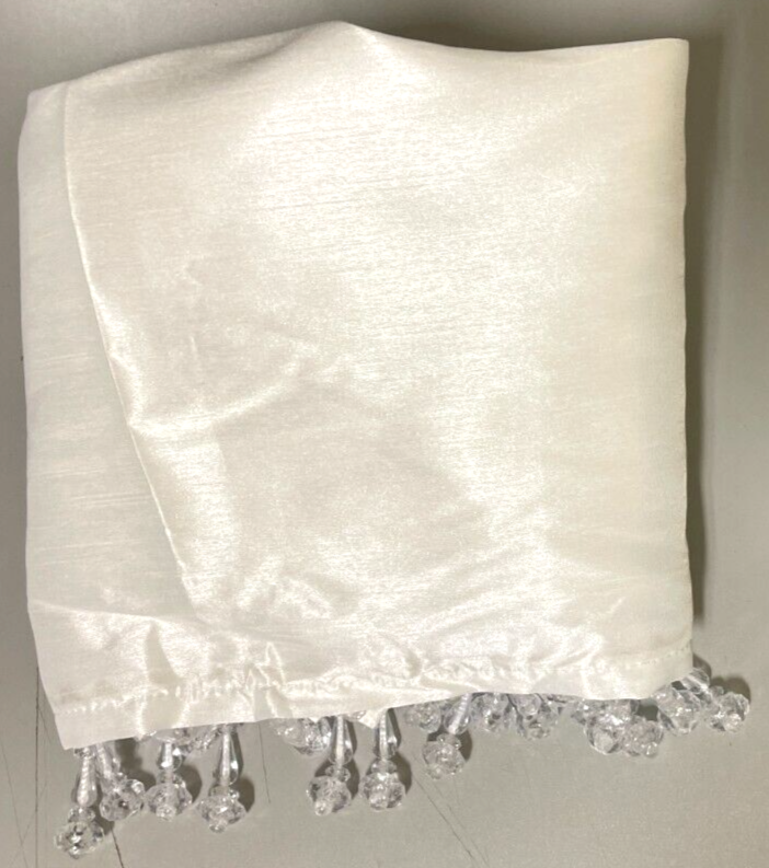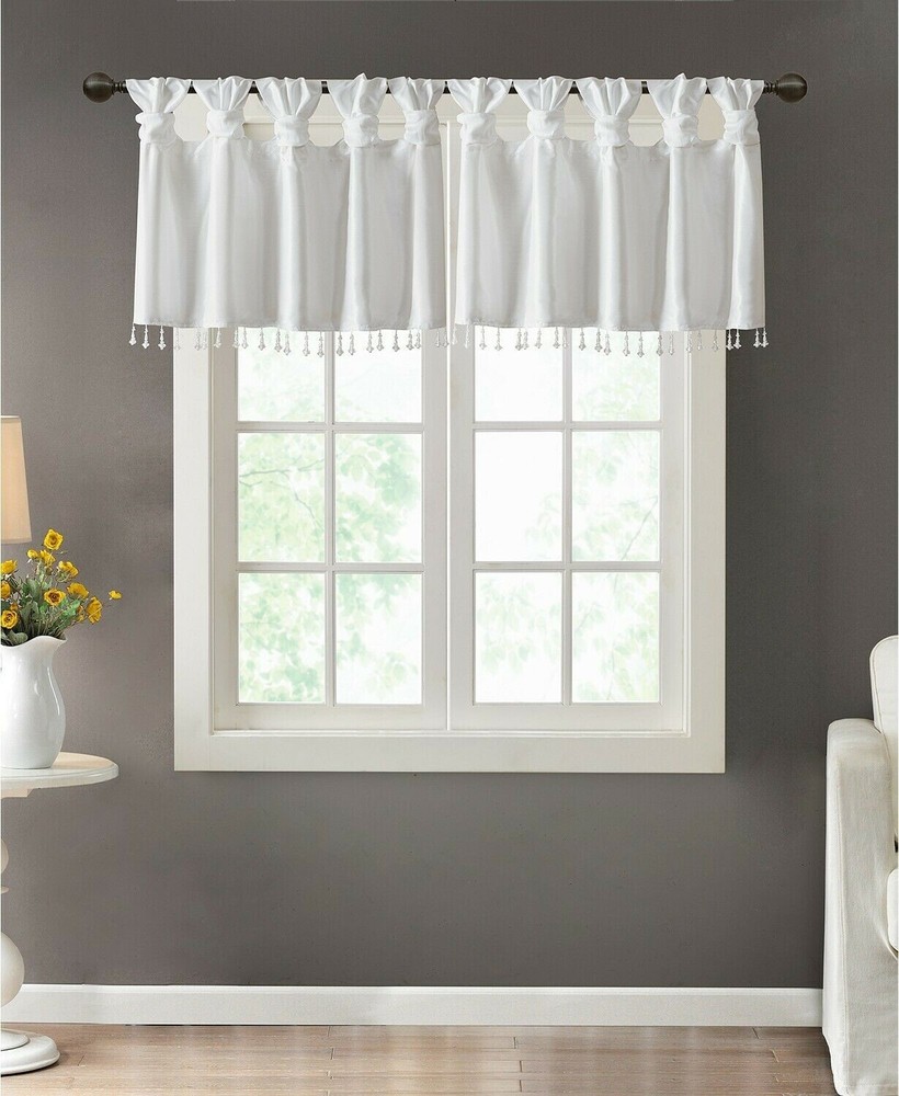 Brand New - No Packaging Color: White Size: 50" x 26" Maximize and room's style and privacy with the shimmering faux silk and lined design of the Emilia twisted tab window valance from Madison Park. ** Dimensions: 50" x 26" ** Twisted tab top ** Fits rods up to 2" diameter ** Beaded fringe trim ** NOTE: photo displays two panels and valance for a finished look, but this item contains only 1 valance. Panels and valances are sold separately ** Polyester ** Machine washable ** Imported