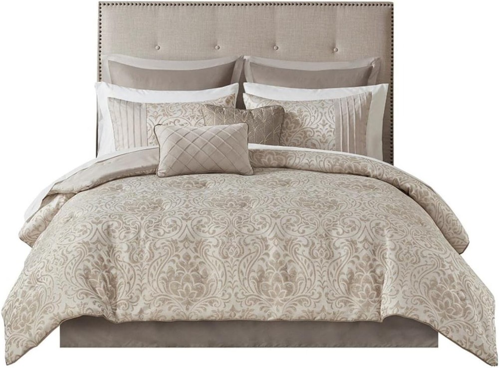 ***Item Description:*** About this item Polyester Jacquard Polyester Filling Microfiber Sheet Set The jacquard comforter and shams feature gold metallic thread woven into the all-over damask pattern, for a sophisticated look Emilia 12 Piece Jacquard Comforter Set with sheet set, bed skirt, euro shams and 2 toss pillows for your entire bed ensemble Enjoy the soft microfiber that is an ultra-fine fiber, lightweight and durable fabric for all season comfort Set include: 1 Comforter: 90"W x 90"L, 2 Standard Shams: 20"W x 26"L, 1 Bedskirt: 60"W x 80"L + 15"D, 2 Euro Shams: 26"W x 26"L + 1"D, 1 Flat sheet: 92"W x 102"L, 1 Fitted sheet: 60"W x 80"L + 14"D, 2 Pillowcases: 20"W x 30"L, 1 Decorative Pillow: 12"W x 18"L, 1 Decorative Pillow: 18"W x 18"L Care Instructions: Machine washable for easy care; comforter set may come in rolled or compressed packing and will need to be fluffed up Use a steam iron to help remove wrinkles easier