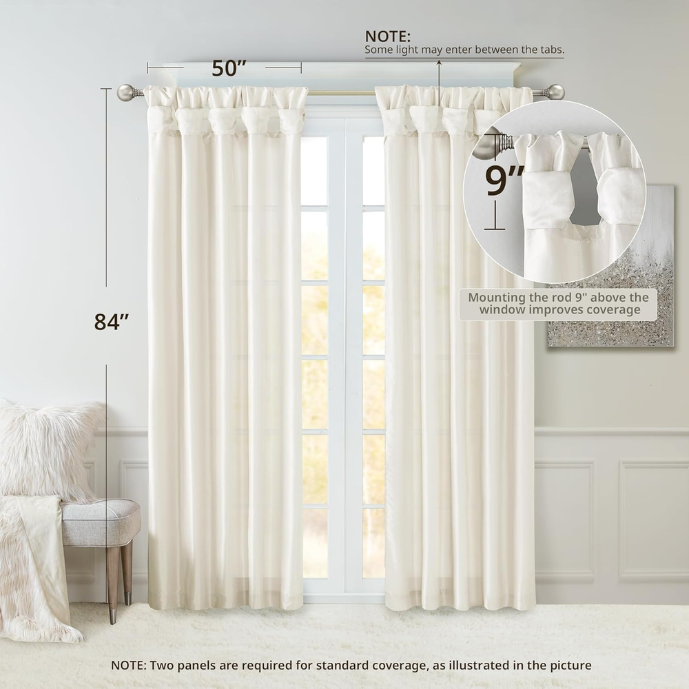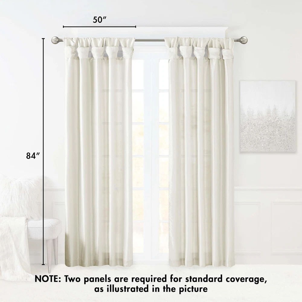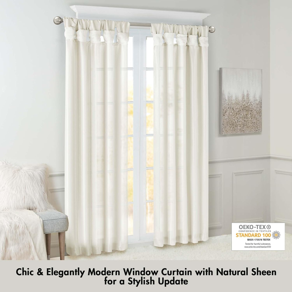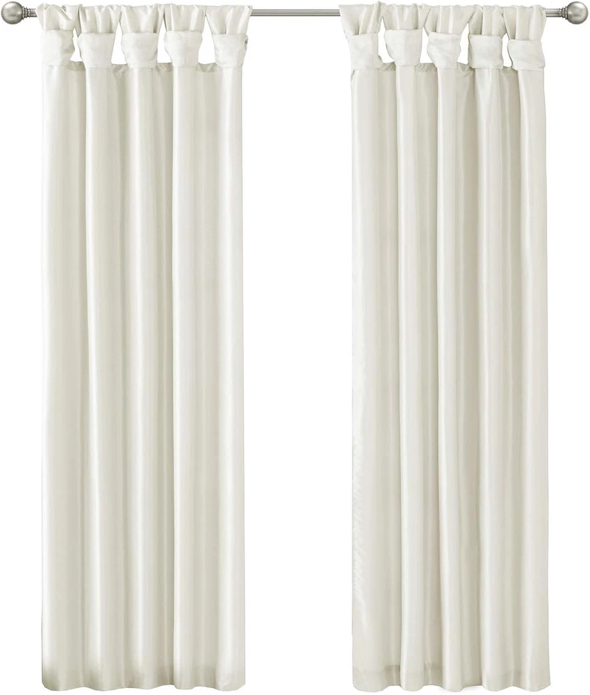 Madison Park Emilia Faux Silk Single Curtain with Privacy Lining, DIY Twist Tab Top, Room Darkening Window Drape for Living Room, Bedroom and Dorm, 84"L x 50"W, White 100% Polyester Faux Silk, Polyester Lining NEW & TRENDY - Give your home a decorator’s touch with the Madison Park Emilia Window Curtain. Made from a faux silk fabric, this elegant window curtain features a DIY twist tab top. the luxurious sheen and rich navy tone provides a touch of sophistication to your decor. Easy to hang, this twist tab top curtain turns any room into a gorgeous getaway. PRIVACY – These living room curtains feature a back lining for enhanced privacy and improved drapability. The lining also boosts their ability to dim incoming light, creating a cozy room-darkening effect for a more inviting ambiance TWISTED TAB - This elegant bedroom window curtain features a DIY twist tab top finish that not only creates rich, deep folds for a professional look, but also makes this panel easy to hang, open and close MEASUREMENT - 1 Window Panel: 50"W x 84"L. Fits up to a 2" rod. As shown in the image - For standard coverage, purchase 2 panels. Some light may enter between the tabs due to the design. Install the rod 9” higher for better coverage CARE - Machine wash cold on gentle cycle, tumble dry on low heat, wash alone, do not bleach Give your home a decorator’s touch with the Madison Park Emilia Window Curtain. Made from faux silk fabric, this elegant window curtain features a DIY twist tab top finish that creates rich, deep folds for a professional look. The added lining enhances privacy, offers a fuller appearance, and improves the curtain’s ability to darken the room, creating a cozier, more serene ambiance. The luxurious sheen and rich color tone add a touch of sophistication to your decor. OEKO-TEX certified, it ensures quality comfort and wellness without harmful substances. Easy to hang, this tab top curtain turns any room into a gorgeous getaway. Hanging instructions included. As shown in the image, two curtain panels need to be purchased for each window; fits up to a 2" diameter rod.