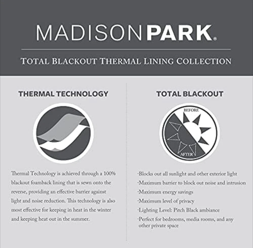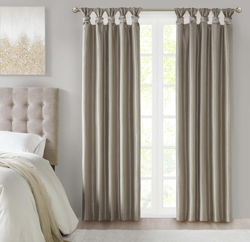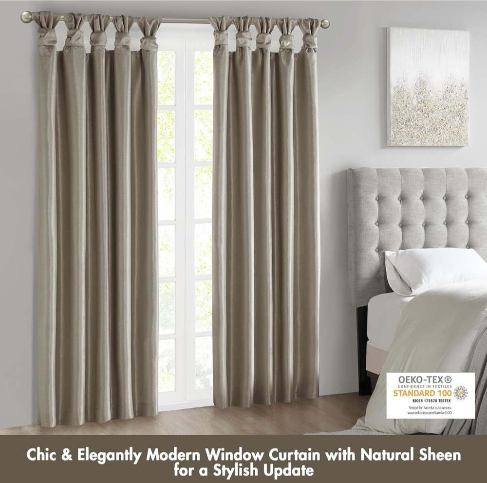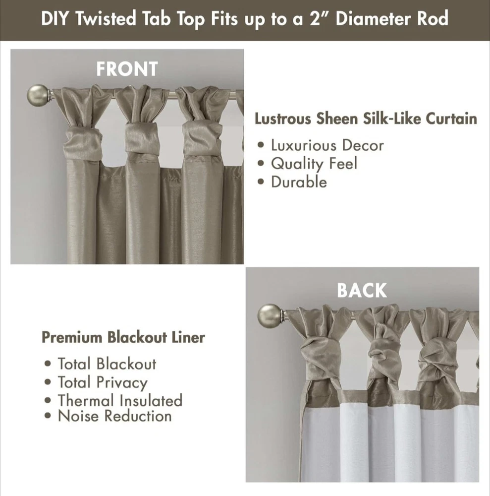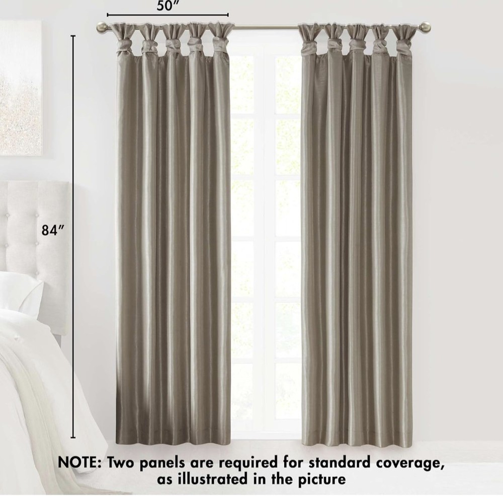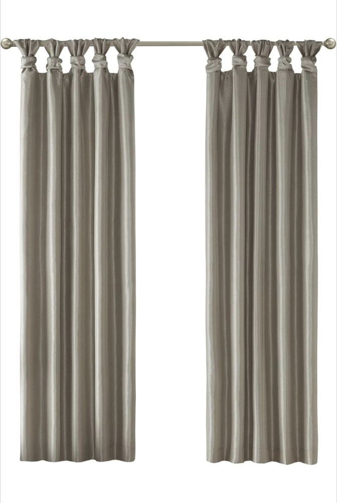 Madison Park Emilia Faux Silk Total Blackout Single Curtain with Privacy Lining, DIY Twist Tab Top, Window Drape for Living Room, Bedroom and Dorm, 84"L x 50"W, Pewter 100% Polyester Faux Silk, Polyester Lining NEW & TRENDY - Give your home a decorator’s touch with the Madison Park Emilia Window Curtain. Made from a faux silk fabric, this elegant window curtain features a DIY twist tab top. BLACKOUT - This living room blackout Curtain is finished with a heavy 3 pass foamback liner, this panel is 100% total blackout providing energy efficiency and total privacy. TWISTED TAB - This elegant bedroom window curtain features a DIY twist tab top finish that not only creates rich, deep folds for a professional look. 1 Window Curtain: 50"W x 84"L, as shown in image - Need to purchase 2 curtain Panel for each window for standard coverage. CARE - Machine wash cold on gentle cycle, tumble dry on low heat, wash alone, do not bleach
