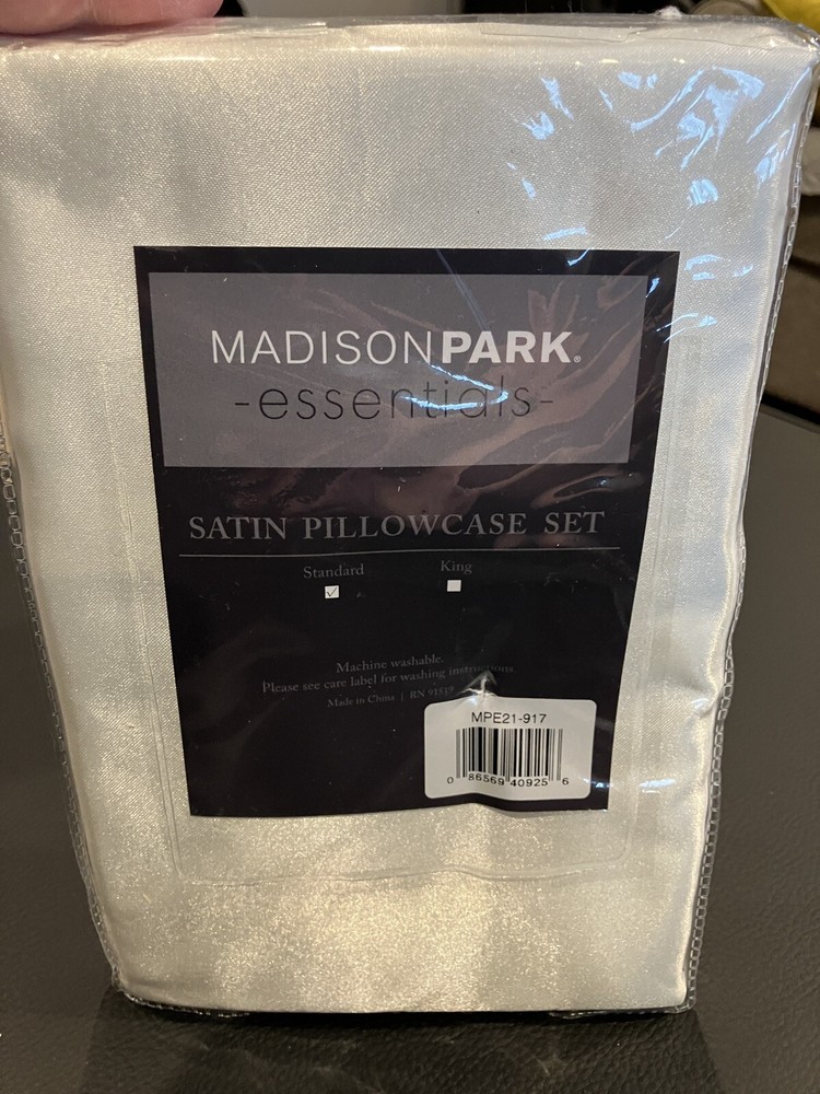 The Madison Park Essential Ivory Solid Satin Pillowcase 2-Pack Set includes two standard-sized pillowcases measuring 20 x 30 inches each. Made of polyester material, these pillowcases feature a luxurious satin texture in a solid ivory color, adding a touch of elegance to your bedroom decor. Perfect for enhancing your bedding ensemble, these pillowcases are from the Madison Park Essential brand, ideal for creating a cozy and stylish sleeping space.