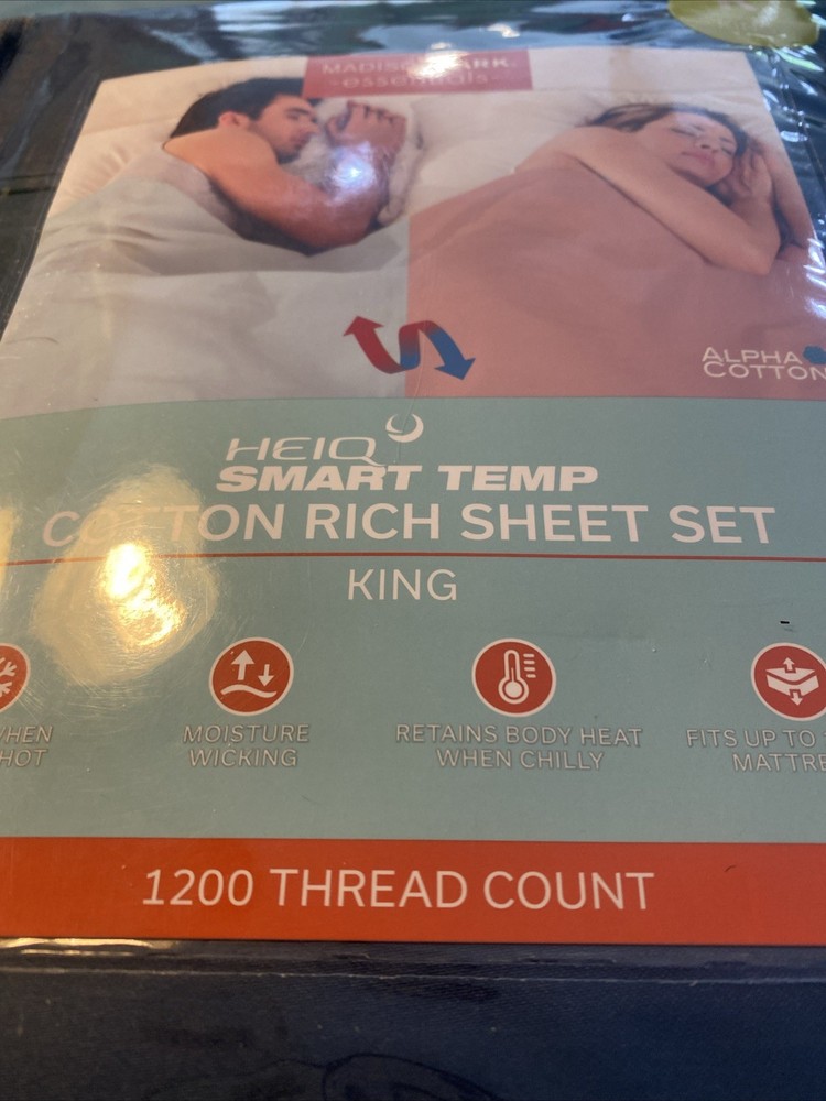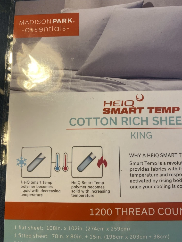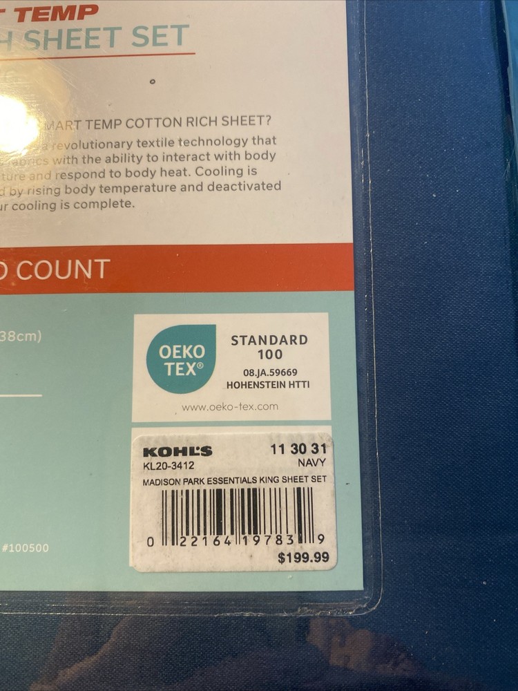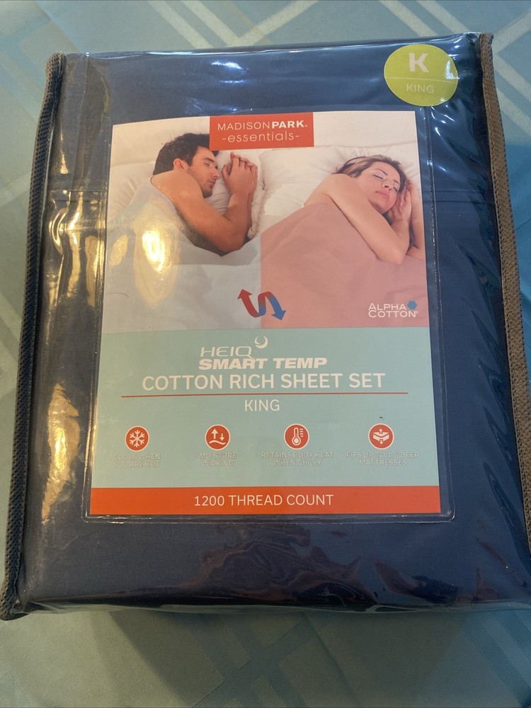 Madison Park Essentials 1200 Thread HEIQ Smart Temp King Sheet Set Navy 1 Flat sheet 1 Fitted sheet (up to 17” deep 2 King pillow cases...