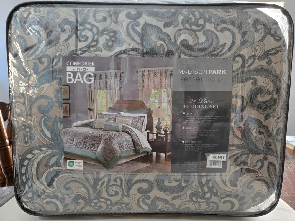 Madison Park Essentials Brystol Hypoallergenic King Comforter Set The Madison Park Essentials Brystol 24 Piece Room in a Bag provides a total makeover for your bedroom decor. This traditional comforter flaunts a teal and grey jacquard paisley pattern with an accenting solid teal border to create a luxurious glam look. Matching pillow shams and solid teal Euro shams with 2-inch flanges coordinate beautifully with the elegant comforter. A solid grey bed skirt and 4 decorative pillows with embroidery and pleating details add the finishing touches to this paisley bedding set. Polyester filling in the comforter and pillows contains no allergens and is treated to be dustproof. A 4 Piece sheet set is also included to complement the comforter and complete the jacquard bedding set. To elevate your bedroom, 4 solid teal window curtains with 2 paisley valances and 2 solid tiebacks are included to perfectly style your windows. Machine washable for easy care, this paisley comforter set may come in rolled or compressed packing and will need to be fluffed up. Use a steam iron to help remove wrinkles easier. Spot clean pillows. Brand: Madison Park Size: King Set Includes: 1 Comforter:104"W x 92"L 2 King Shams:20"W x 36"L (2) 1 Bedskirt:72"W x 84"L + 15"D 4 Decorative Pillows:16"W x 16"L/12"W x 18"L/12"W x 16"L/18"W x 18"L 2 Euro Shams:26"W x 26"L + 2"D (2) 1 Flat Sheet:108"W x 102"L 1 Fitted Sheet:72"W x 84"L + 14"D 2 King Pillowcases:20"W x 40"L (2) 4 Window Panels:42"W x 84"L (4) 4 Tie Backs:4"W x 23"L (4) 2 Valances:18"W x 54"L (2) Materials:100% Polyester Color: Blue 100% Polyester jacquard paisley embroidered dec pillows solid microfiber sheet set set includes: comforter, 2 shams, bedskirt, 2 euro shams, 4 dec pillows, flat sheet, fitted sheet, 2 pillowcases, 4 window panels, 4 tie backs, 2 valances 15" drop bedskirt fitted sheet fits up to 16" mattress polyester faux silk, jacquard, 8oz/sq yard polyester filling, polyester faux silk bedskirt, solid microfiber sheet set 1 Comforter:104"W x 92"L 2 King Shams:20"W x 36"L (2) 1 Bedskirt:72"W x 84"L + 15"D 4 Decorative Pillows:16"W x 16"L/12"W x 18"L/12"W x 16"L/18"W x 18"L 2 Euro Shams:26"W x 26"L + 2"D (2) 1 Flat Sheet:108"W x 102"L 1 Fitted Sheet:72"W x 84"L + 14"D 2 King Pillowcases:20"W x 40"L (2) 4 Window Panels:42"W x 84"L (4) 4 Tie Backs:4"W x 23"L (4) 2 Valances:18"W x 54"L (2) machine washable, spot clean pillows Madison Park Essentials 24-Pc Brystol Hypoallergenic King Comforter Set Click images to enlarge Description Madison Park Essentials Brystol Hypoallergenic King Comforter Set The Madison Park Essentials Brystol 24 Piece Room in a Bag provides a total makeover for your bedroom decor. This traditional comforter flaunts a teal and grey jacquard paisley pattern with an accenting solid teal border to create a luxurious glam look. Matching pillow shams and solid teal Euro shams with 2-inch flanges coordinate beautifully with the elegant comforter. A solid grey bed skirt and 4 decorative pillows with embroidery and pleating details add the finishing touches to this paisley bedding set. Polyester filling in the comforter and pillows contains no allergens and is treated to be dustproof. A 4 Piece sheet set is also included to complement the comforter and complete the jacquard bedding set. To elevate your bedroom, 4 solid teal window curtains with 2 paisley valances and 2 solid tiebacks are included to perfectly style your windows. Machine washable for easy care, this paisley comforter set may come in rolled or compressed packing and will need to be fluffed up. Use a steam iron to help remove wrinkles easier. Spot clean pillows. Brand: Madison Park Size: King Set Includes: 1 Comforter:104"W x 92"L 2 King Shams:20"W x 36"L (2) 1 Bedskirt:72"W x 84"L + 15"D 4 Decorative Pillows:16"W x 16"L/12"W x 18"L/12"W x 16"L/18"W x 18"L 2 Euro Shams:26"W x 26"L + 2"D (2) 1 Flat Sheet:108"W x 102"L 1 Fitted Sheet:72"W x 84"L + 14"D 2 King Pillowcases:20"W x 40"L (2) 4 Window Panels:42"W x 84"L (4) 4 Tie Backs:4"W x 23"L (4) 2 Valances:18"W x 54"L (2) Materials: 100% Polyester Color: Blue 100% Polyester jacquard paisley embroidered dec pillows solid microfiber sheet set set includes: comforter, 2 shams, bedskirt, 2 euro shams, 4 dec pillows, flat sheet, fitted sheet, 2 pillowcases, 4 window panels, 4 tie backs, 2 valances 15" drop bedskirt fitted sheet fits up to 16" mattress polyester faux silk, jacquard, 8oz/sq yard polyester filling, polyester faux silk bedskirt, solid microfiber sheet set 1 Comforter:104"W x 92"L 2 King Shams:20"W x 36"L (2) 1 Bedskirt:72"W x 84"L + 15"D 4 Decorative Pillows:16"W x 16"L/12"W x 18"L/12"W x 16"L/18"W x 18"L 2 Euro Shams:26"W x 26"L + 2"D (2) 1 Flat Sheet:108"W x 102"L 1 Fitted Sheet:72"W x 84"L + 14"D 2 King Pillowcases:20"W x 40"L (2) 4 Window Panels:42"W x 84"L (4) 4 Tie Backs:4"W x 23"L (4) 2 Valances:18"W x 54"L (2) machine washable, spot clean pillows Combined Shipping We charge full shipping & handling on the item with the highest shipping rate. Each additional items shipping & handling rate will be discounted 50% off. Please insert all items in the cart to show all applicable discounts. Items must be paid together to receive full discount Pictures sell! Auctiva offers Free Image Hosting and Editing. 300+ Listing Templates! Auctiva gets you noticed! The complete eBay Selling Solution.
