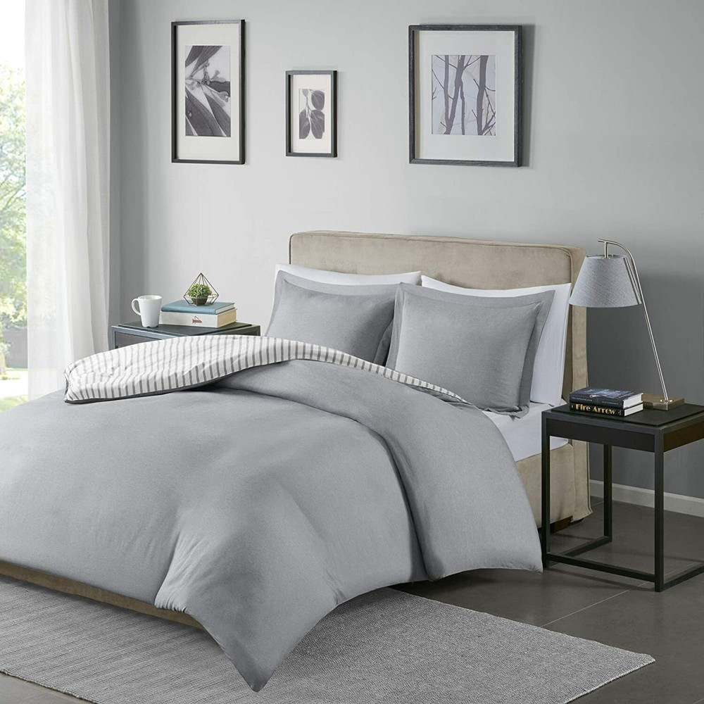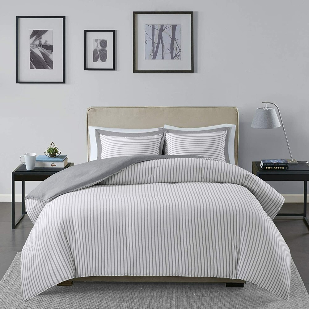 MADISON PARK ESSENTIALS HAYDEN REVERSIBLE DUVET COVER SET (King) New In Package The Madison Park Essentials Hayden Reversible Duvet Cover Mini Set gives your bedroom a fresh casual update. Sporting a grey striped pattern, the duvet cover and shams reverse to a solid grey allowing you to mix and match styles for the perfect look. Machine washable, this reversible duvet cover is made from yarn dyed fabric in a heathered print style that gives it an incredibly soft hand feel. Yarn Dye Fabric Heathered Print Style Soft Hand Feeling Duvet: Yarn Dye Stripe Poly Microfiber on Face, Yarn Dye Solid Poly Microfiber on Back, Sham: Yarn Dye Stripe Poly Microfiber on Face, Yarn Dye Solid Poly Microfiber on Back, 1 Duvet Cover:104" x 90" 2 King Shams:20" x 36" + 2" Machine Wash FEEDBACK Your Satisfaction Is My #1 Priority! If you are satisfied with your item, please provide positive feedback. But, if you are not fully happy with with the item you received, such as item damaged during shipping, delayed delivery, etc. PLEASE CONTACT ME FIRST before leaving feedback and we will work together to resolve the problem. Thank You! Tina