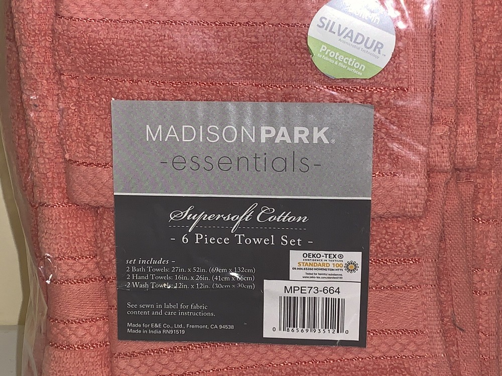 Madison Park Essentials 6 Pc Bath Set Coral Quick Dry Super Soft Cotton Set includes 2 of each: Measurements are Bath Towels 27" x 52" Hand Towels 6" x 26" Face Cloths12"W x 12"L Machine washable for easy care New in sealed package, smoke free home.