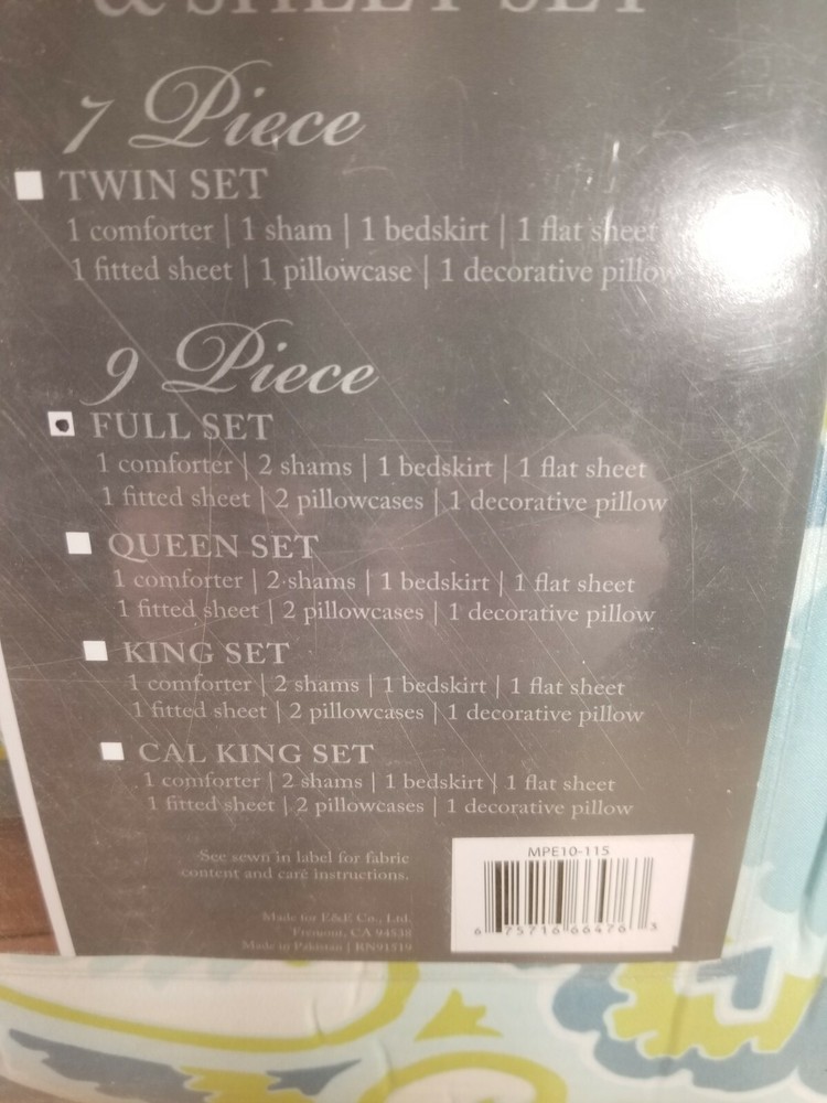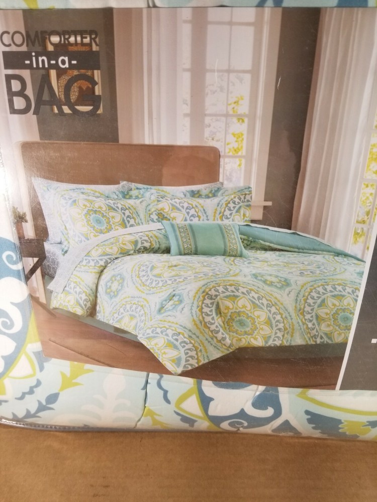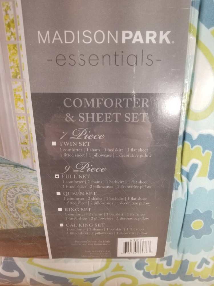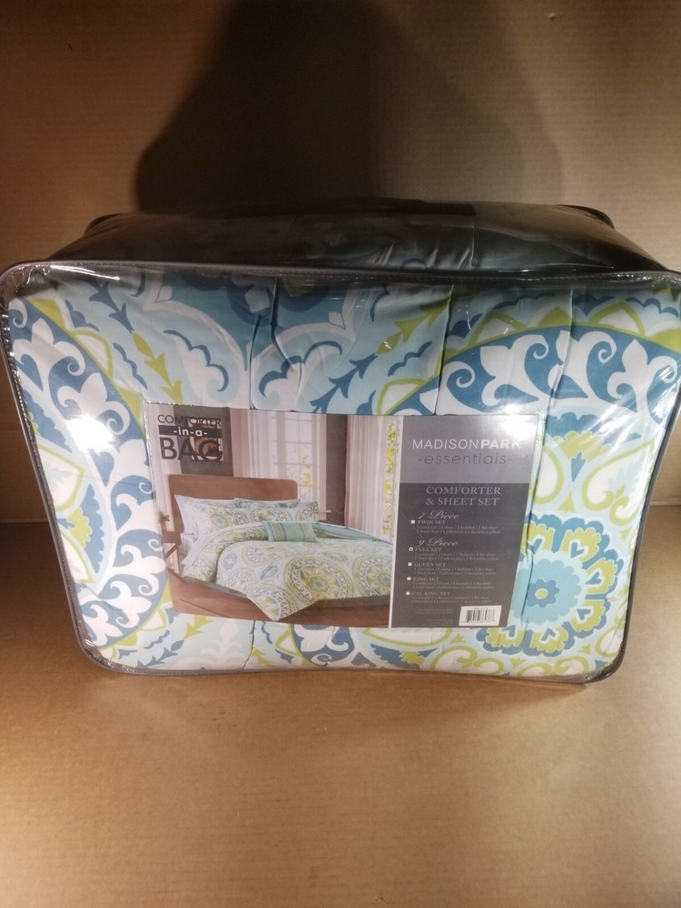 Madison Park Essentials Cozy Bag Comforter, Medallion Damask Design All Season Down Alternative Complete Sheet Set, Bed Skirt, Full(78"x86"), Serenity Aqua, 9 Piece About this item 100% Microfiber Madison Park Essentials Serenity Complete Bed In a Bag can provide a whole new look with warm colors. An intricate medallion pattern of damask design complemented with subtle color contrast for calming ambiance Microfiber fabric is a really soft fabric that is naturally wrinkle and shrinkage resistant. Set includes: 1 Comforter: 78"W x 86"L, 2 Standard Shams: 20"W x 26"L + 2"D, 1 Bed Skirt: 54"W x 75"L + 15"D, 1 Flat Sheet: 81"W x 96"L, 1 Fitted Sheet: 54"W x 75"L + 14"D, 2 Standard Pillowcases: 20"W x 30"L + 2"D, 1 Decorative Pillow: 12"W x 18"L Care instructions: machine wash cold, gentle cycle, and separately. Do not bleach. Tumble dry low, remove promptly, do not iron. If there is no free movement in the washer or dryer, use large capacity commercial washer/dryer. The Madison Park Essentials Serenity Complete Comforter and Cotton Sheet Set provides a fresh globally inspired look for your bedroom. An intricate medallion pattern repeats across the top of bed in brilliant shades of complementary colors to play up the oversized print. An oblong pillow uses decorative embroidery and piecing to create texture on the top of bed. Also included is a complete cotton sheet set that features a coordinating medallion print to complete the look. This bedding set is also OEKO-TEX certified, meaning it does not contain any harmful substances or chemicals, ensuring quality comfort and wellness. We will try to describe them to the best of our ability. Any glaring damage will be disclosed. Our listings provide as much detail as possible in the description including information to assist our customers. We take our customer service very seriously, so if for any reason you are not satisfied with your purchase. Please contact us immediately before opening a return or eBay case. We will work with you to resolve the issue as quickly as possible. We love getting feedback and we enjoy giving it. Your satisfaction is the greatest reward for us and we do our best to meet our customers' needs. Please do not leave negative or neutral feedback before first allowing us the opportunity to resolve your problem. SHIPPING Please note that tracking/confirmation numbers are not good until the package has been scanned in by USPS and the information posts to their website. This can take up to 24 to 48 hours after you have received your shipping confirmation.